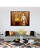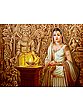 Wearing the color of pure devotion, white, the Bhaktin (female devotee) stands in the sacred hall of an ancient temple. In the light of the Diya (ritual lamp) she lit, we can appreciate the divine carvings of the temple, showing a male deity holding trident, discus, and conch and a goddess in Lalitasana (royal posture). Details of secondary gods and goddesses deepen the aesthetic quality of the oil painting. Surrounded by these images of godliness, the lady holds a basket of colorful flowers, to be offered in the inner sanctum.