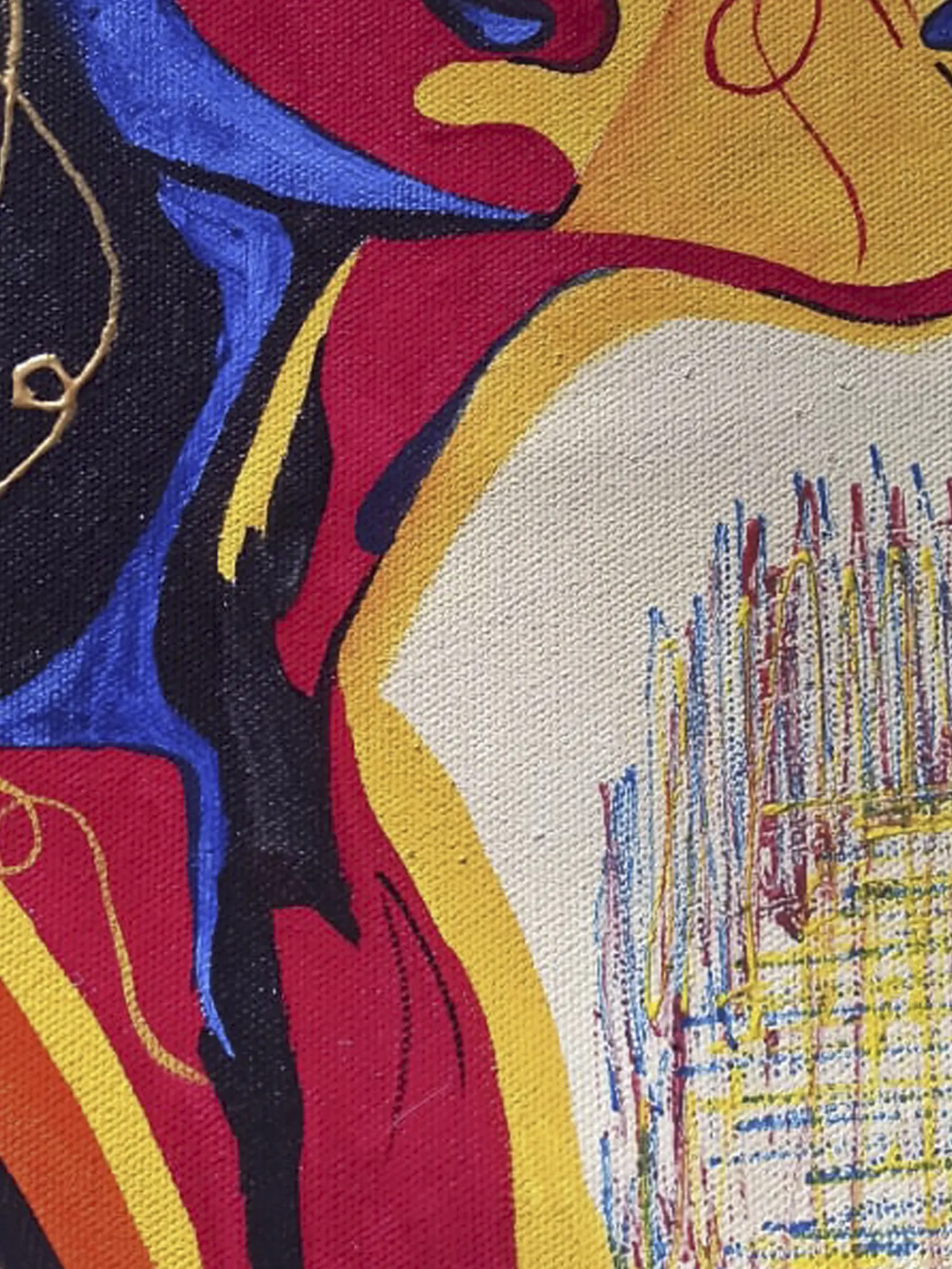 You'll appreciate the striking juxtaposition of bold, flowing lines with energetic, textured backgrounds. The artist’s use of a rich, emotive color palette – deep blues, vibrant reds, and warm yellows – creates a powerful visual language. Subtle accents of gold add a touch of opulence, catching the light and drawing the eye to intricate details, particularly in the elaborate rendering of hair. The piece measures 14 inches in height and 12 inches in width, a size that commands attention without overwhelming your space.