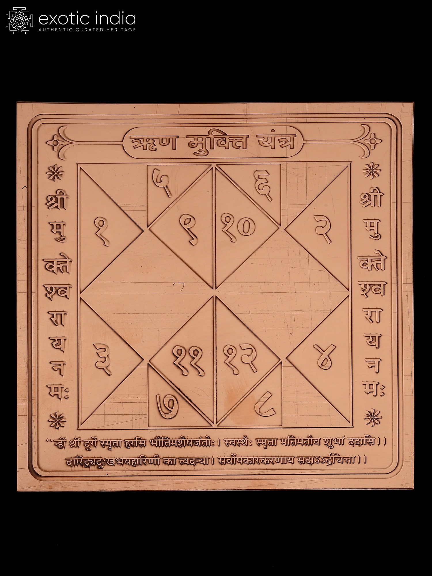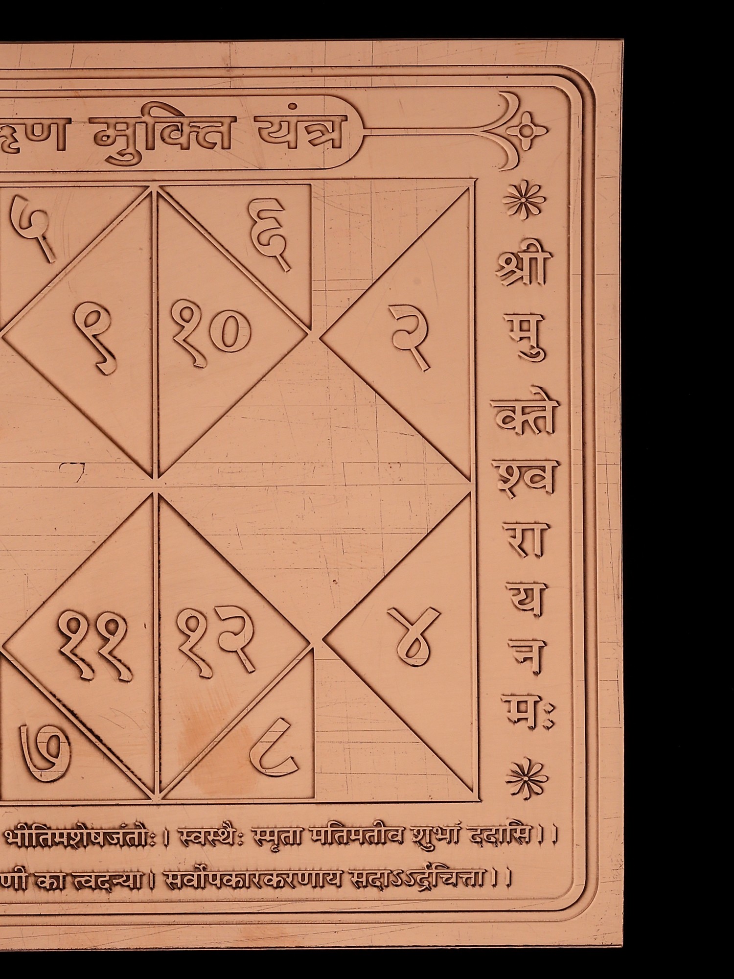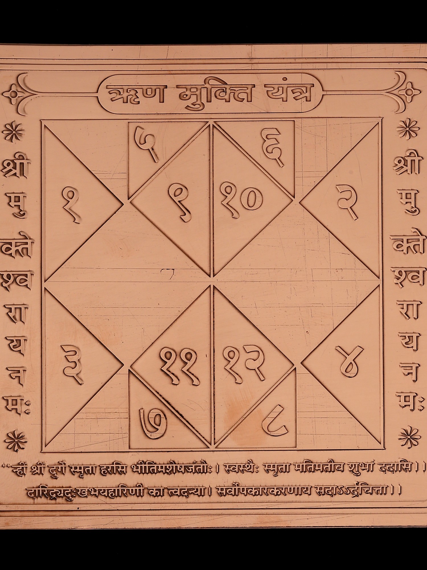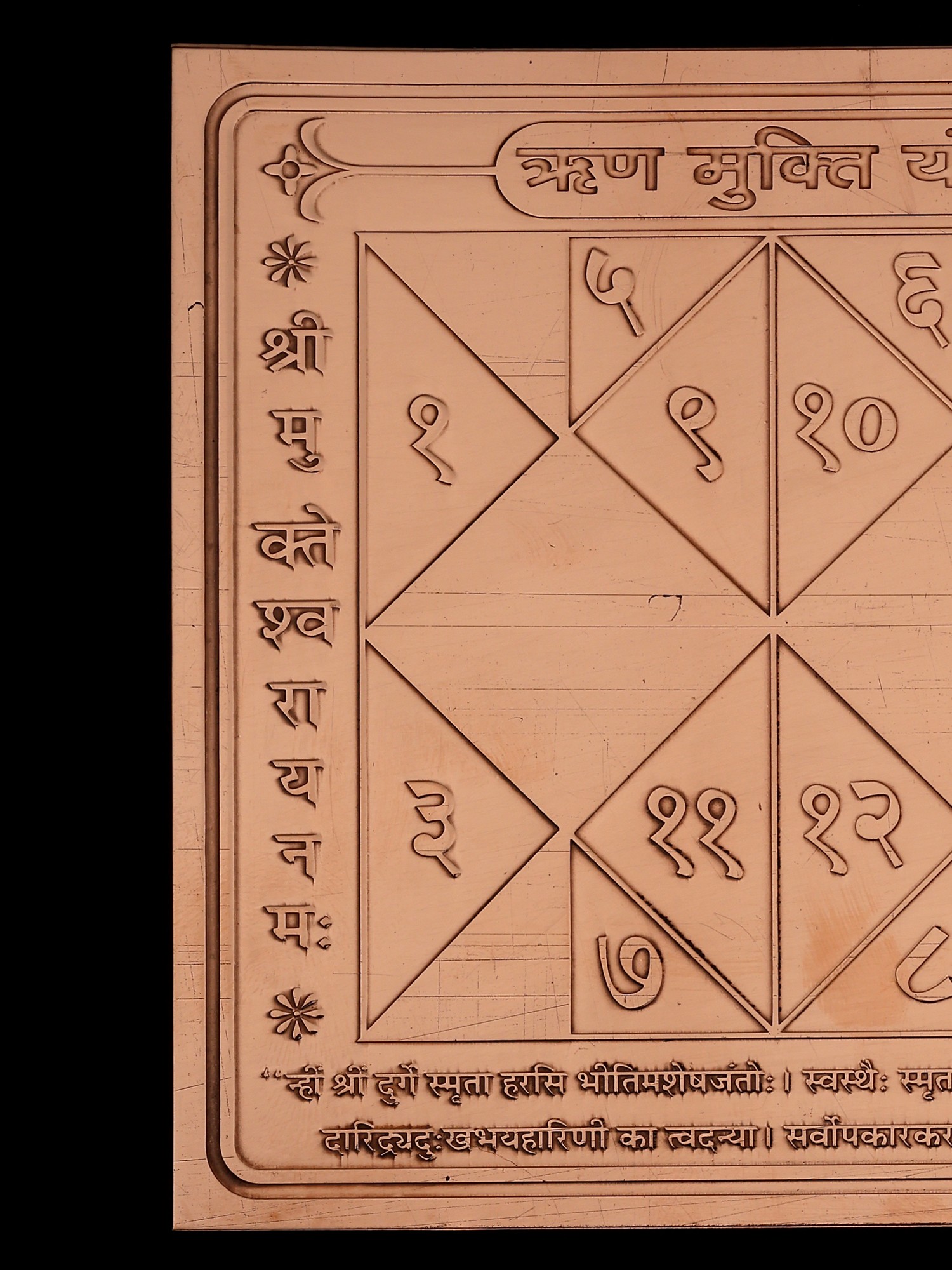 Signifying the path to financial liberation and freedom from debts, this Yantra invokes the blessings of deities associated with wealth and prosperity, such as Goddess Lakshmi, Lord Ganesha, and Lord Kubera. This Yantra, inscribed with devotion on a copper plate, has the power to harness positive energies and channel them towards the alleviation of financial burdens. Devotees use this Yantra in rituals to seek divine assistance in managing and clearing debts. It is a powerful tool for individuals seeking financial stability and a debt-free life while fostering a deeper connection with their spiritual beliefs.