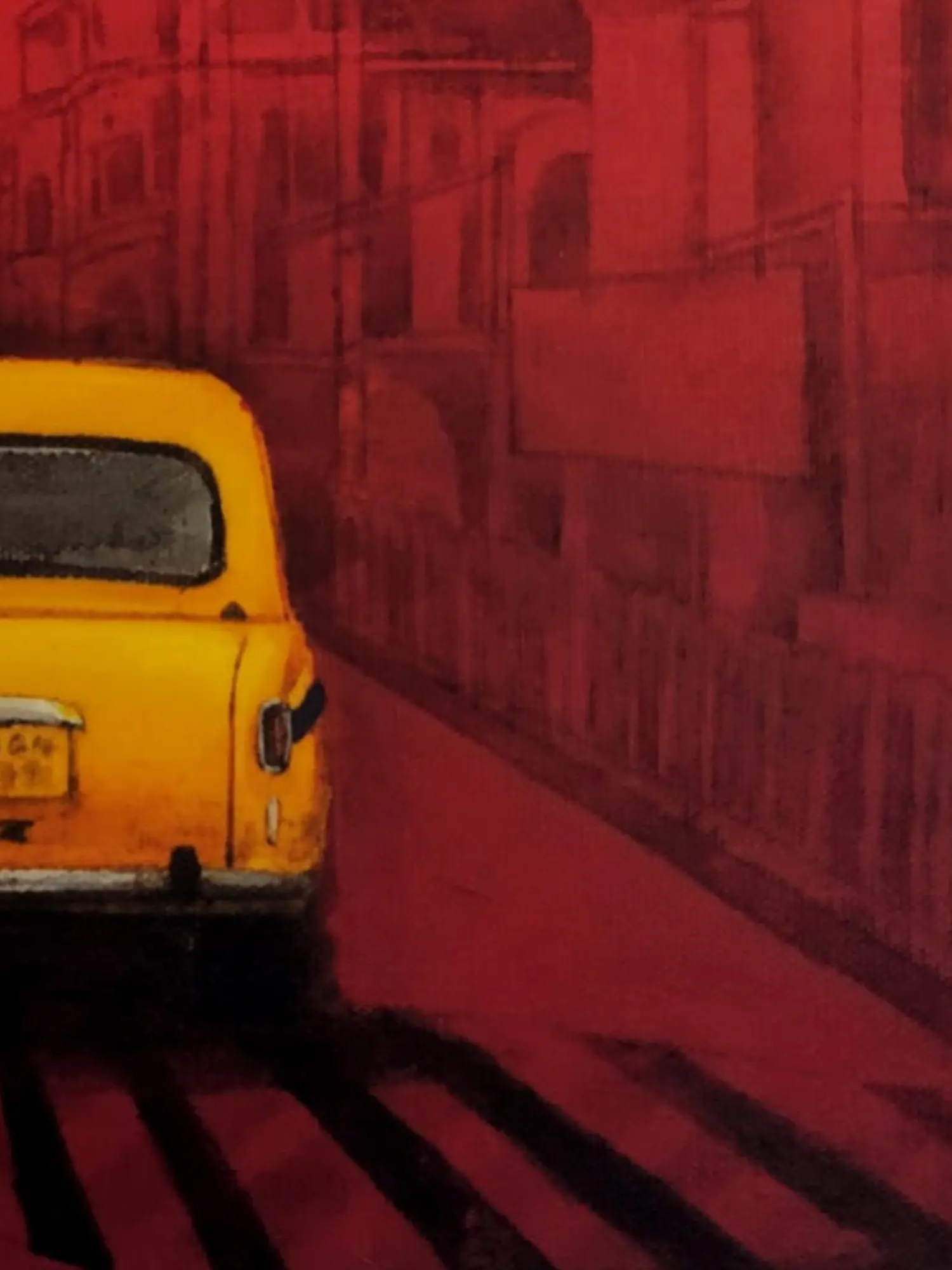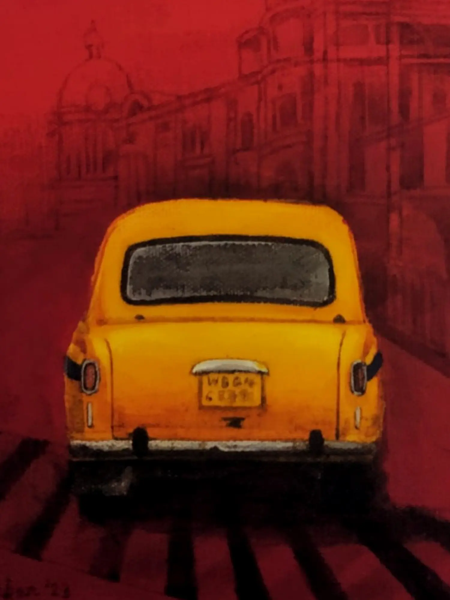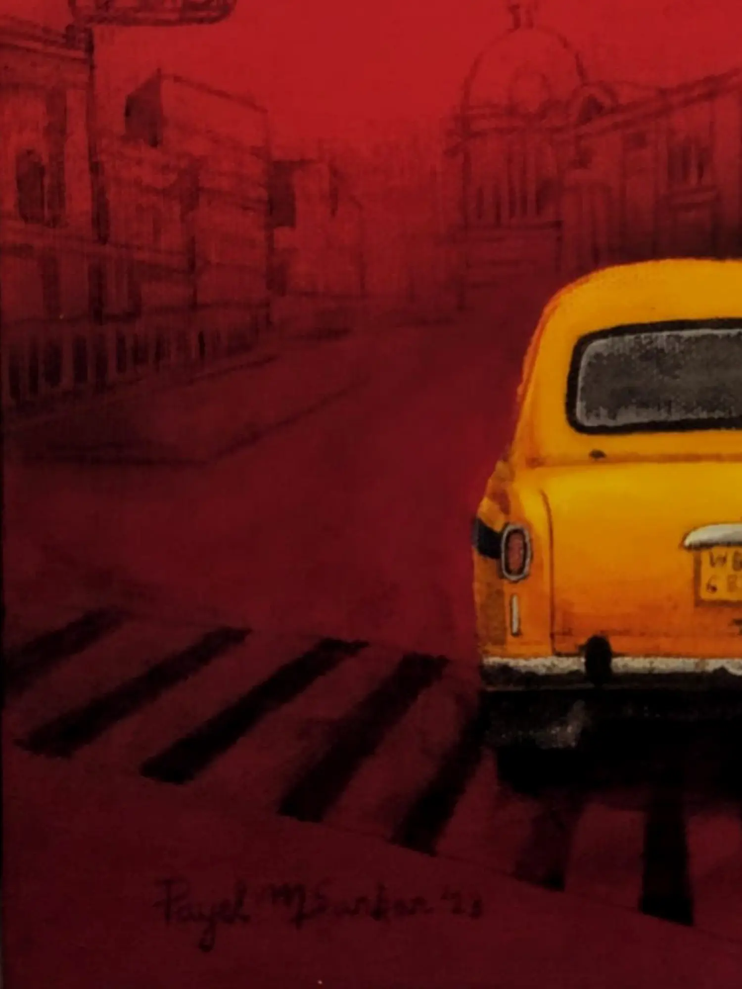 Payel Mitra's artistic skill is evident in the precise rendering of the taxi and its surroundings. The contrast between the bold yellow of the vehicle and the deep red of the city background creates a visually arresting piece. The use of acrylics allows for a vibrant and luminous effect, capturing the dynamic energy of Kolkata's streets. Mitra's painting isn't merely a reproduction of reality; it's an interpretation, an emotional response to the city's energy and character. It’s a thoughtful composition that captures a fleeting moment in time, frozen to be admired and cherished. The perspective, showing the back of the taxi, adds an intriguing element. It invites the viewer to imagine the journey the taxi and its passengers are undertaking, allowing for personal reflection and connection with the artwork.