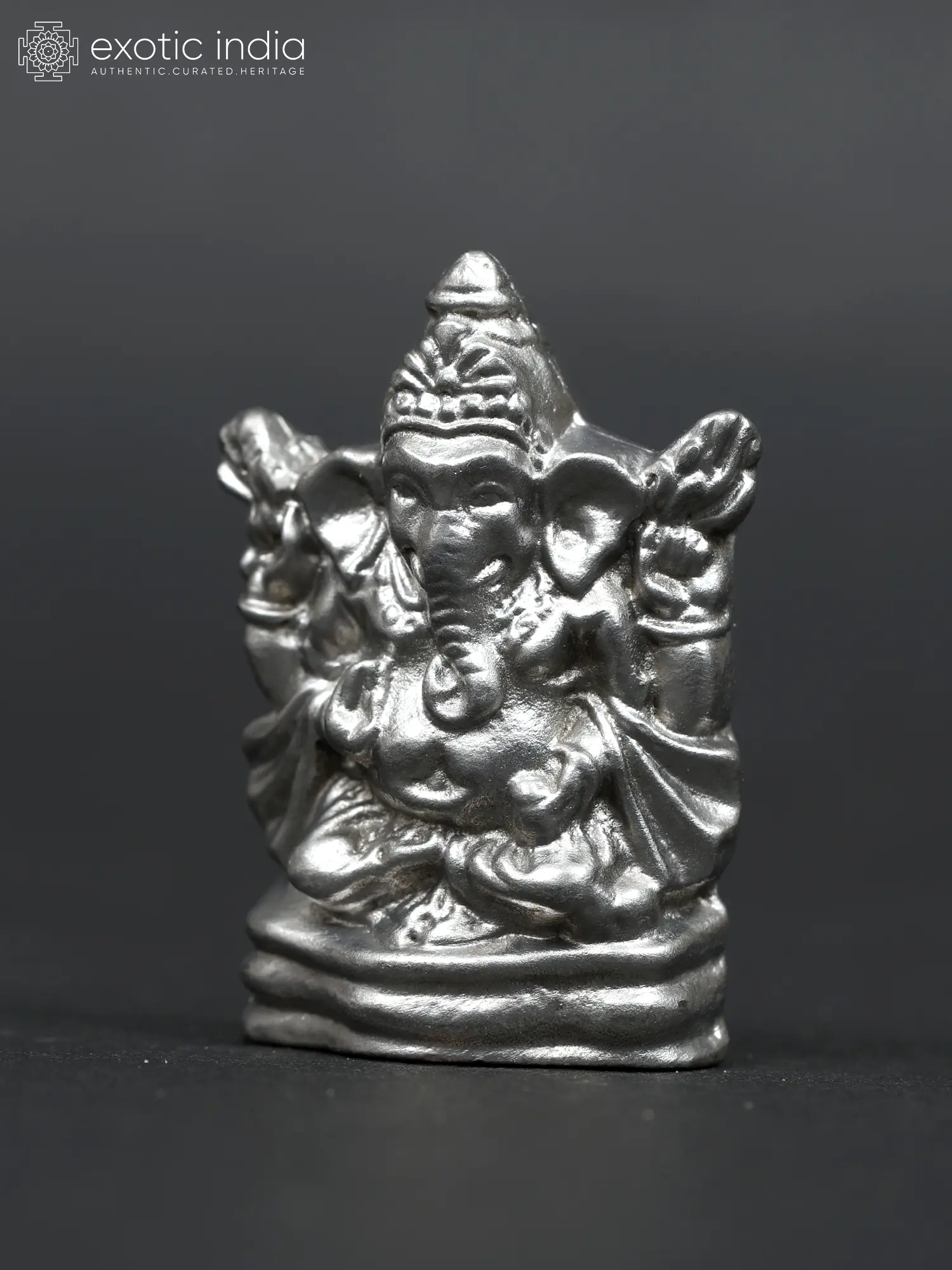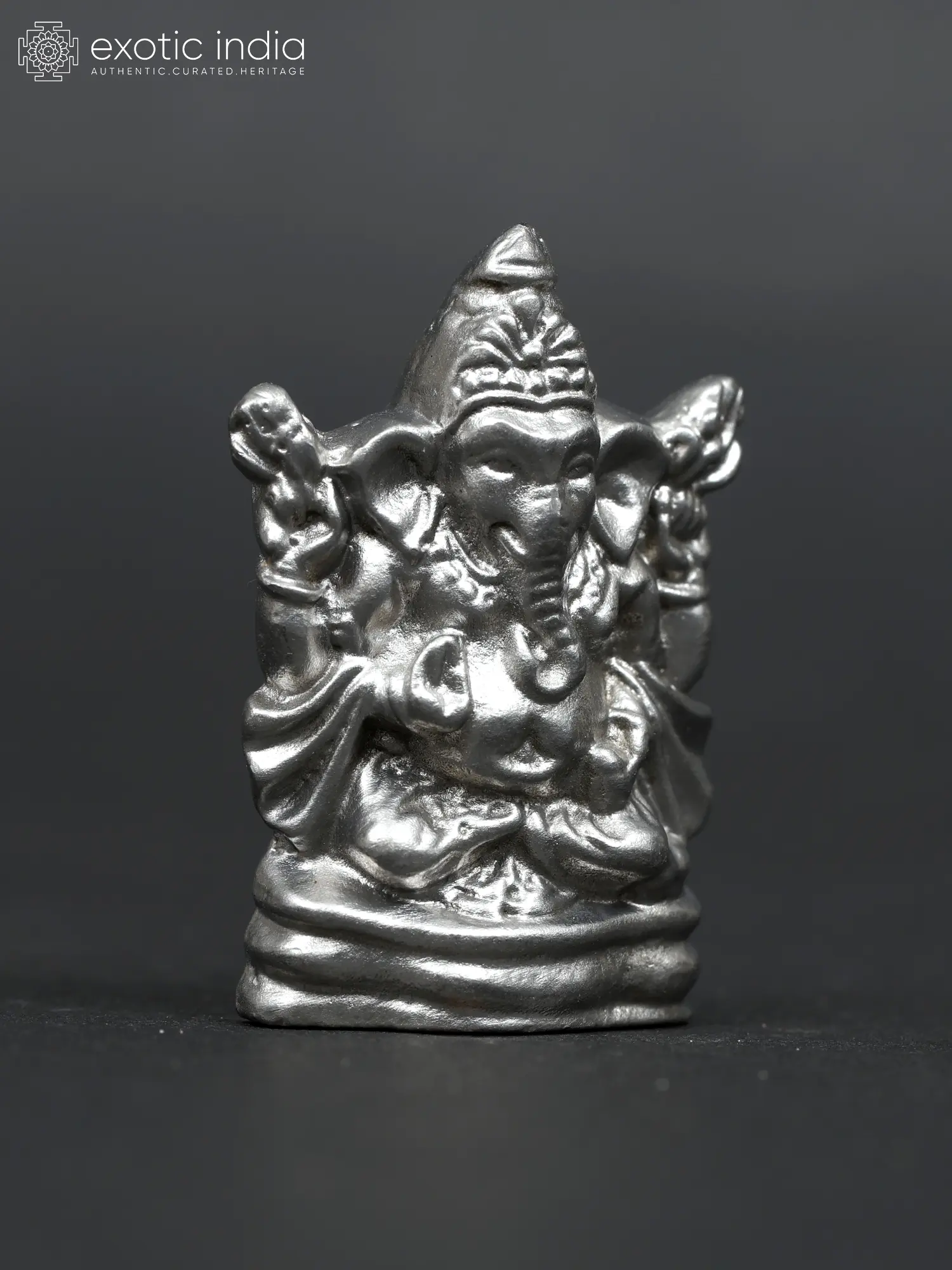 This exquisite statue captures the benevolent visage of Lord Ganesha, the beloved elephant-headed deity revered as the remover of obstacles and the bestower of good fortune. Rendered in lustrous mercury, this miniature representation of Chaturbhuja Ganesha, meaning "Ganesha with Four Arms," is a testament to intricate craftsmanship and spiritual devotion. The four arms symbolize his divine power and omnipresence, each typically holding symbolic objects like an axe to sever attachments, a noose to capture obstacles, a laddoo (sweet) for rewards, and a lotus flower representing purity and spiritual enlightenment.