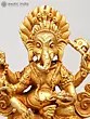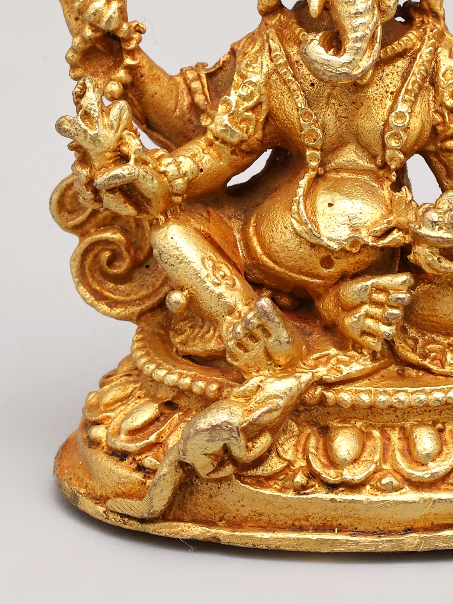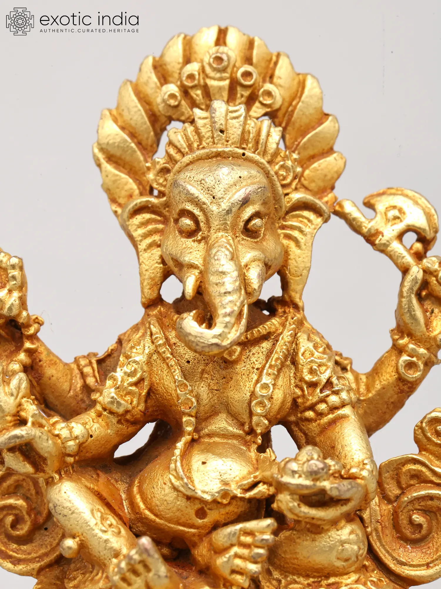 The depiction showcases Ganesha with his characteristic elephantine head and multiple arms, each carrying symbolic implements. You'll appreciate the divine aura emanated by the intricately carved crown and the opulent jewelry adorning the deity. The rich texture and radiant finish of the gilded copper highlight the fluidity of the form, creating a truly mesmerizing visual experience.