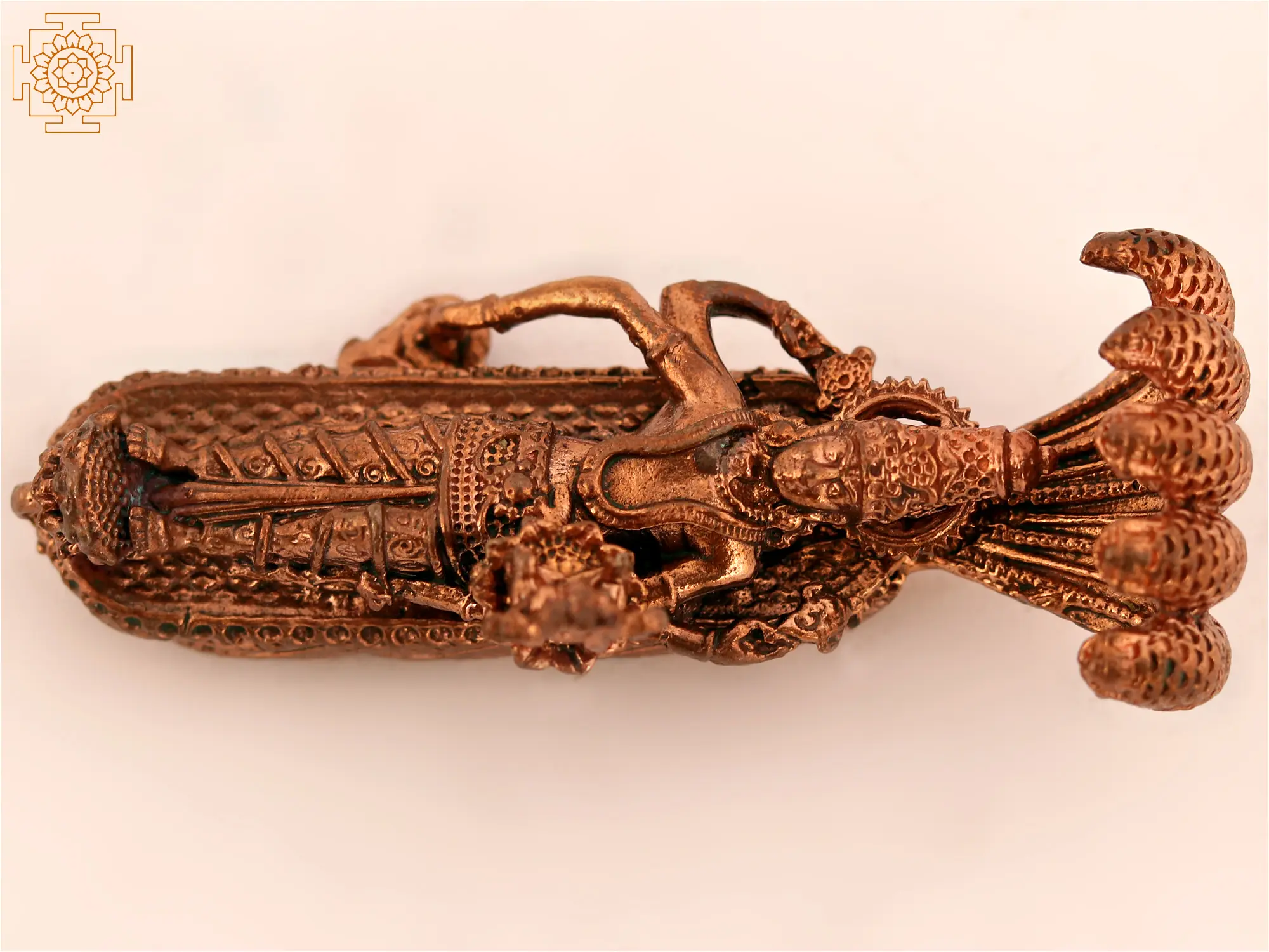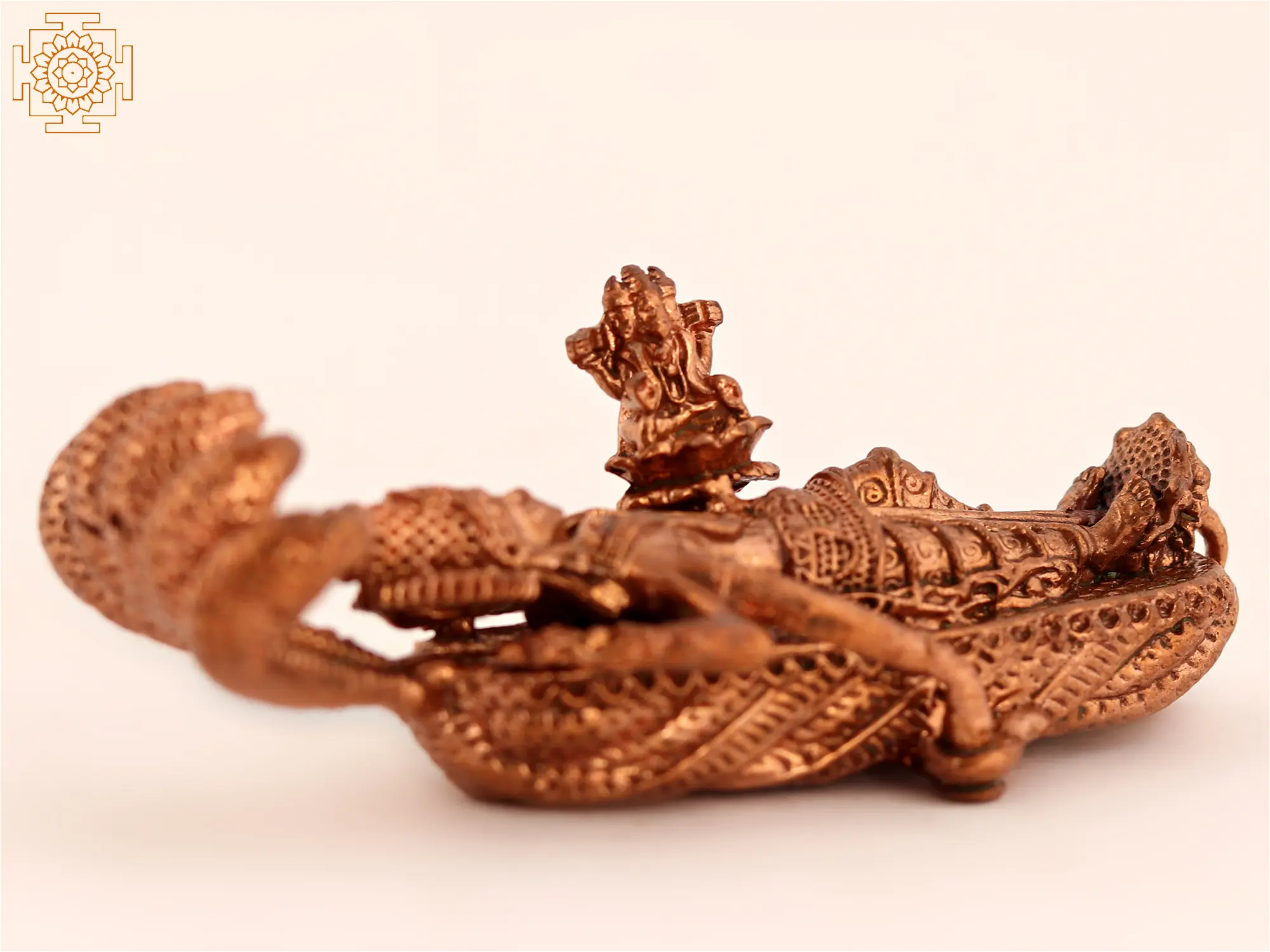 Copper, or Tamra, a pure metal, has long been utilised to create statues of Gods and Goddesses. The usage of this metal ensures the durability of the statue and the accumulation of positive energy into it. This copper Padmanabhaswamy (Vishnu) statue exemplifies boundless existence with grace. Lord Padmanabhaswamy is a portrayal of Lord Vishnu who is reclining on a bed created by Shesha Naga by coiling itself. Goddess Laxmi can be seen seated close to him. This picture of Lord Vishnu and Goddess Laxmi is highly regarded throughout the country. Keeping this statue in your personal worship space and worshipping it will assure the inflow of positive feelings as well as the deity's blessings.