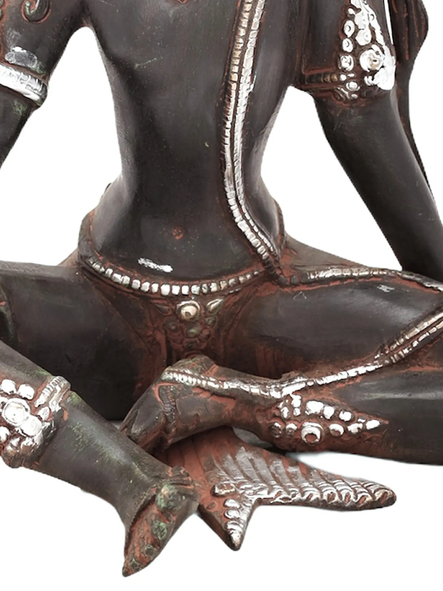 This exquisite brass statue captures Lord Indra, the king of the gods in Hindu mythology, in a moment of profound contemplation. Seated in a relaxed yet regal posture, his head is gently bowed, conveying a sense of deep thought or humility. The rich, dark patina of the brass is accentuated by the intricate detailing and the subtle silver inlay work that adorns his elaborate headdress, necklaces, armbands, and anklets. Each element, from the delicate patterns on his garment to the serene expression on his face, speaks to the mastery of the artisan who brought this divine form to life.