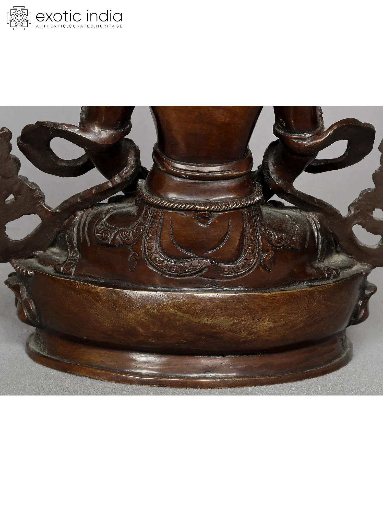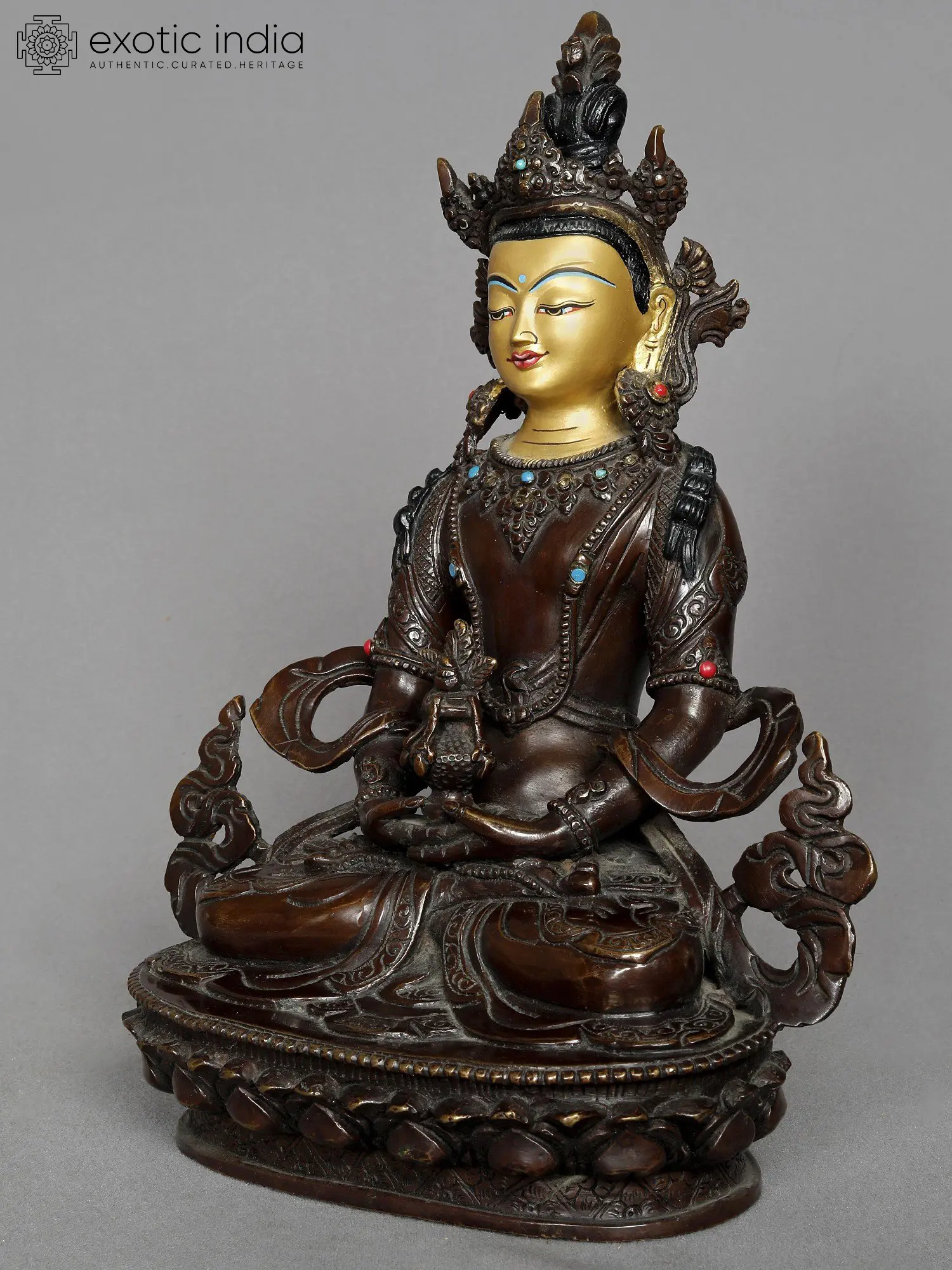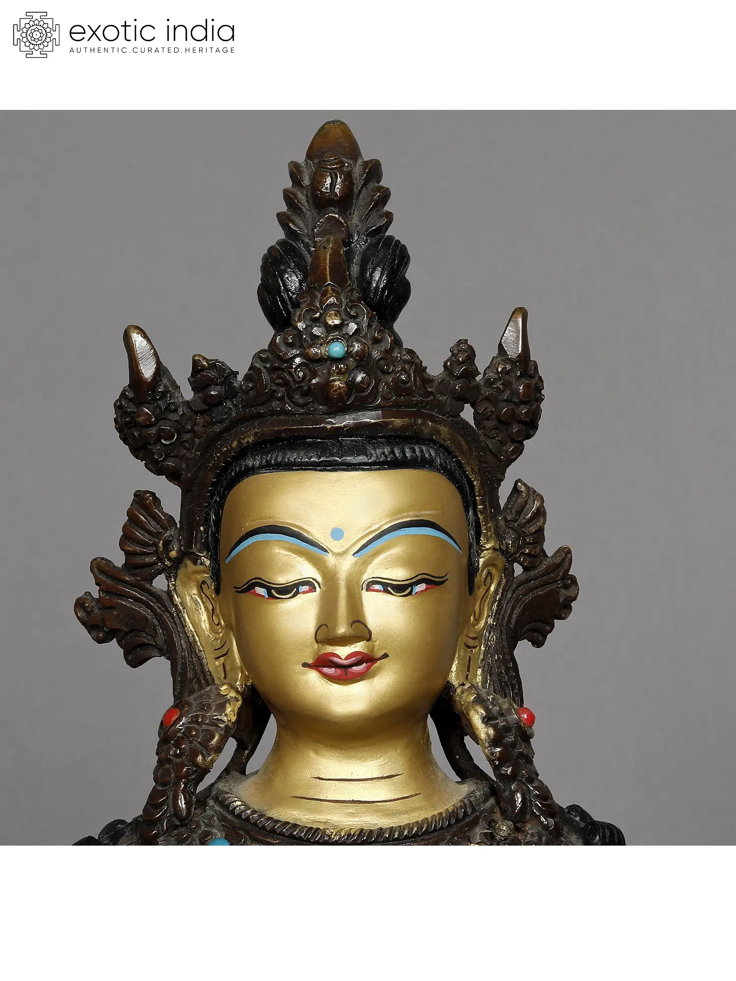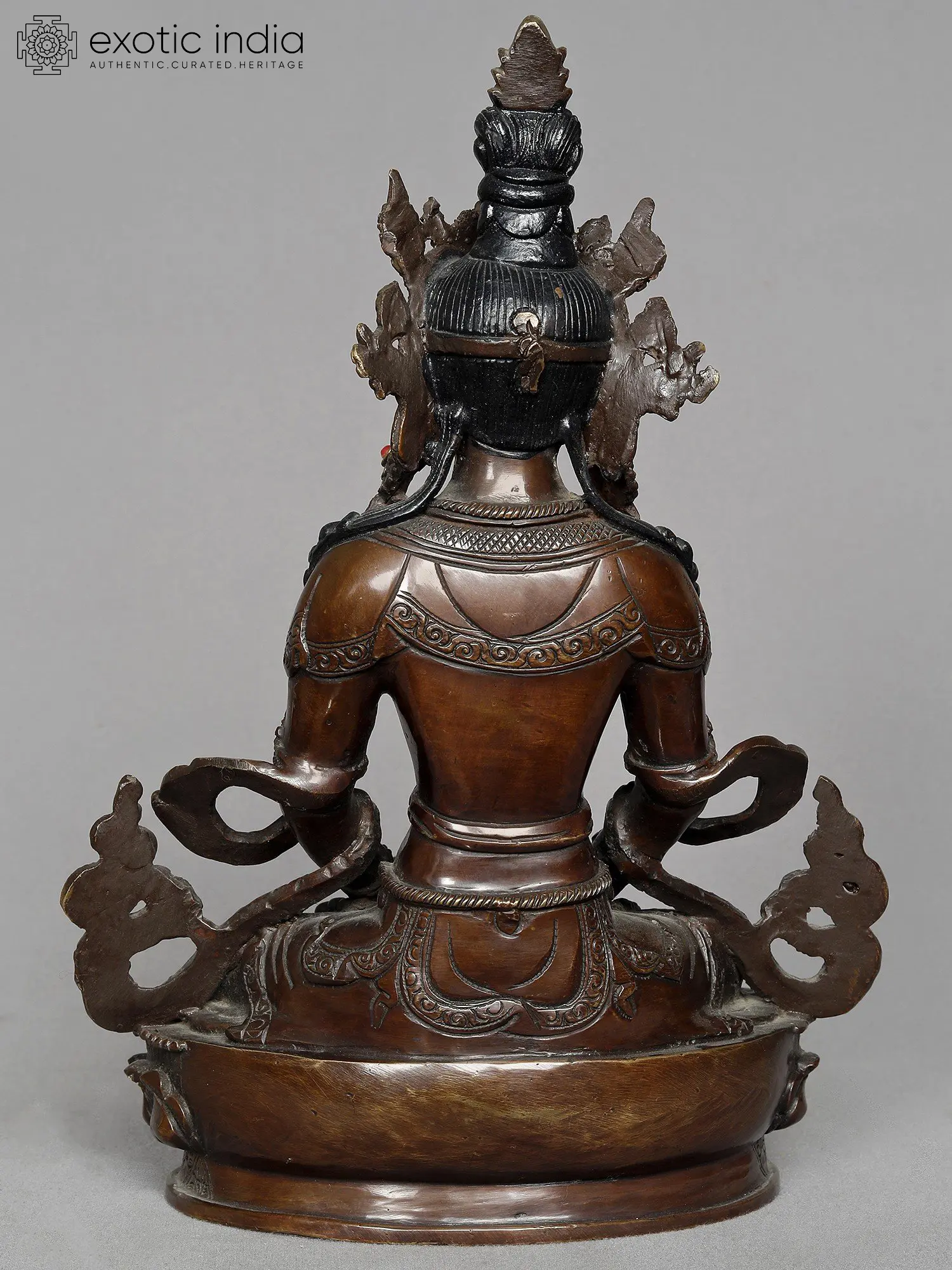 An exemplary artwork from Nepal infused with the beauty of copper sculpting and turquoise stone embellishment, this statue of Aparmita is revered for the positive impact she brings to her devotees' lives. Aparmita is also known as Amitayus and the deity of long life. Amitayus is seated gracefully in the padmasana on a lotus pedestal with his right leg on the top of his left. He is depicted in life-affirming waters from the pot and heavenliness in Aparmita’s eyes brings an awe-inspiring richness to this Nepalese statue.
