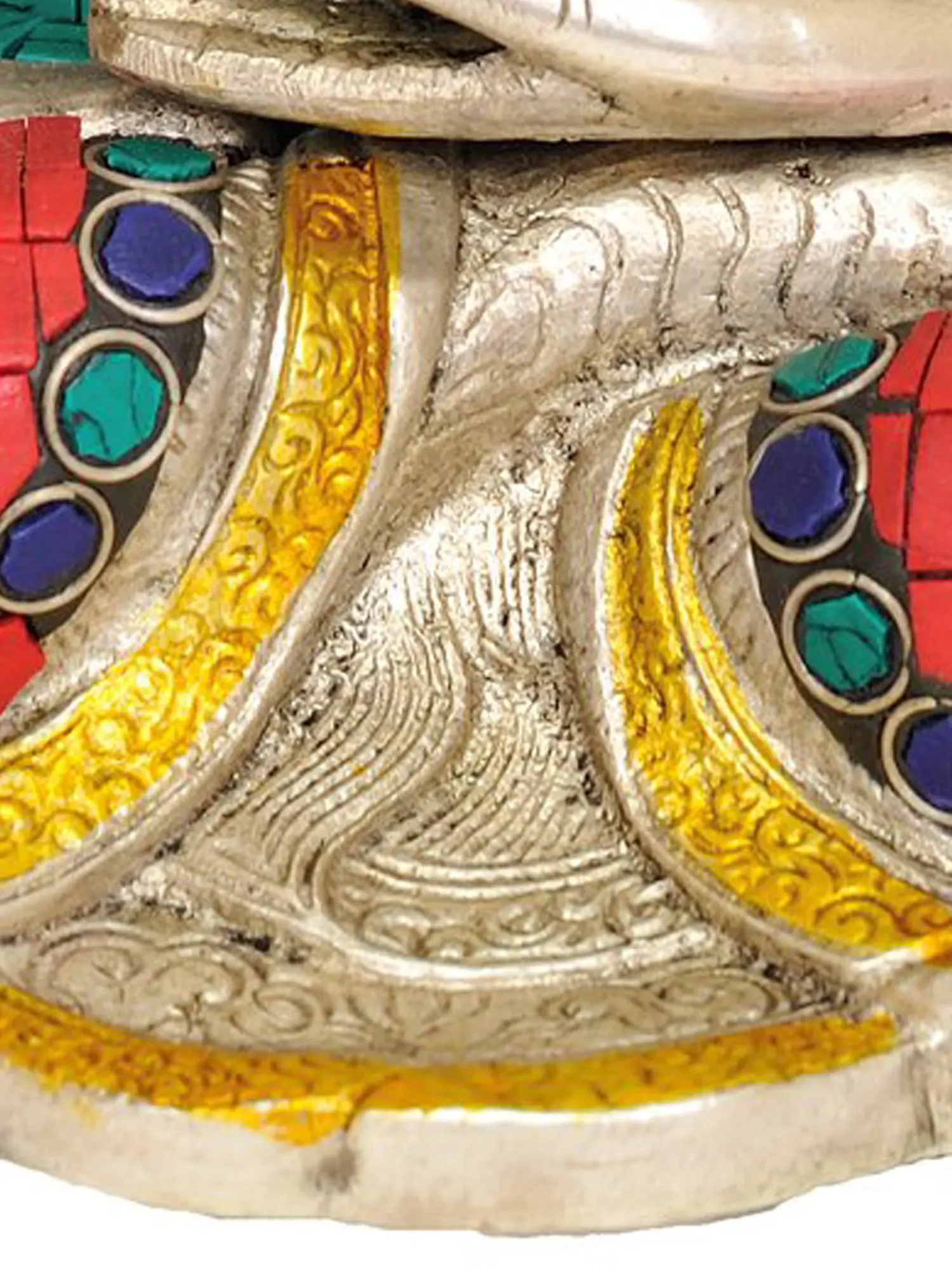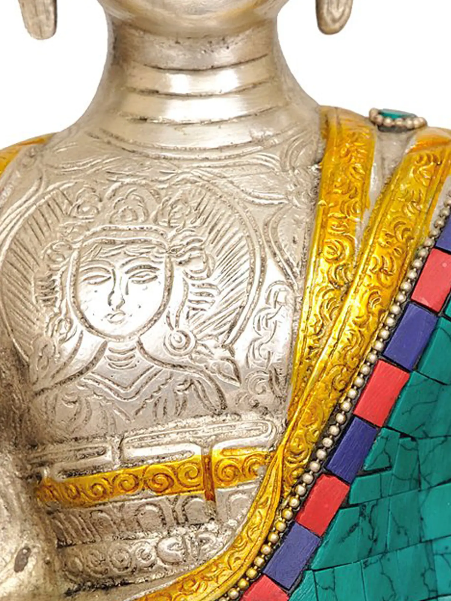 This exquisite brass statue captures the benevolent essence of the Buddha in a posture of profound blessing. Seated in the traditional lotus position, the figure emanates an aura of peace and spiritual enlightenment. The cool, metallic sheen of the brass serves as a perfect canvas for the vibrant inlay work that adorns its robes and base. These meticulously placed tesserae of turquoise, coral, and lapis lazuli are not merely decorative; they are imbued with symbolic significance, reflecting the rich tapestry of Buddhist philosophy and art. Turquoise, often associated with the sky and the ocean, signifies wisdom and healing. Coral, vibrant and energetic, represents life and vitality. Lapis lazuli, a stone revered since antiquity for its celestial blue hue, symbolizes the heavens and spiritual insight.