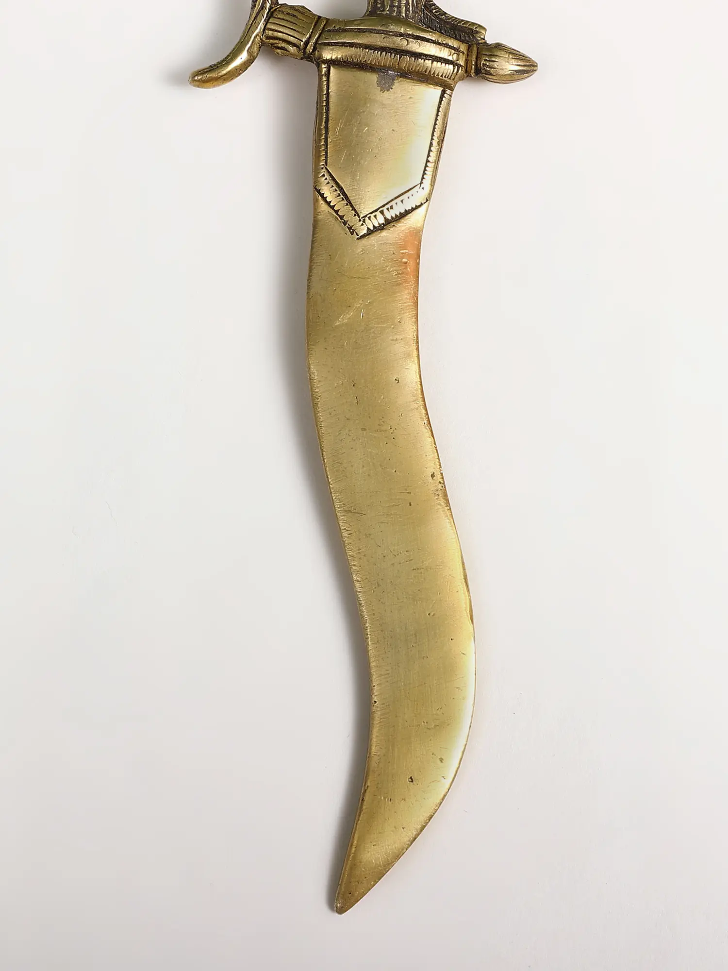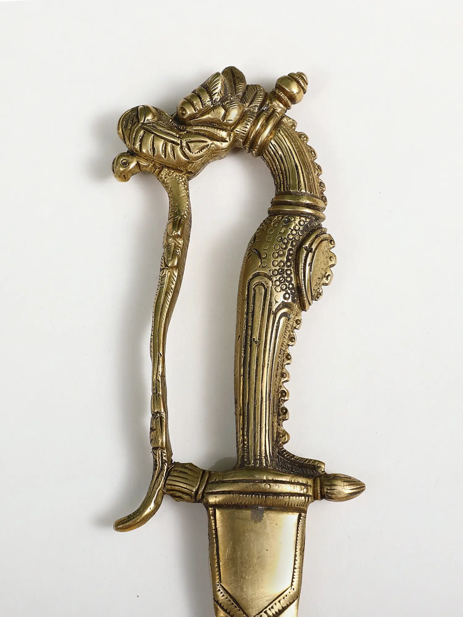This exquisite brass dagger is more than just an artifact; it's a testament to ancient artistry and the enduring power of mythical creatures. Crafted from lustrous brass, its form evokes the majestic dragon, a creature deeply ingrained in the lore and symbolism of many cultures. Dragons have long been revered as symbols of strength, wisdom, prosperity, and good fortune. In various mythologies, they are depicted as guardians of treasures, bringers of rain, or celestial beings that traverse the heavens. This dagger captures that potent essence, its design radiating an aura of ancient power.