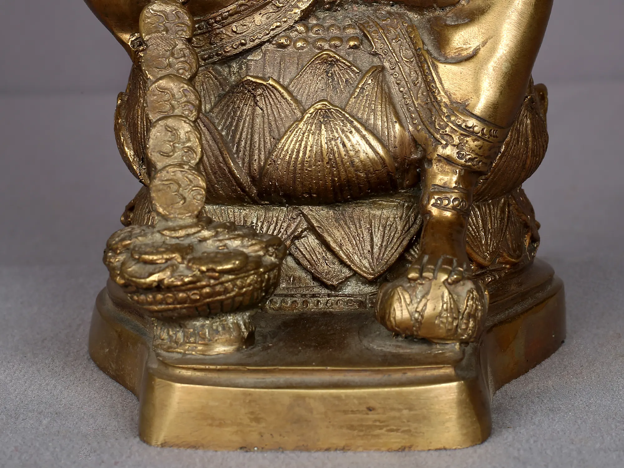 Invite the divine blessings of prosperity, wealth, and auspiciousness into your home with this exquisite brass statue of Goddess Lakshmi, meticulously crafted in Nepal. This captivating representation of the Hindu goddess of fortune embodies grace and abundance, making it a perfect centerpiece for your spiritual practice or a statement piece for your decor. The statue depicts Goddess Lakshmi seated serenely upon a lotus throne, a symbol of purity, beauty, and spiritual enlightenment. Her radiant form is adorned with intricate details, showcasing the artistry and devotion poured into its creation. She is shown with four arms, each holding significant symbolism. In two hands, she gently holds blooming lotuses, representing creation, fertility, and spiritual awakening. Her other hands are held in the *abhaya mudra* and *varada mudra*, gestures of fearlessness and bestowal of boons, respectively, signifying her protective and benevolent nature. Legends speak of Lakshmi's origin from the churning of the cosmic ocean, the Samudra Manthan, where she emerged, radiant and beautiful, choosing Lord Vishnu as her eternal consort. She is also associated with the sun god Surya and is revered as the mother of prosperity and well-being. In Hindu tradition, she is invoked during festivals like Diwali, the festival of lights, to invite wealth and happiness for the coming year. This statue captures that divine essence, radiating an aura of peace and abundance. The rich, warm patina of the brass lends a timeless elegance to this statue. The skilled artisans of Nepal, renowned for their traditional craftsmanship, have brought forth a divine visage with remarkable clarity and detail. From the delicate ornamentation of her attire to the serene expression on her face, every element speaks of a deep understanding of sacred iconography. This statue is not merely an object; it is a vessel for devotion, a conduit for blessings, and a beautiful testament to centuries of artistic heritage. ––––––––––––––––––––