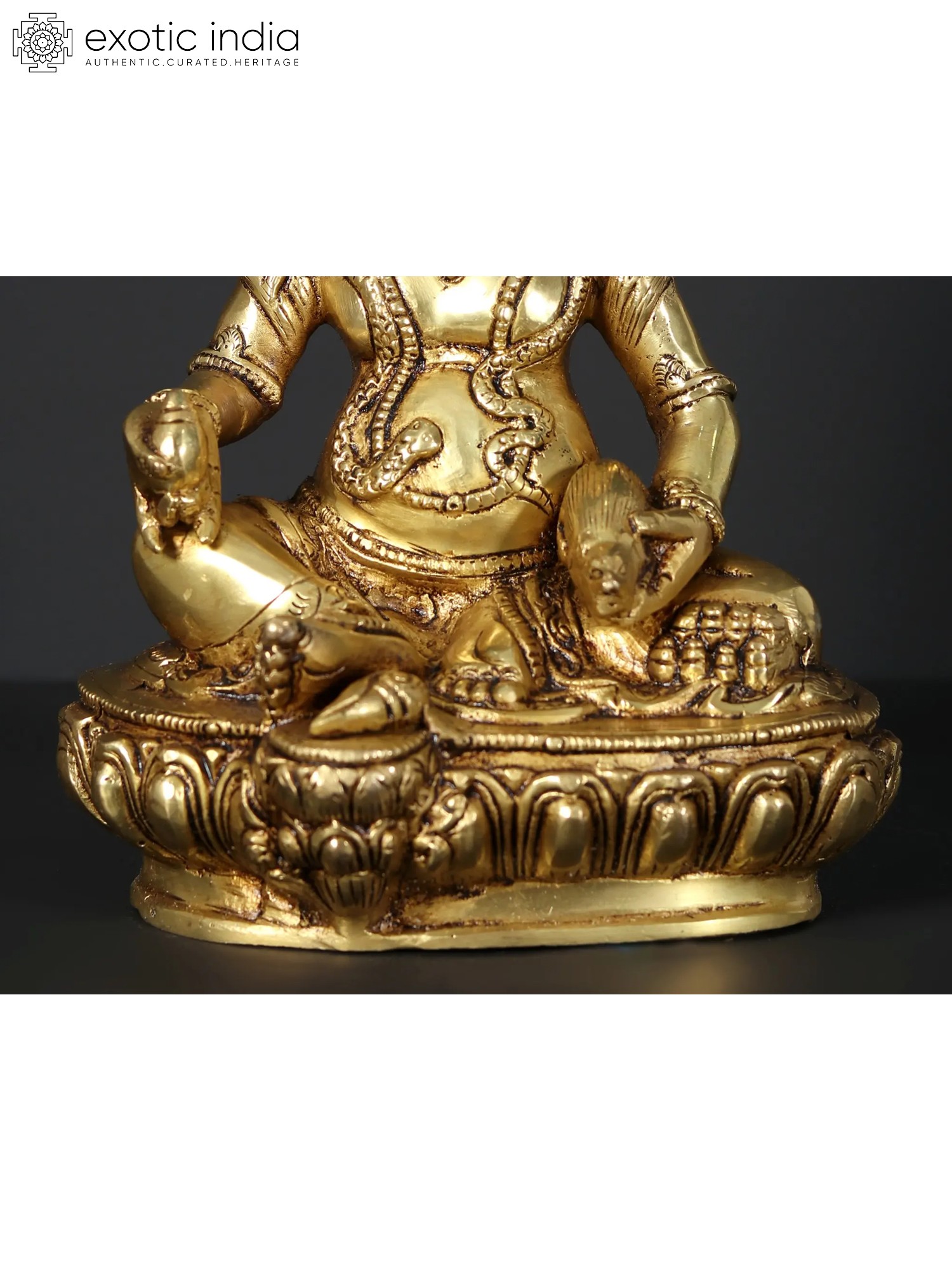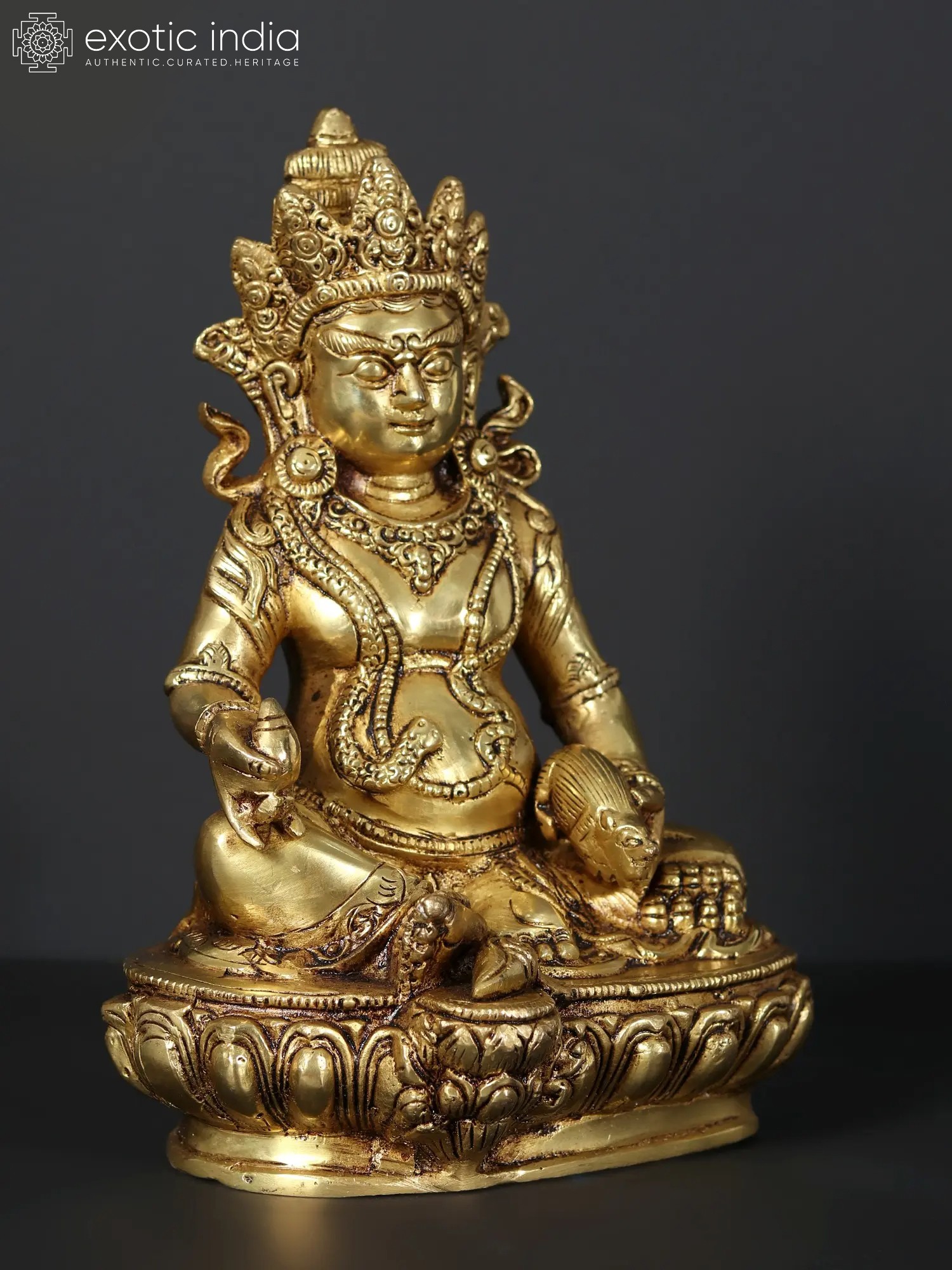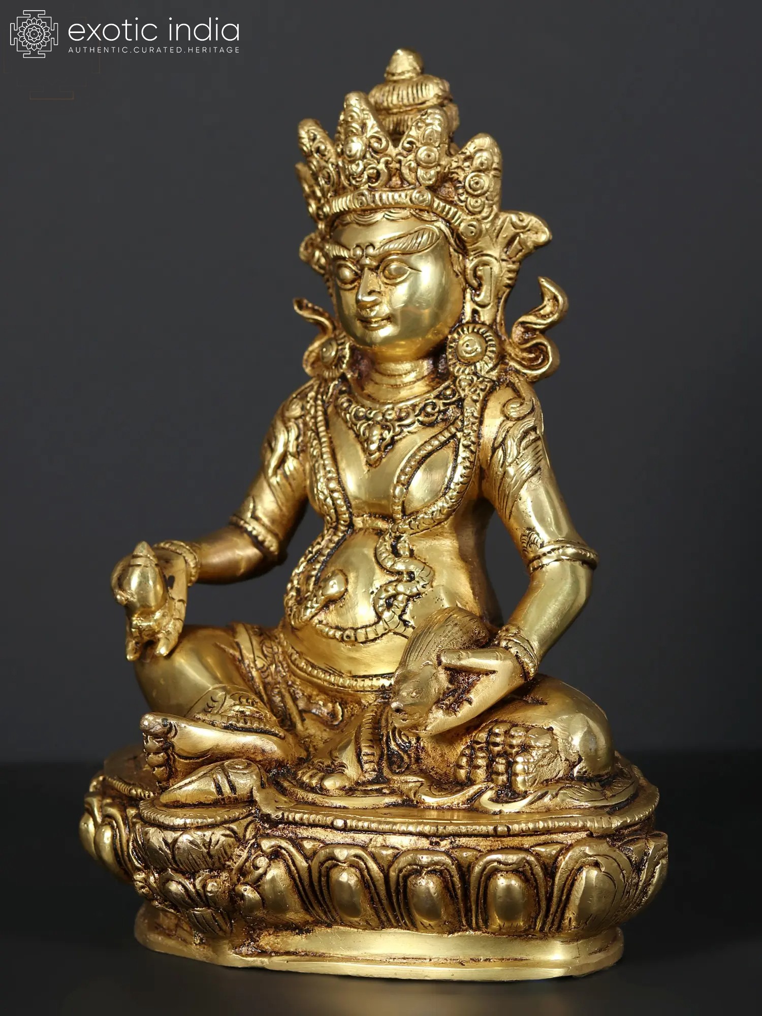 At the core of this brass sculpture lies the representation of Kubera, a revered deity in Tibetan Buddhism known as the Lord of Wealth and Guardian of the Northern Direction. With a profound understanding of the interplay between material abundance and spiritual enlightenment, Kubera symbolizes the harmonious balance between worldly prosperity and inner fulfillment. His presence infuses your environment with an aura of opulence, inspiring you to pursue not only material wealth but also the spiritual riches that enrich the soul - the gem in Kubera's left hand, symbolizing the intrinsic value of knowledge, enlightenment, and the wealth of wisdom and the mongoose resting on Kubera's right hand is an embodiment of auspiciousness and prosperity; Kubera on his Lotus plinth sits in a Lalitasana with a semi-wrathful expression over face.