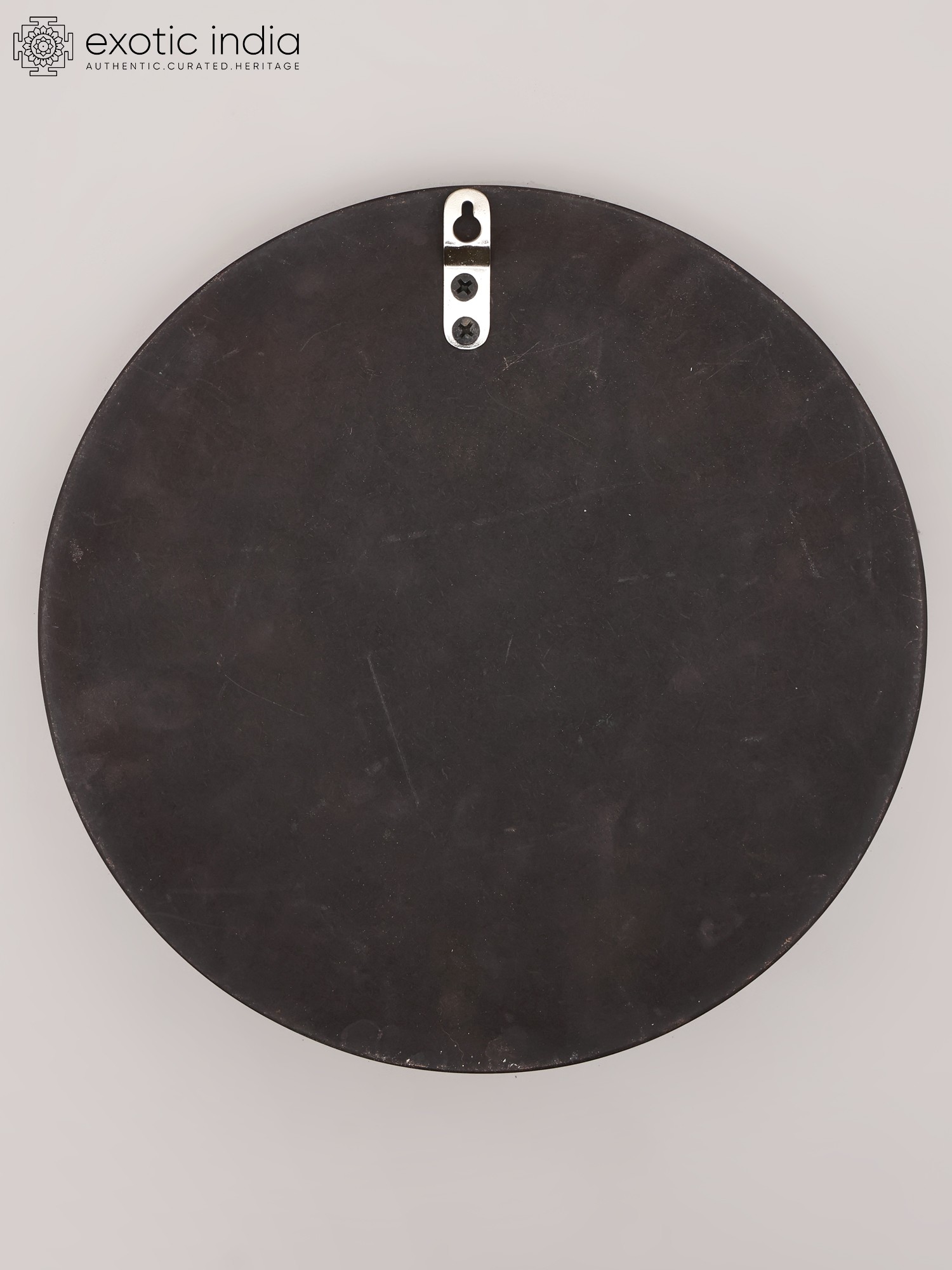 The lustrous brass captures the light beautifully, drawing attention to the tranquil expression. The concentric rings carved into the wooden frame create a subtle depth, elegantly framing the central motif. This piece, measuring 10 inches in diameter and a compact 3 inches deep, is perfectly proportioned to be a focal point without overwhelming your décor.