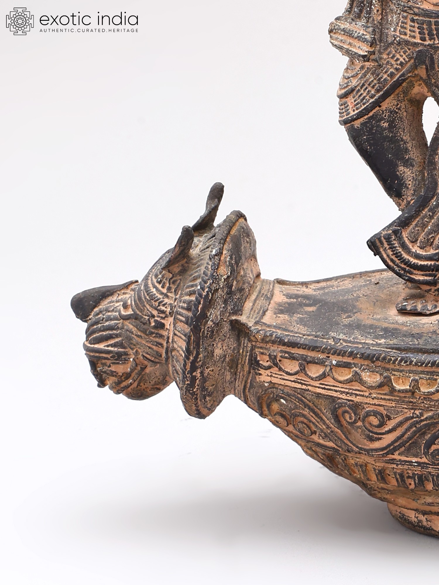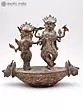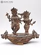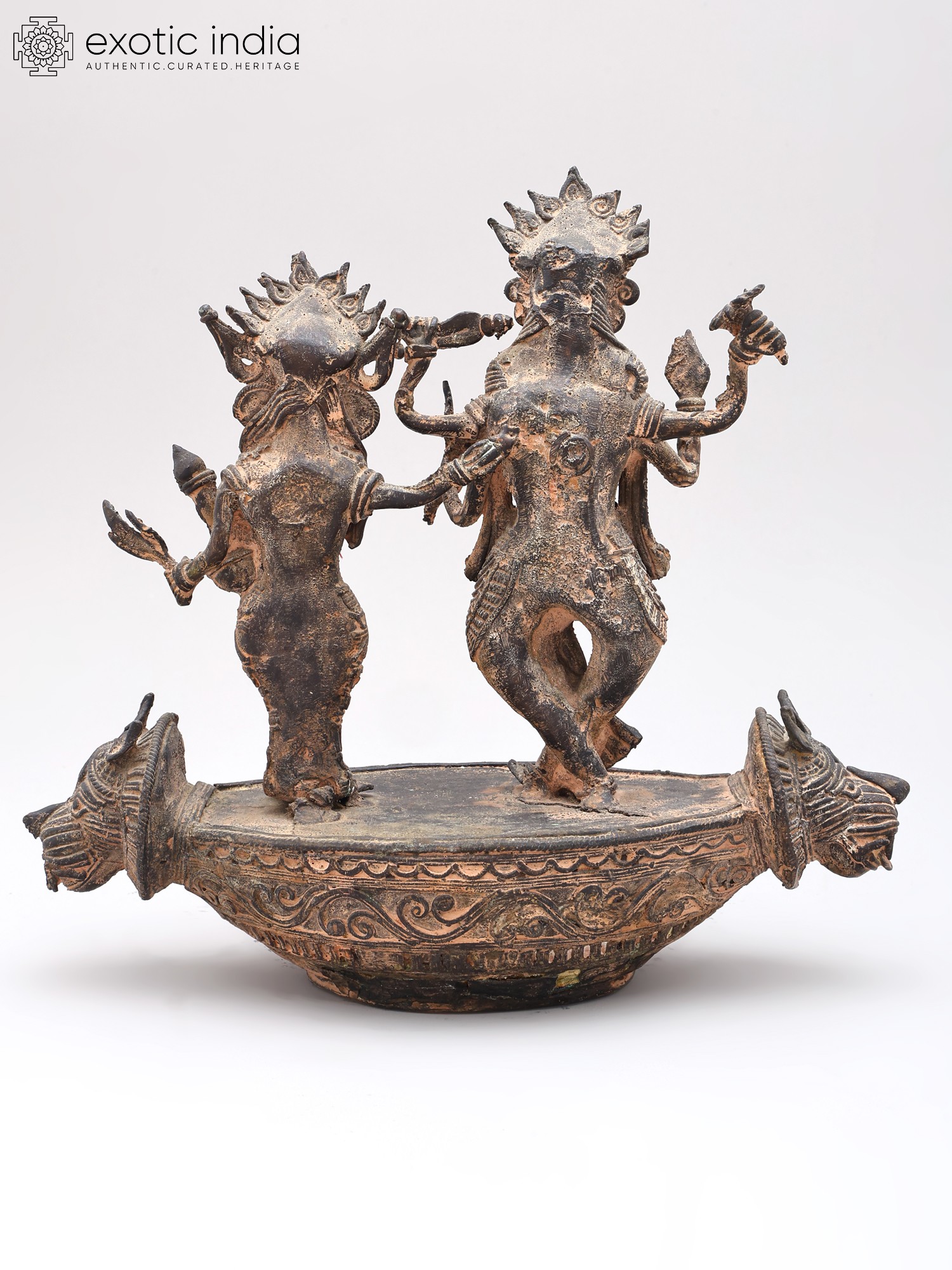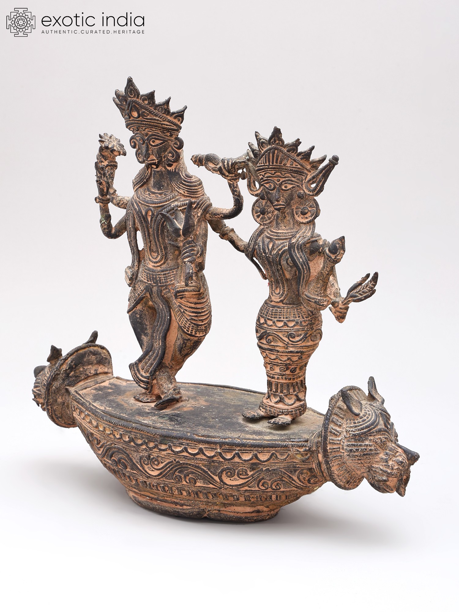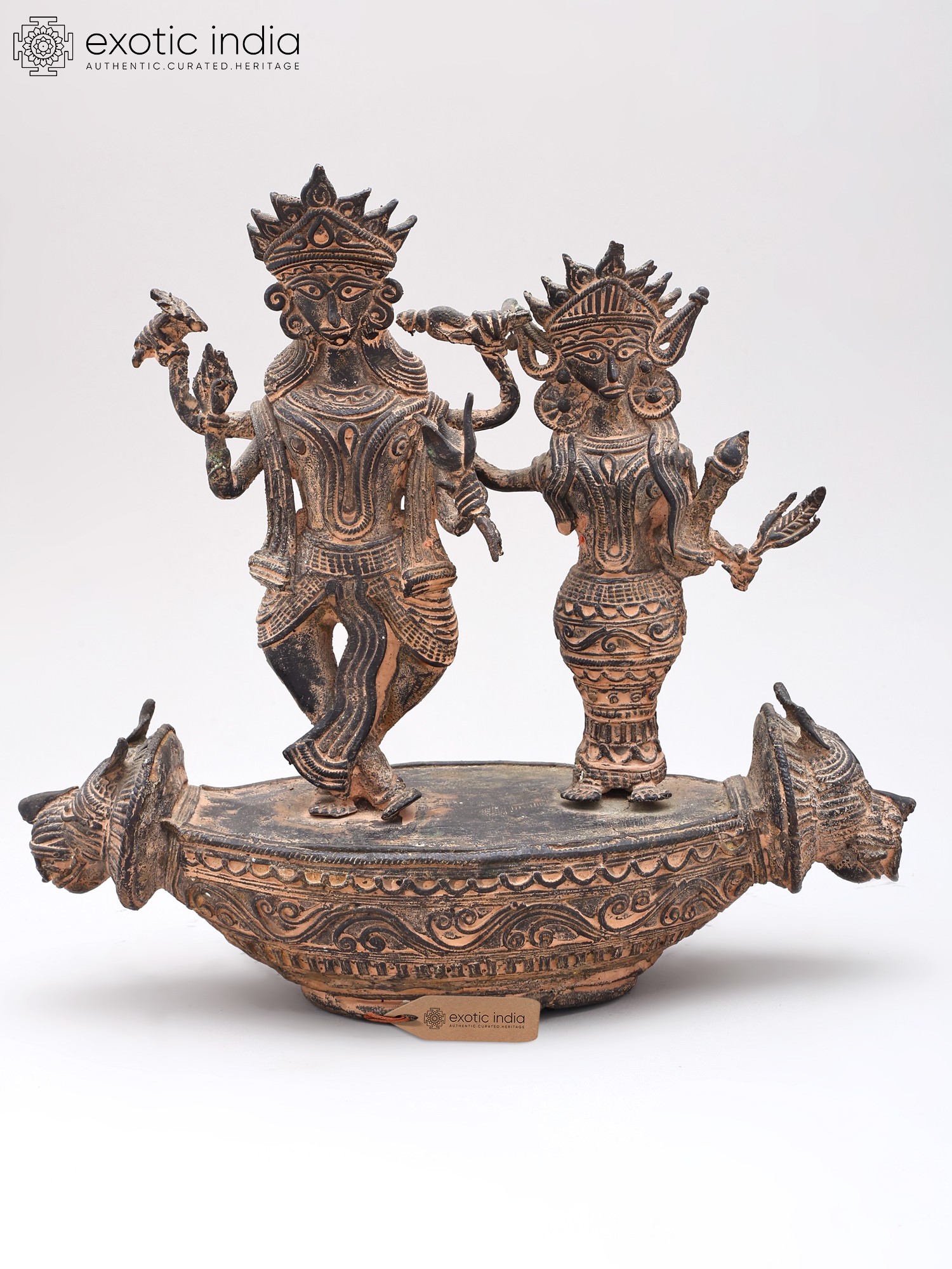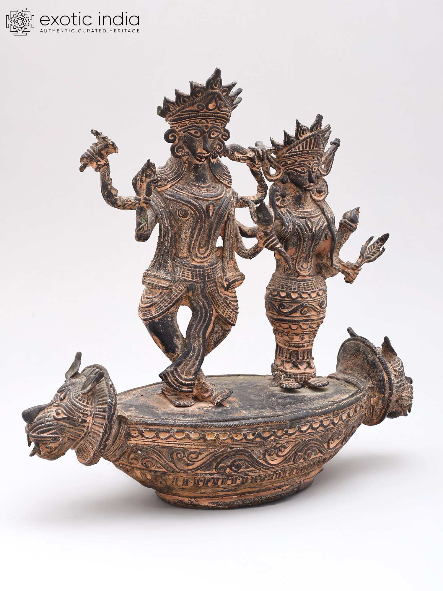 The Dhokra art form brings a unique character to this divine representation. The figures are characterized by their stylized features, flowing lines, and rhythmic patterns that adorn their garments and crowns. The tribal influence is evident in the raw, yet refined, finish of the brass, imbuing the sculpture with an earthy, primal energy. The base of the sculpture, adorned with what appears to be decorative animal heads, adds to its grandeur and mythological resonance. These elements could represent powerful protective beings or guardian spirits, reinforcing the divine protective aura of the central figures. In many Indian traditions, Lord Vishnu is believed to manifest in various forms to restore dharma, and Goddess Lakshmi is invoked during festivals like Diwali, the festival of lights, to invite prosperity and good fortune into homes. This sculpture is not merely a decorative object; it is a spiritual artifact that carries with it the weight of millennia of devotion and artistic tradition. It serves as a powerful reminder of the interconnectedness of the divine realms and the importance of both material and spiritual well-being. Placing this representation in your home or sacred space can be an invocation for peace, prosperity, and the harmonious balance of life's forces. Its intricate detailing and timeless design make it a captivating centerpiece, inviting contemplation and admiration for the divine couple and the artistry that brought them to life.