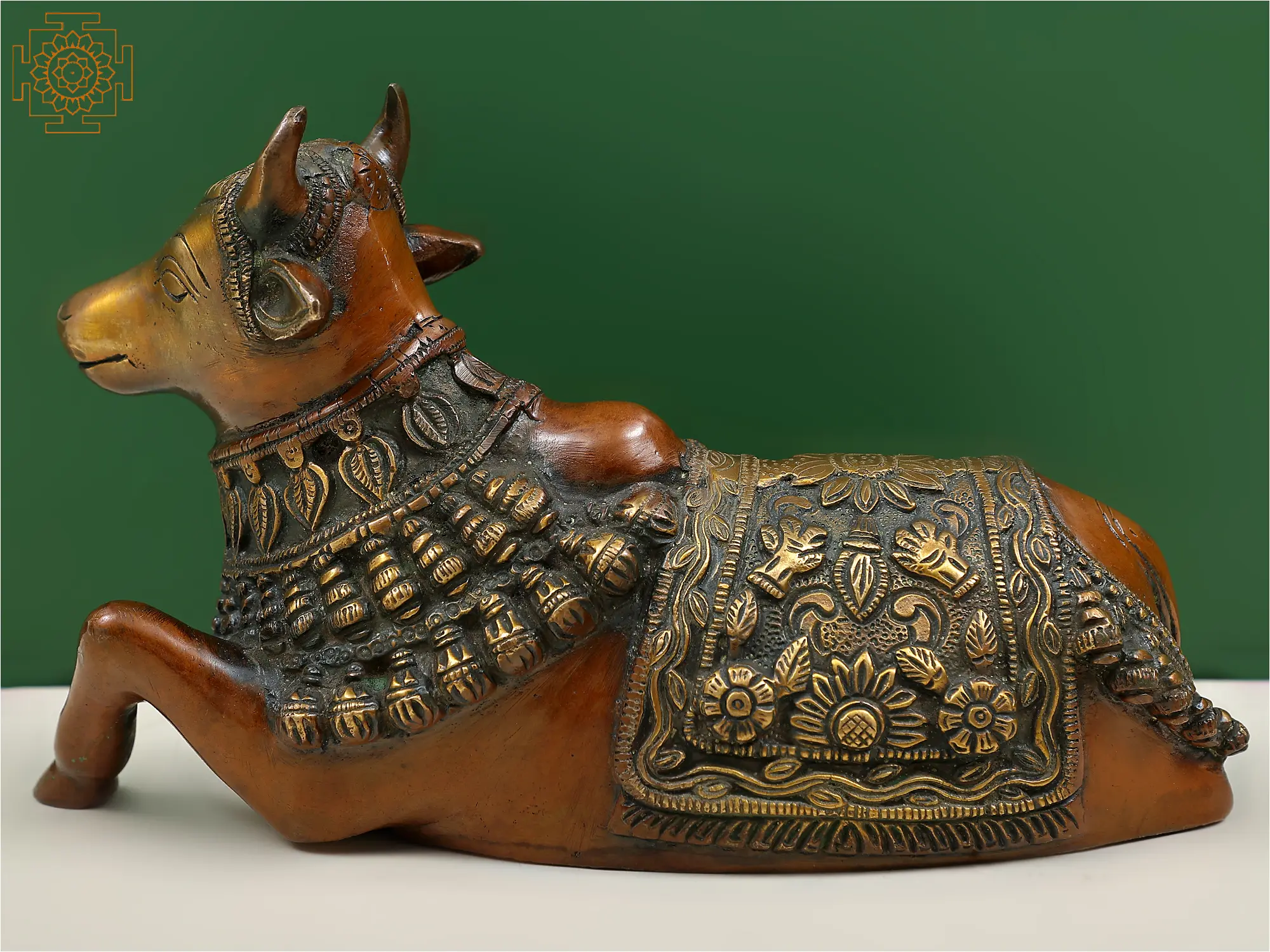 The artistry displayed in this statue is truly remarkable. The rich patina of the brass, combined with accents of deep green, evokes an aura of ancient tradition and spiritual depth. Nandi is depicted in a serene, reclined posture, a stance of attentive waiting that speaks volumes about his role as the guardian of Shiva's sacred space. His adorned form, with intricately detailed ornamentation, speaks to his elevated status and the reverence he commands. The delicate carvings on his saddlecloth, featuring floral motifs and symbolic patterns, reflect the rich heritage of Indian craftsmanship. Each element, from the gentle curve of his horns to the placid expression on his face, is rendered with an artist's precision and a devotee's touch.