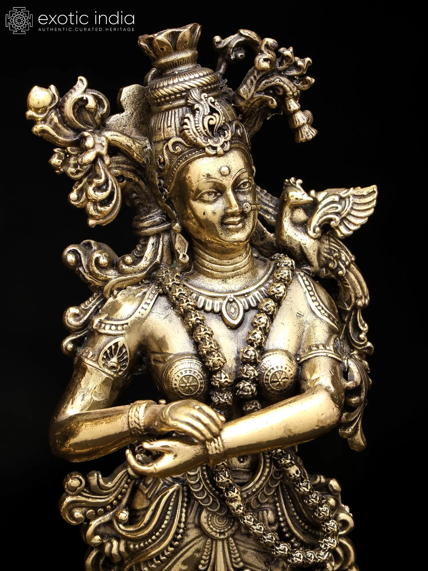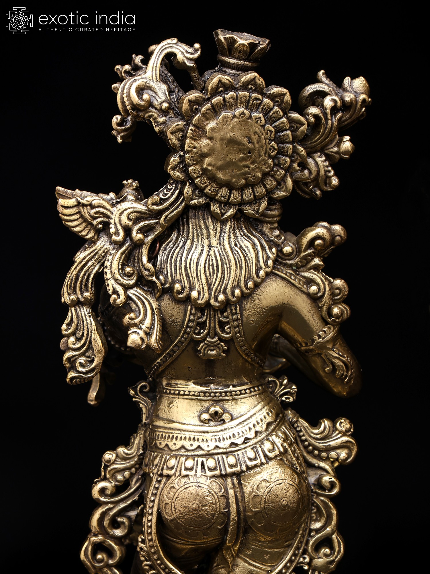 Observe the delicate ornamentation that adorns each divine form, from the flowing dhoti and ornate jewelry to the intricate floral motifs that cascade around their figures. The serene expressions, the gentle posture of Krishna playing his flute, and Radha’s graceful stance all contribute to their captivating presence. Standing at an impressive height of ten inches, they command attention, their detailed craftsmanship illuminated by the lustrous brass finish.