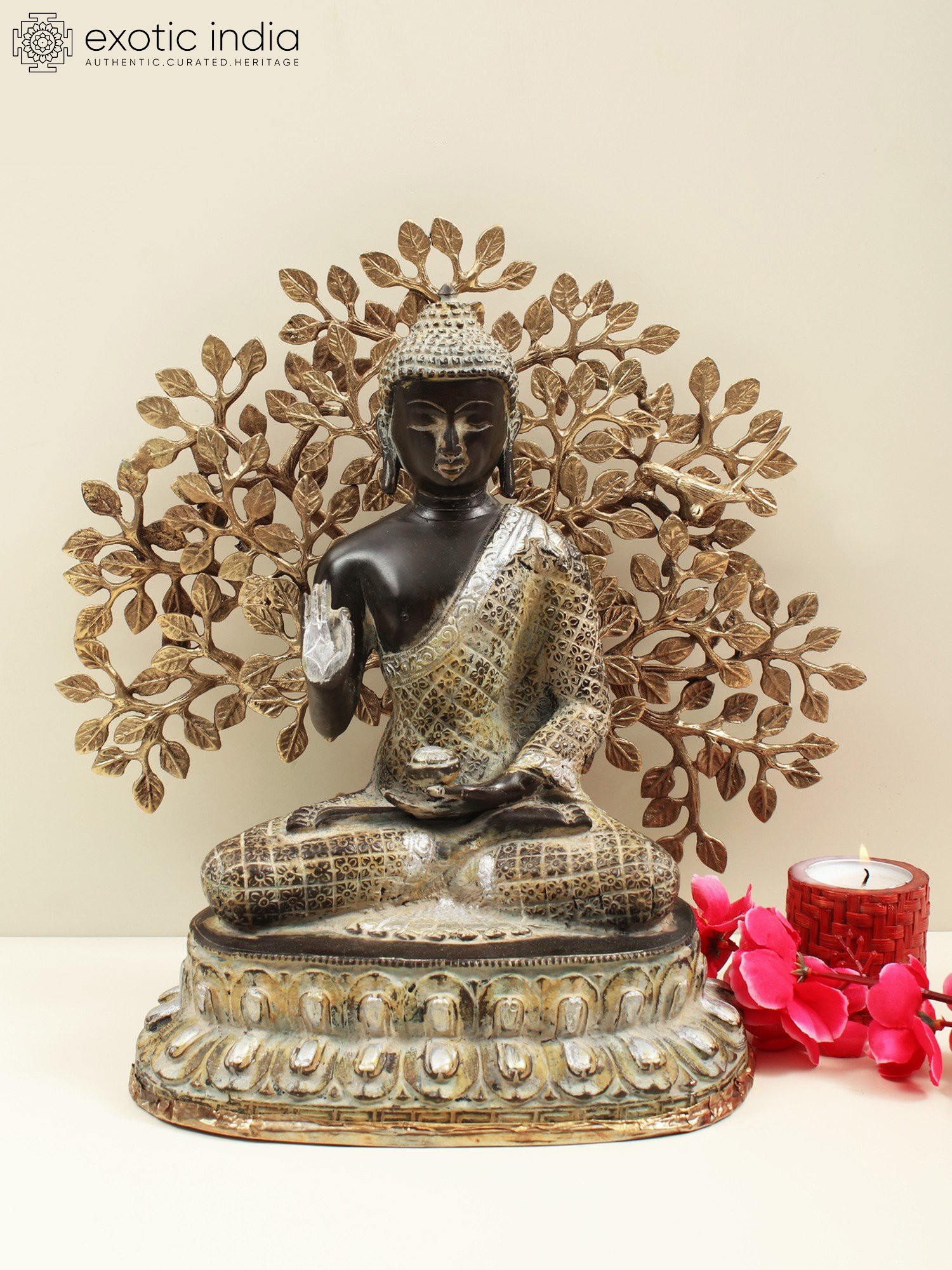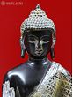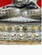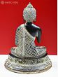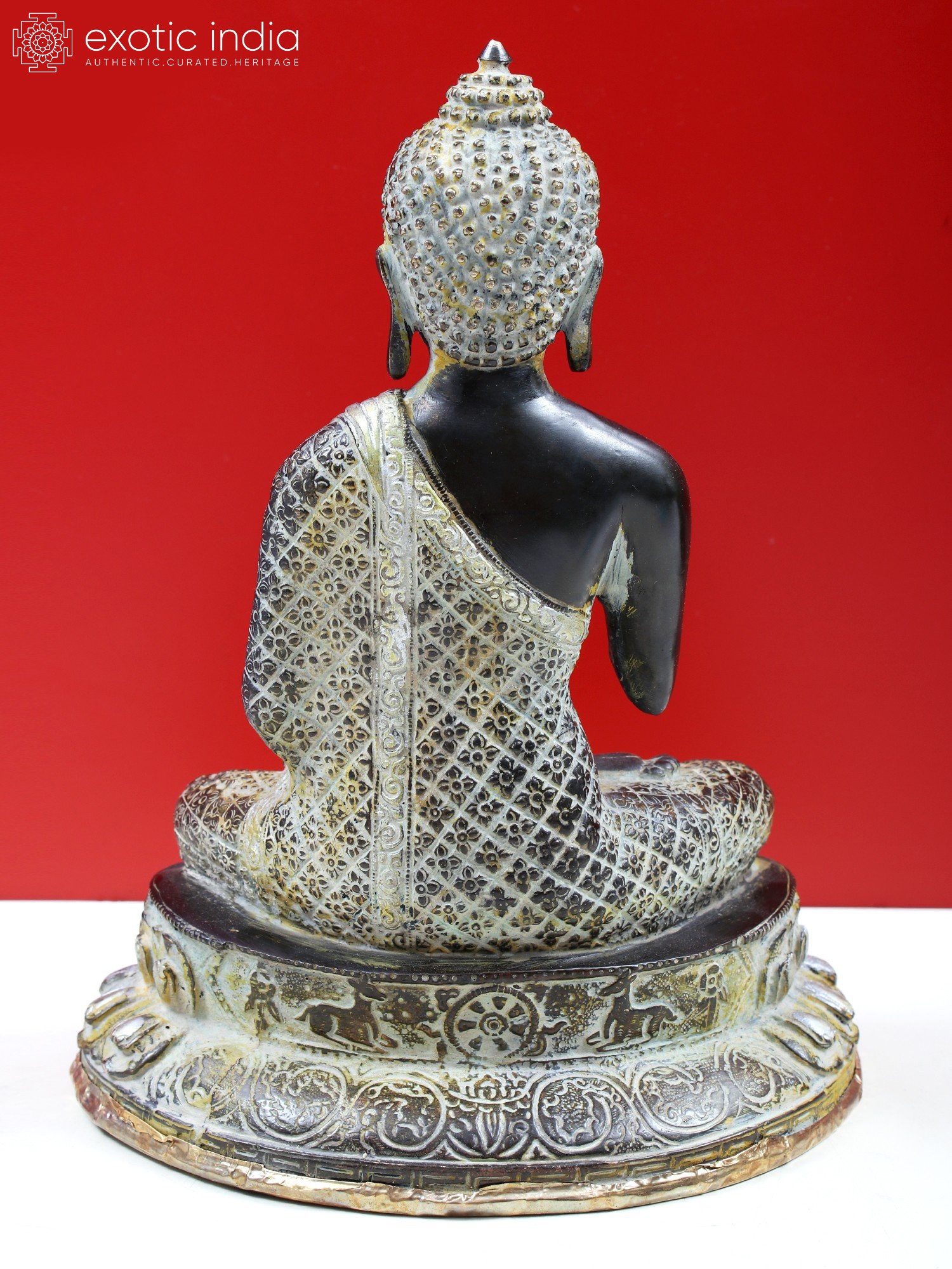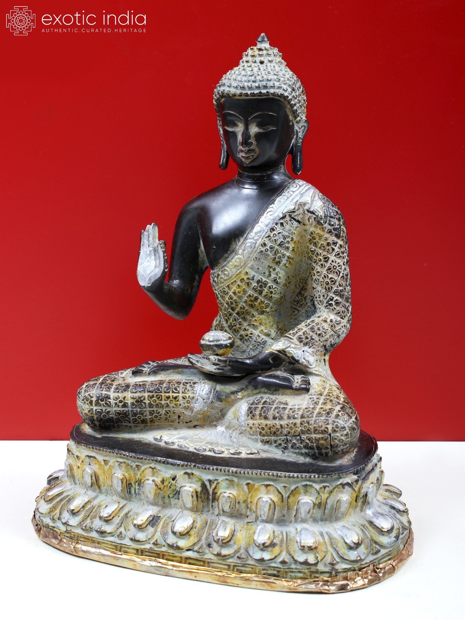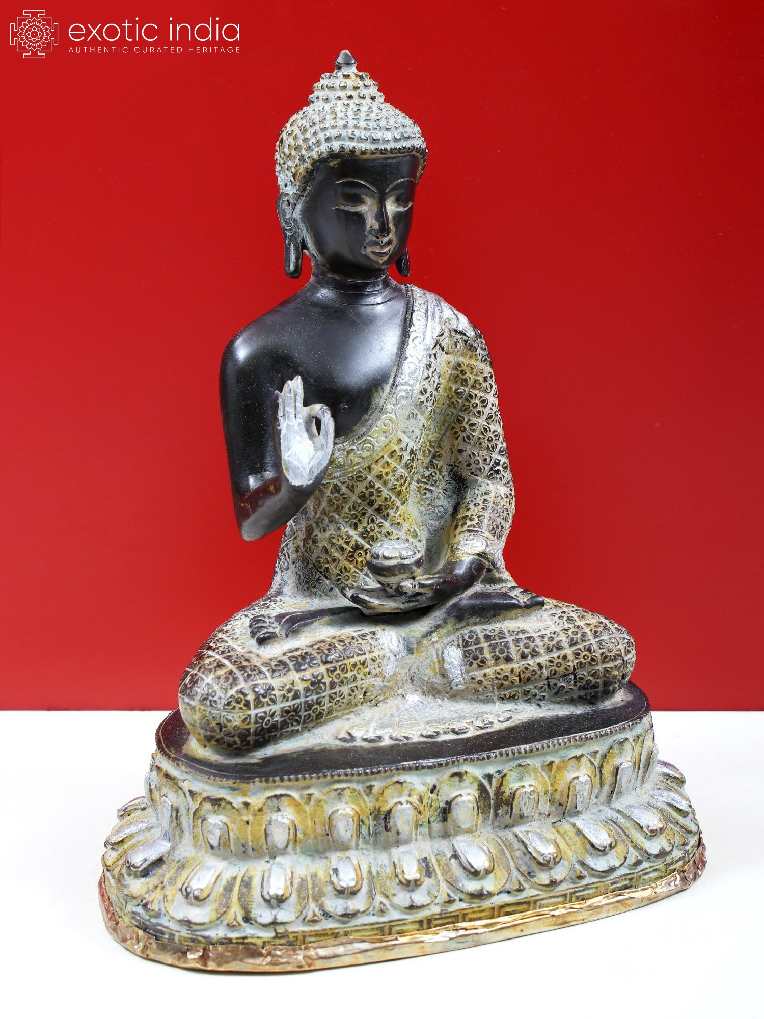 The murti that you see on this page features a dark, almost black, finish with gold overtones. Black, the colour of sattvaguna, adds to the poise of the Buddha. His robe is chequered across the surface, each panel having been engraved with identical flowers, the four petals filling up each corner of the quadrilateral. A wide-set lotus pedestal to accommodate His long, folded limbs. Two layers of petals are indicative of one gigantic bloom atop another turned upside down.