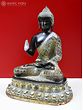The Enlightened One gathers His legs in the finest padmasana - the hip-and-knee trifecta on the same plane, soles of the feet facing skywards, the heels drawn directly below the navel - and raises the right hand in vitarka mudra, the gesture of the one possessed of knowledge and wisdom.