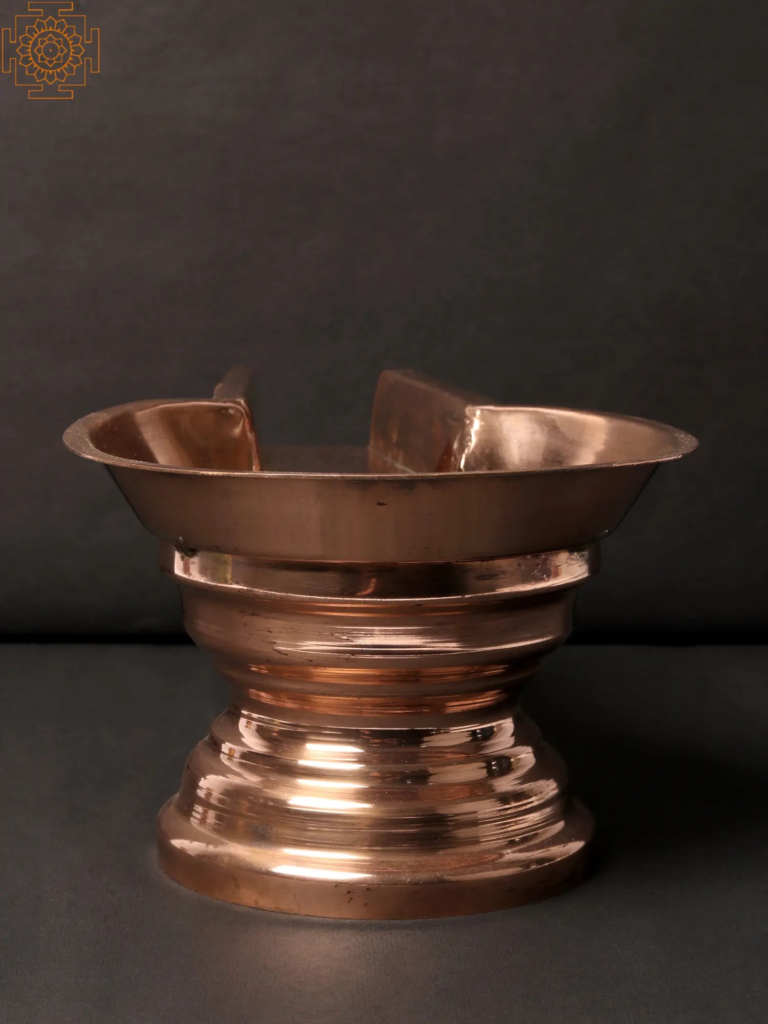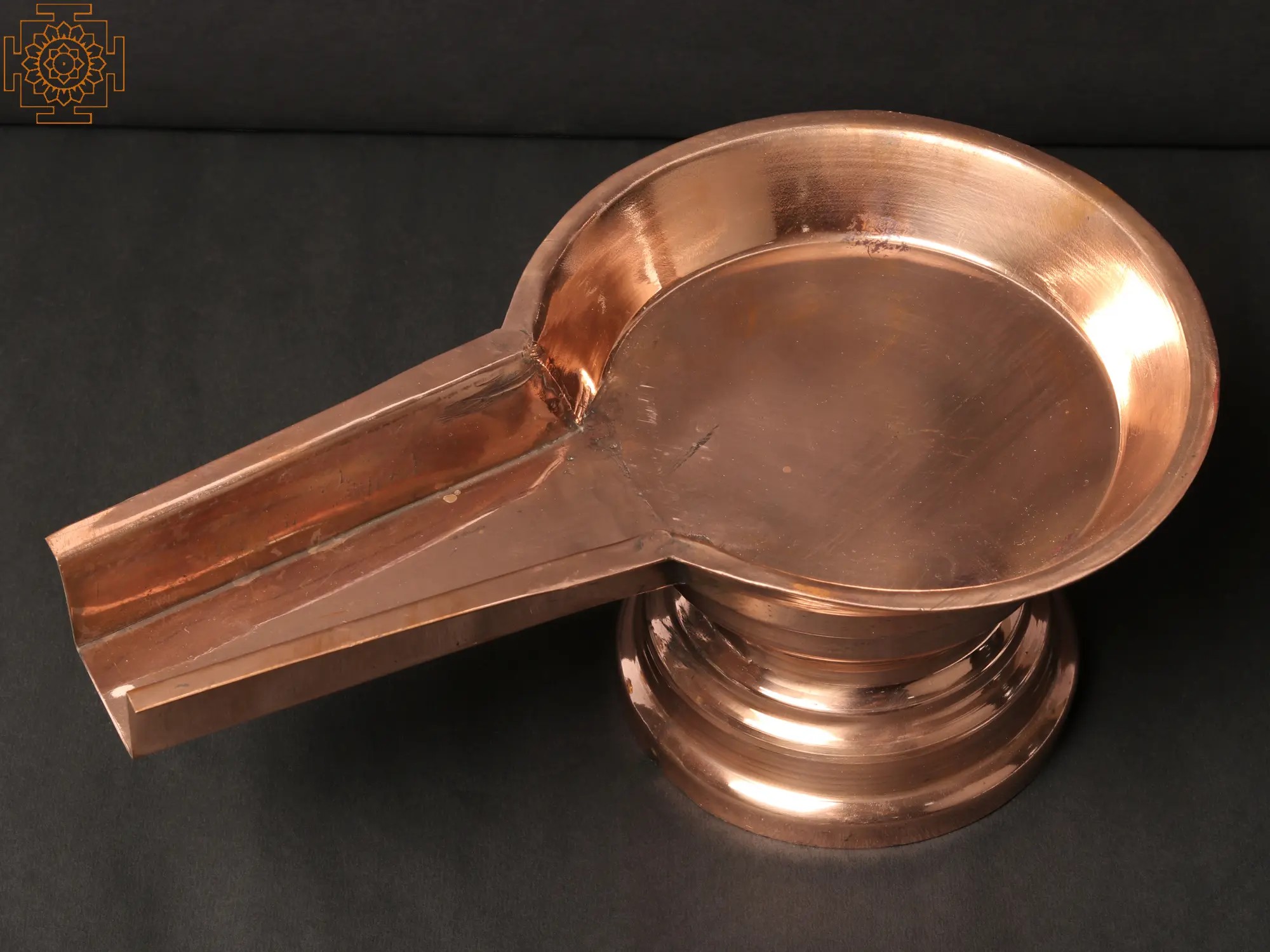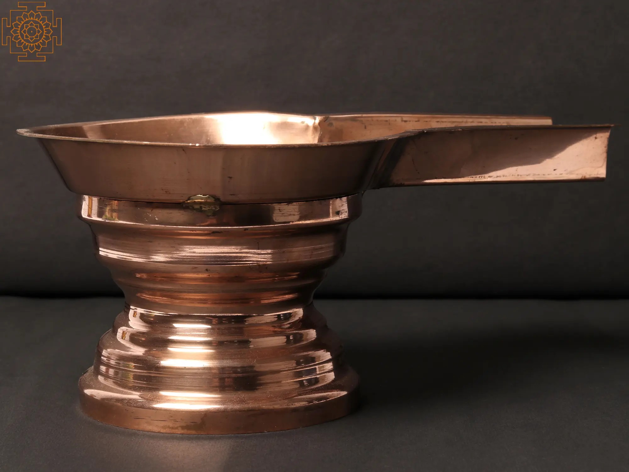 This exquisite copper vessel is crafted to facilitate the sacred ritual of Abhishekam, the ceremonial bathing of deities. In Hindu tradition, the act of pouring liquids such as milk, water, honey, or ghee over a consecrated idol is a profound expression of devotion and a means to invoke divine blessings. This patra, with its thoughtful design and lustrous copper material, serves as an ideal conduit for such sacred offerings. Copper itself is revered in Vedic culture for its purity and its ability to conduct spiritual energy, making it a favored material for religious paraphernalia. The form of this patra is reminiscent of ancient Brahminical practices, where the ritualistic pouring of libations was central to appeasing and honoring the gods. The wide, shallow bowl is designed to hold the sacred liquids, while the elegantly extended spout allows for a controlled and graceful flow. This spout, often referred to as a channel, ensures that the offering is directed precisely, mirroring the reverence with which such acts are performed. The accompanying base provides a stable platform, elevating the vessel and enhancing the visual appeal of the ritualistic setup. The tiered, ornamental design of the base speaks to the craftsmanship and attention to detail that characterizes traditional Indian metalwork.