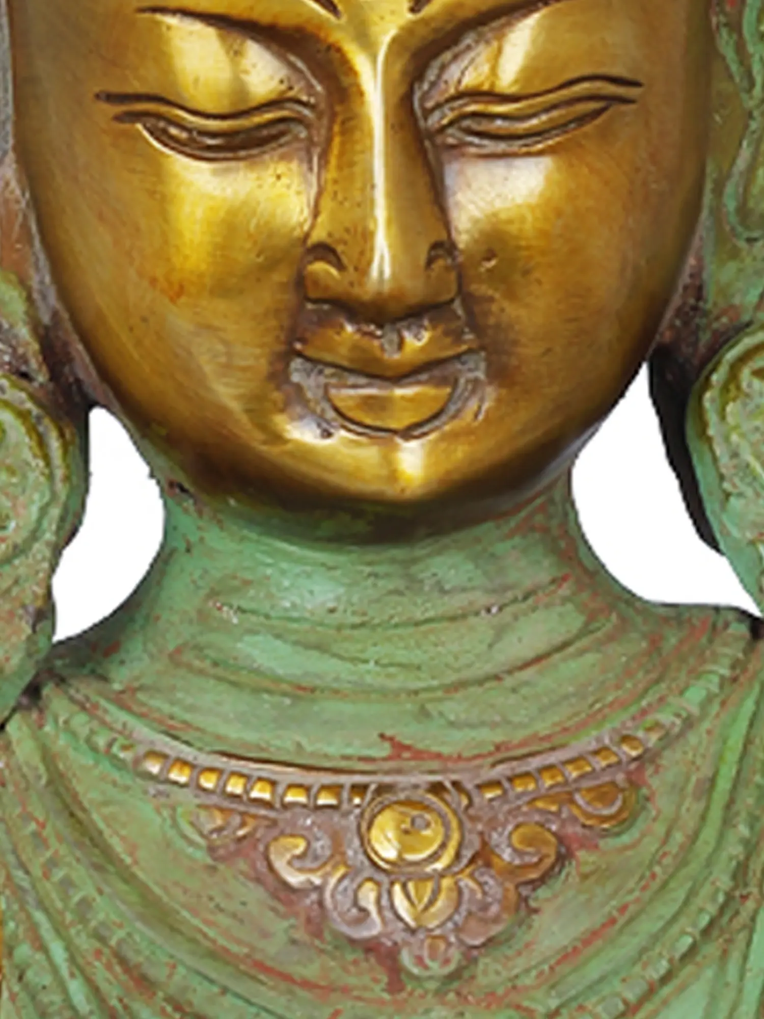 This statue is ideal for adorning a personal altar, meditation room, or any space where you seek to cultivate serenity and spiritual awareness. Its commanding yet graceful presence can transform an environment, offering a focal point for prayer, reflection, and mindfulness. Whether you are a dedicated practitioner of Buddhism or simply appreciate the profound beauty and symbolism of sacred art, this handcrafted brass deity is a truly remarkable acquisition. It serves as a constant source of inspiration, a reminder of the path to inner peace and enlightenment, and a beautiful testament to the enduring spirit of human artistry and devotion.