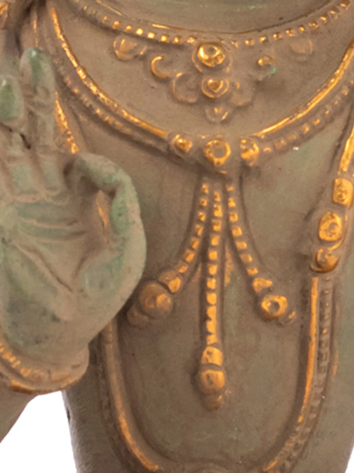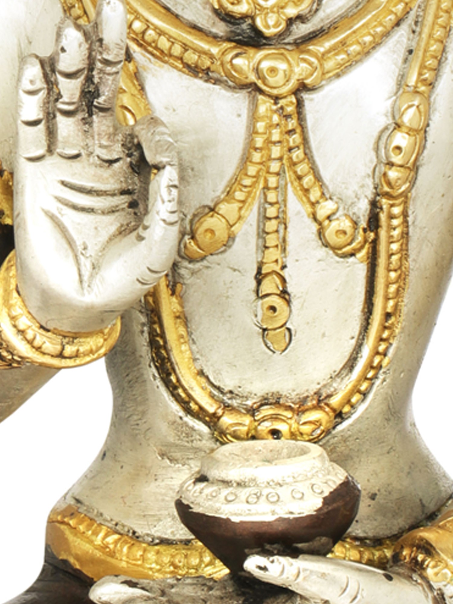 The posture of this deity is deeply symbolic. Seated in a meditative cross-legged position, known as the lotus or vajra posture, it signifies stability, enlightenment, and the transcendence of worldly concerns. The raised right hand, palm outward, is a gesture of abhaya mudra, symbolizing fearlessness and protection, assuring devotees that they are safe from harm and doubt. The gentle gaze and serene expression invite contemplation and inner peace. The delicate ornamentation adorning the deity's form, from the elaborate crown to the intricate necklaces and armbands, speaks of its divine status and the richness of Buddhist iconography. The small vessel held in the left hand often symbolizes the nectar of immortality or the fulfillment of aspirations, a reminder of the spiritual bounty available to the devoted.