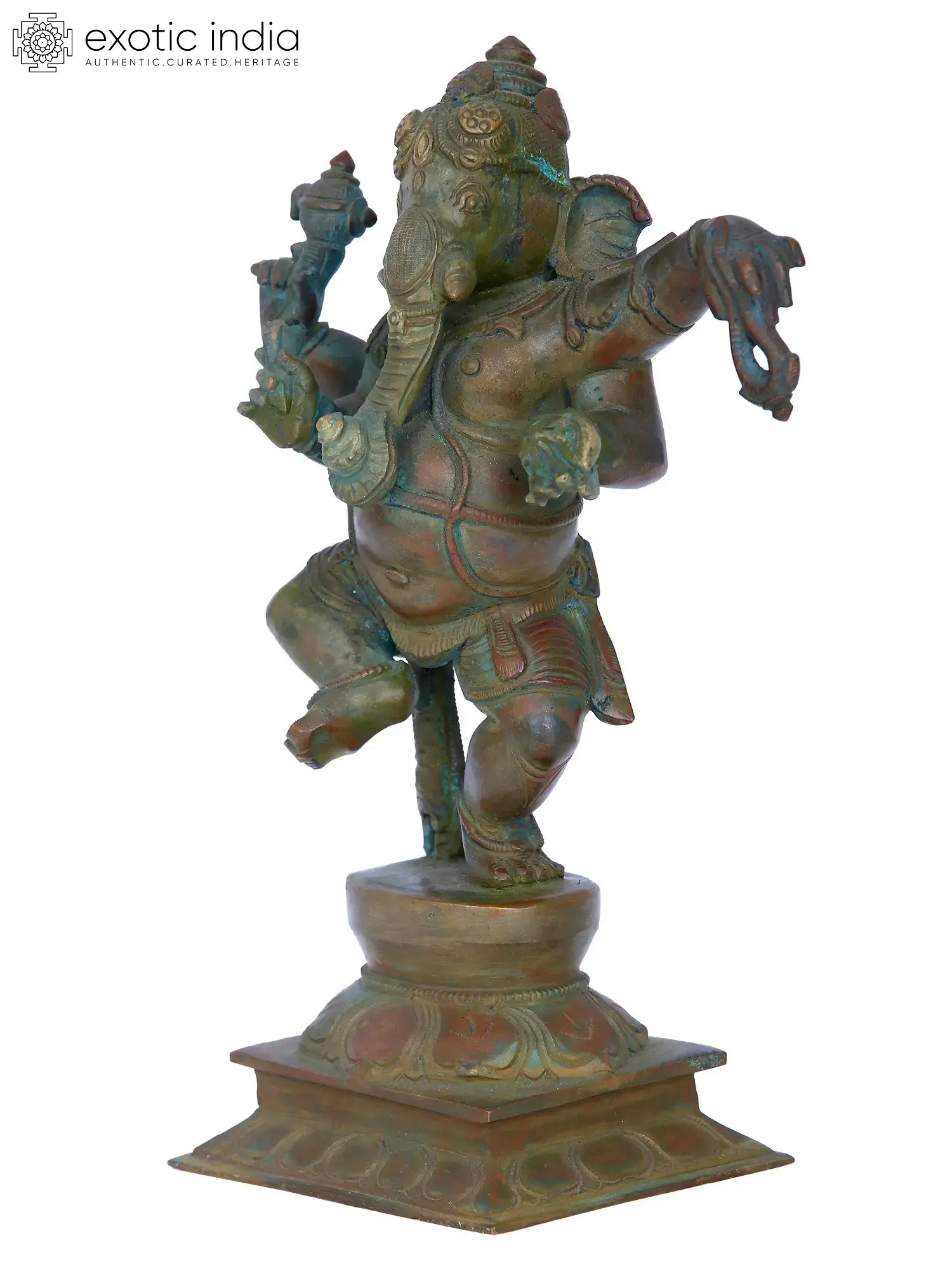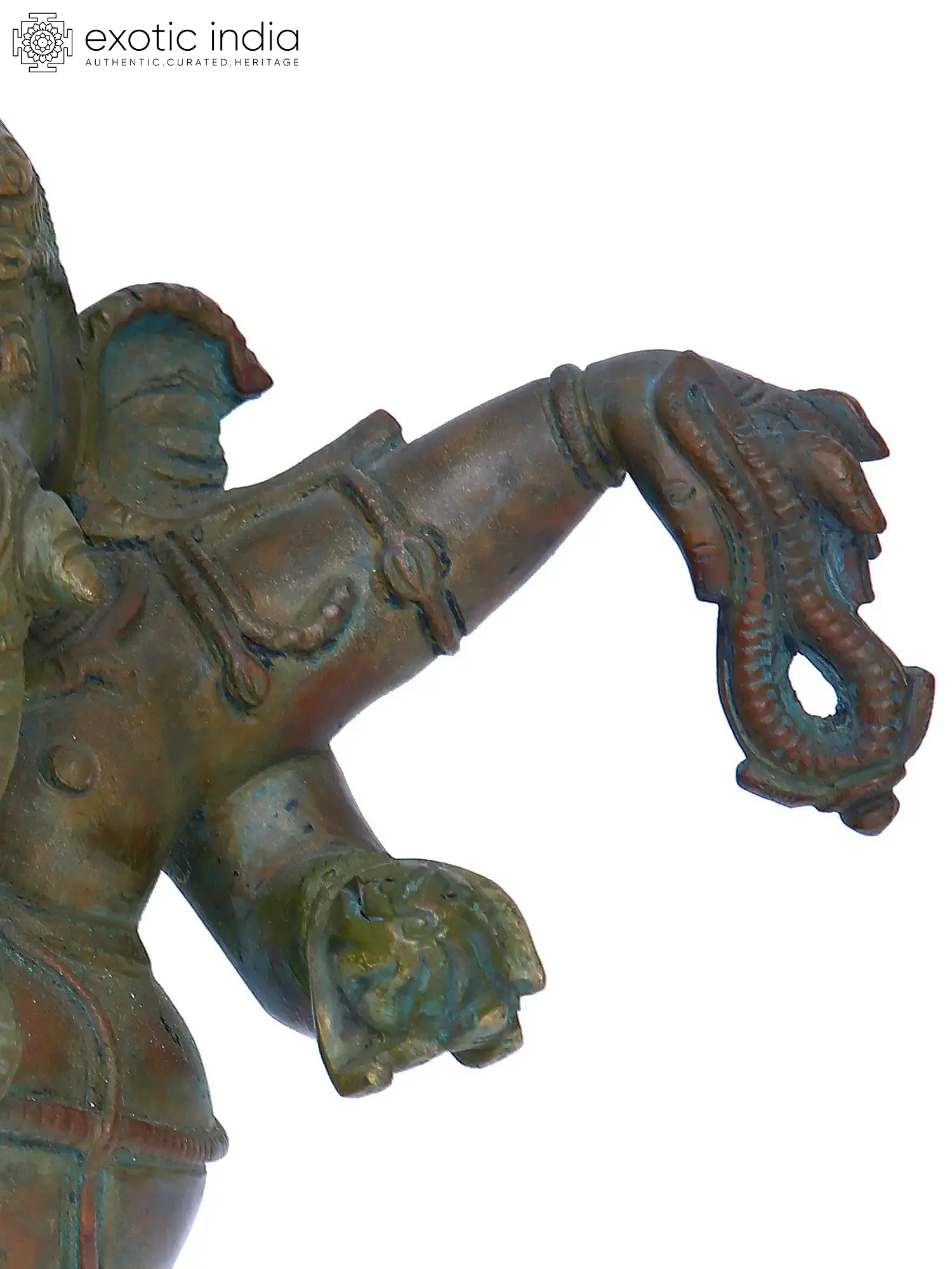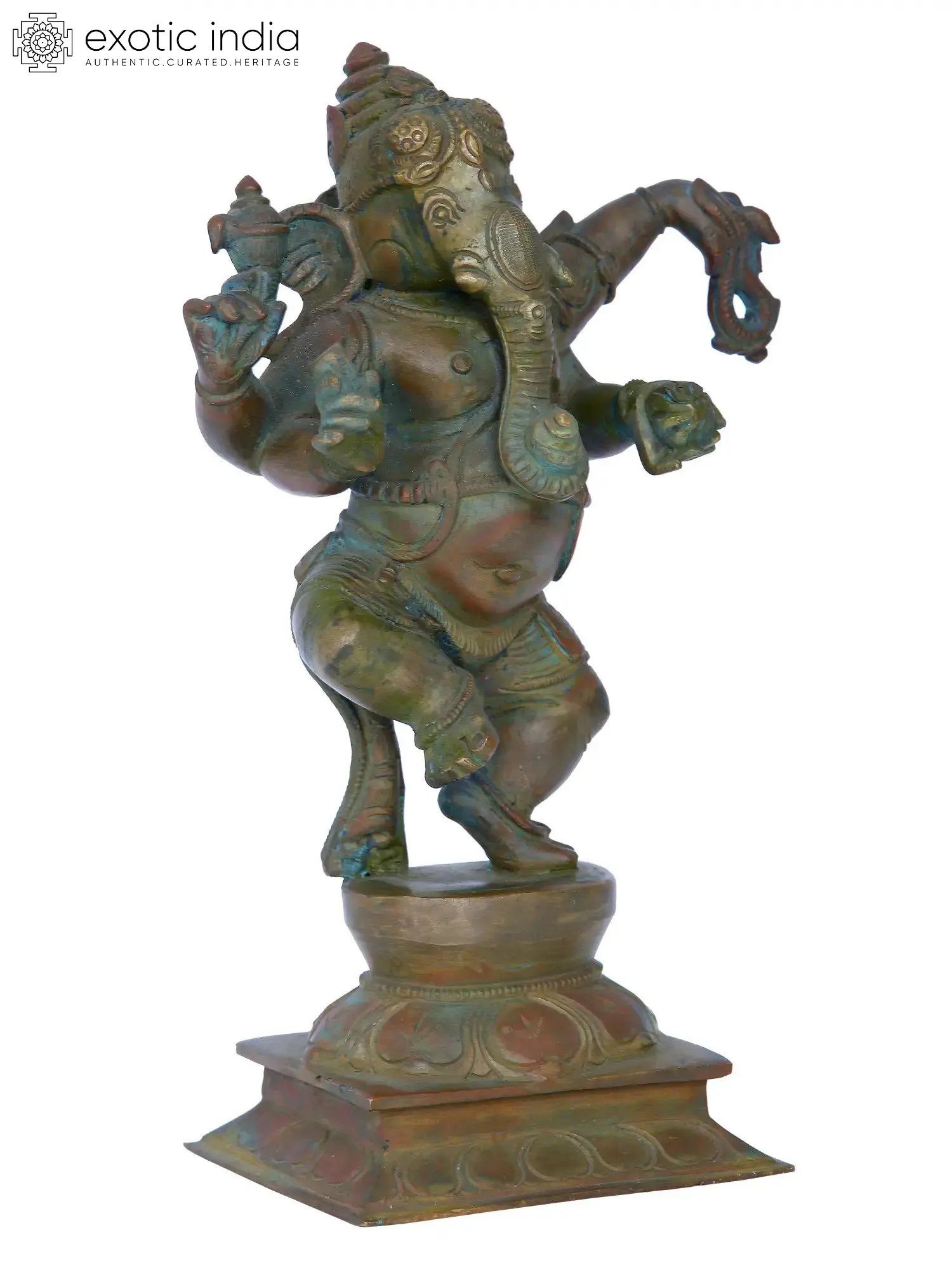 Experience divine joy with our Nritya Ganapati from Mudgala Purana sculpture, a mesmerising creation through Madhuchista Vidhanam in Swamimalai's Panchaloha Bronze. This artwork, inspired by the Mudgala Purana, beautifully depicts Lord Ganesha in a dynamic dance pose. Beyond its artistic allure, the sculpture embodies the Hindu philosophical concept of 'Harmony in Motion,' symbolising Ganesha's ability to harmonise the cosmic dance of creation. The lost-wax technique intricately details the dynamic movements, inviting you to celebrate the joyous dance of Nritya Ganapati and the rhythmic flow of divine energy.
