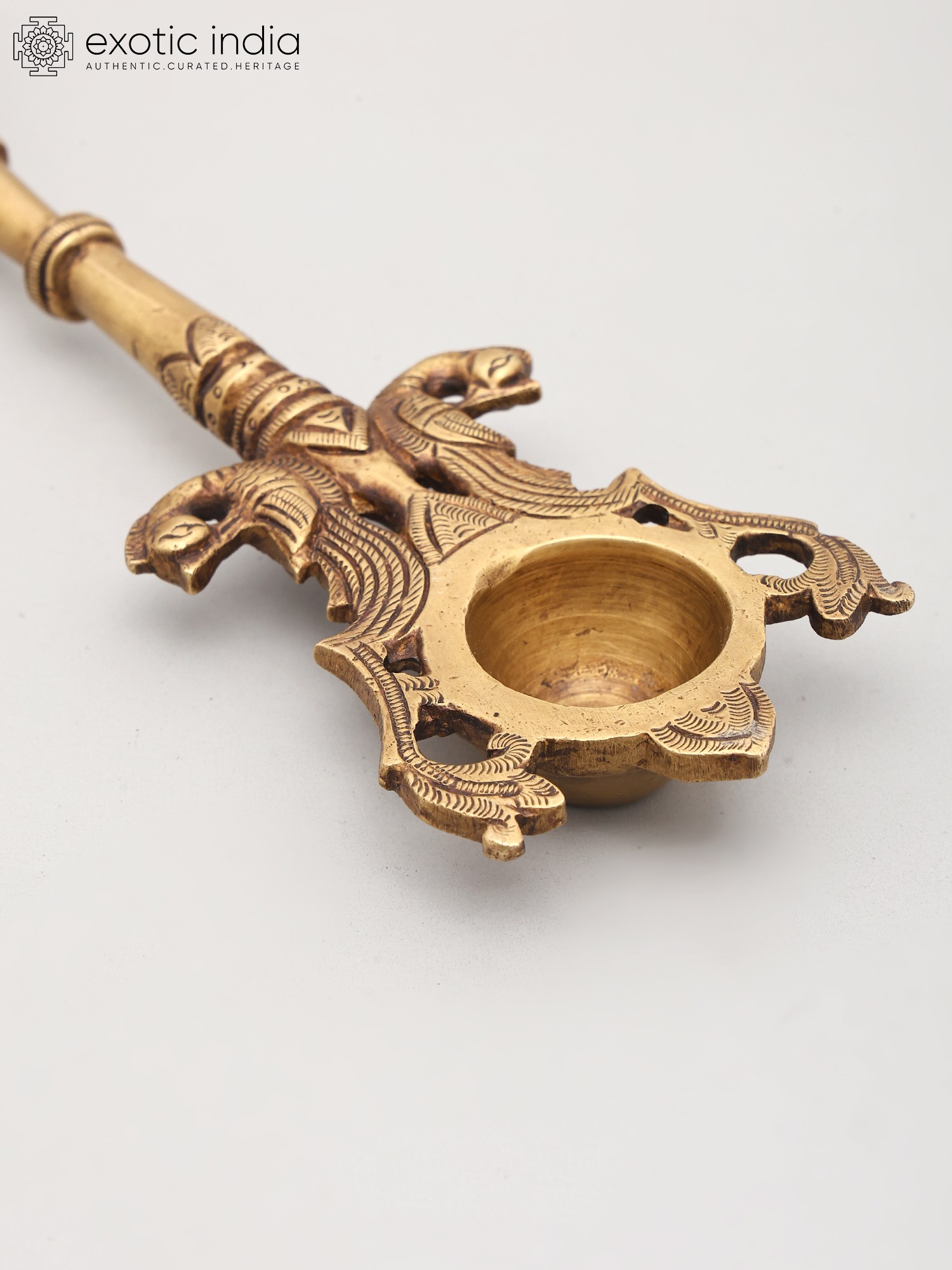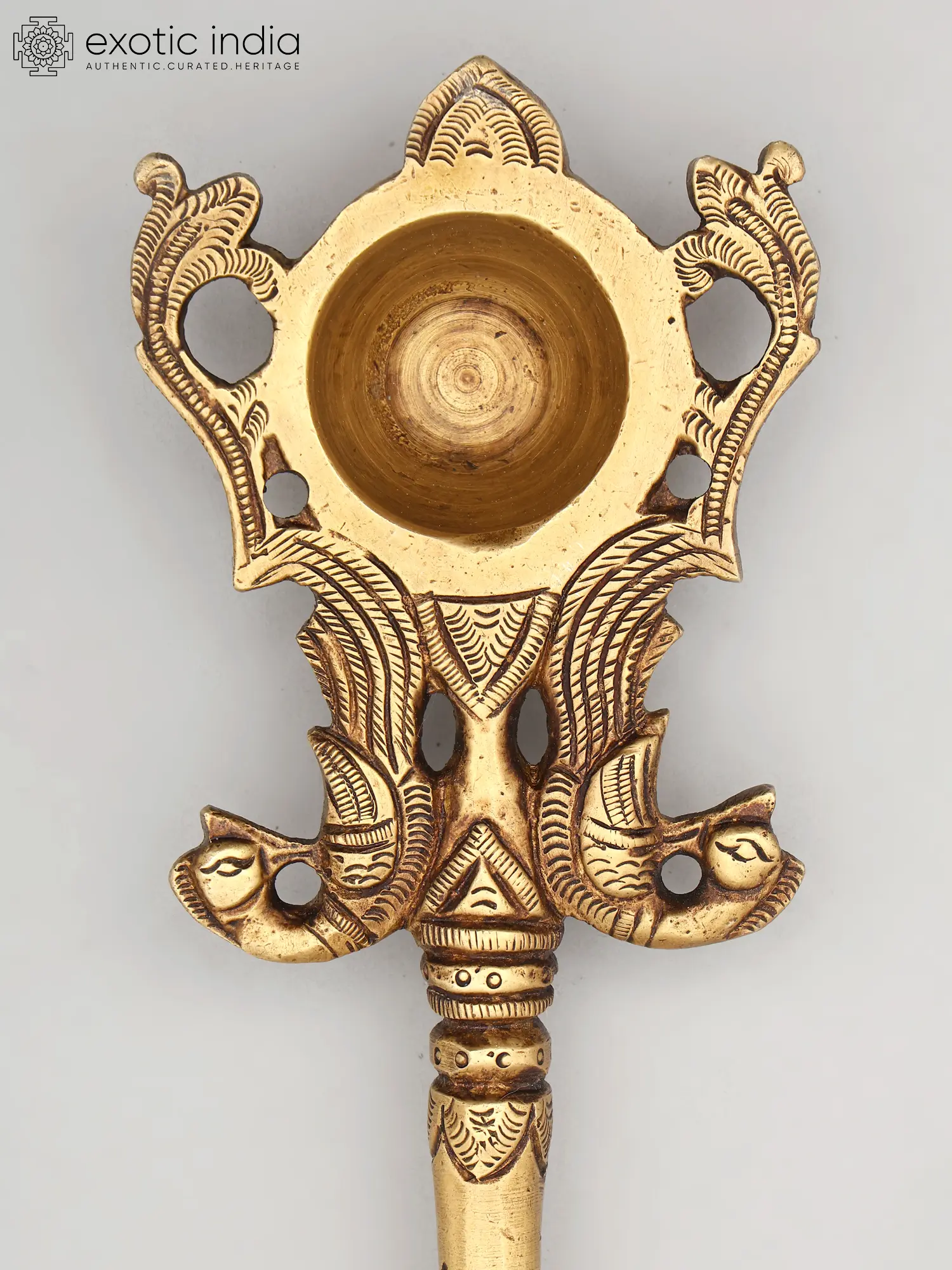 Handcrafted in India by skilled artisans, this piece is a testament to the enduring tradition of brass metalwork. The rich, warm hue of the brass lends an aura of sanctity and timelessness, ideal for sacred rituals and devotional spaces. The intricate details of Ganesha's form, from the delicate ornamentation on his headdress to the subtle musculature of his body, showcase the artisan's mastery. The upper portion of the spoon features a stylized depiction of two mythical birds or makaras, creatures often associated with wealth, prosperity, and water, further enhancing the ritualistic significance of the piece. This adds another layer of auspicious symbolism, invoking blessings and abundance. The design culminates in a functional bowl, ready to hold sacred offerings like *tilak*, *kumkum*, or *akshat* during puja ceremonies.