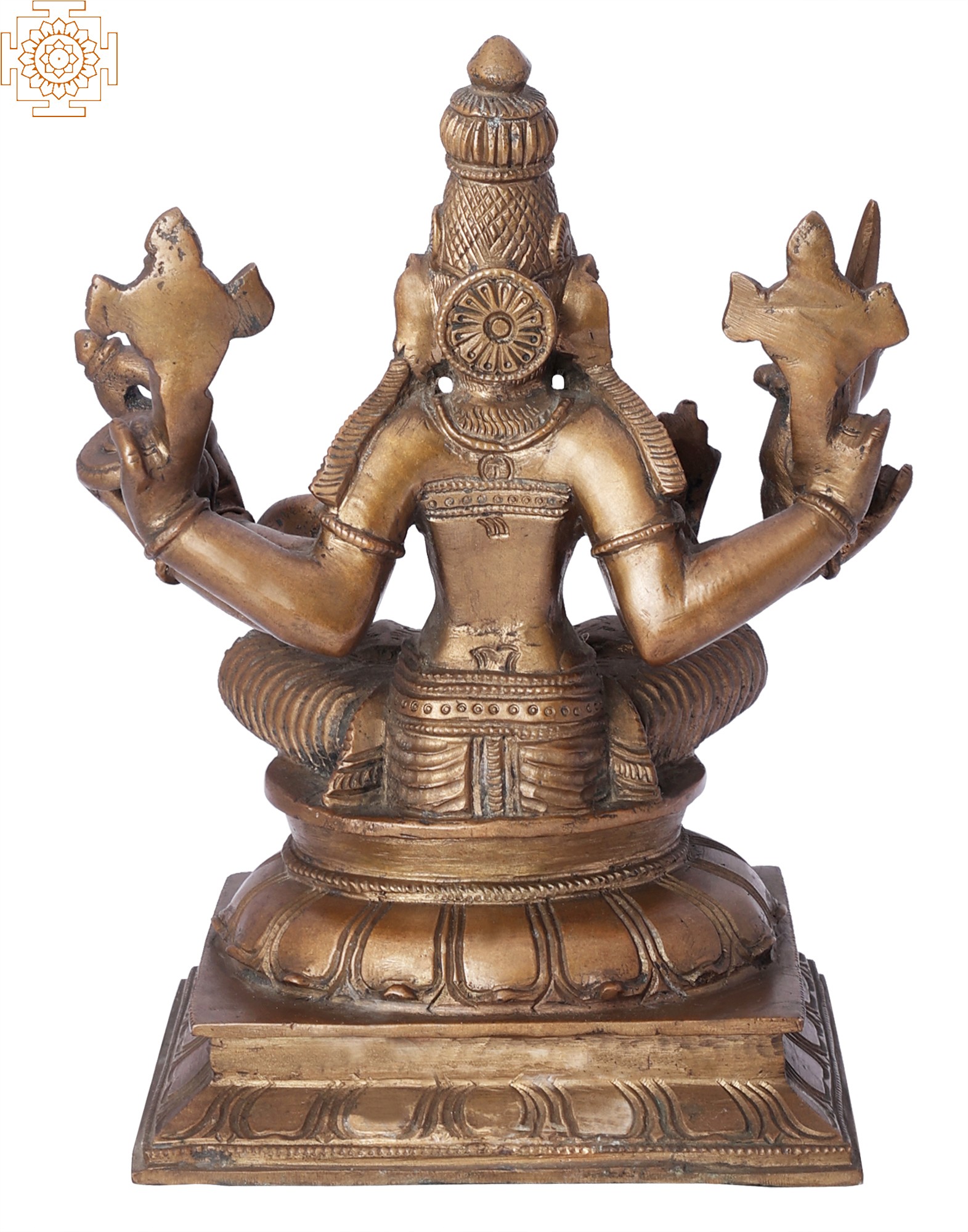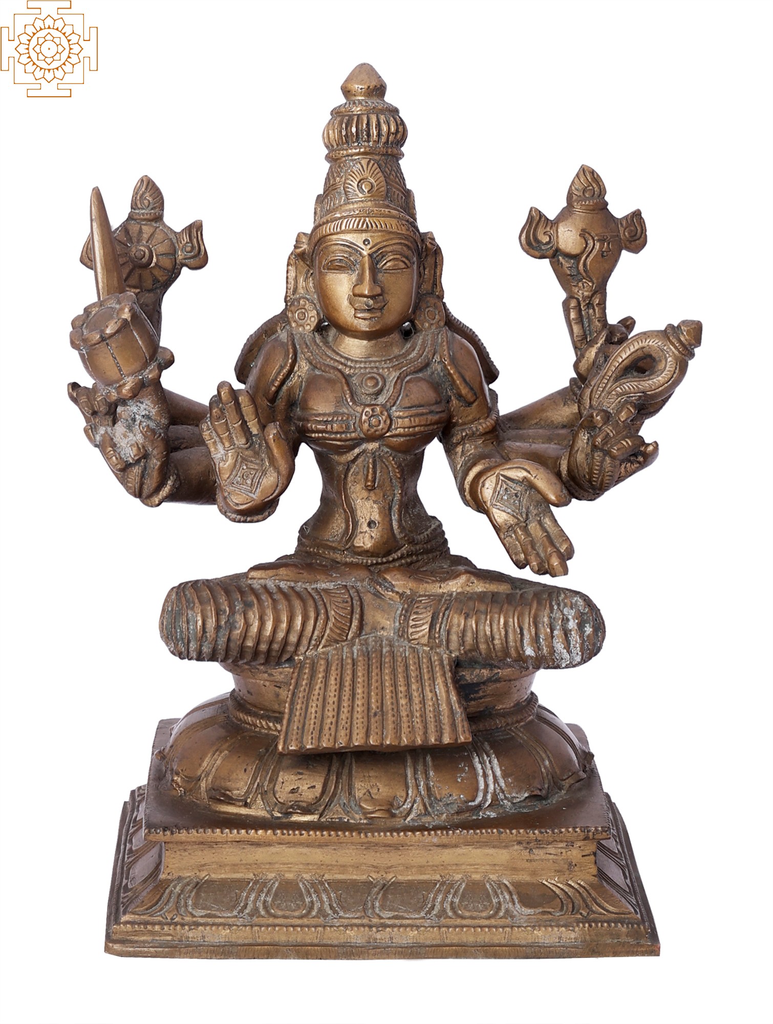 Magnificently poised in the yogic ‘padmasana,’ this image of Lakshmi truly defines her presence as our beloved mother goddess that presents benevolence, abundance, and posterity, along with the powerfully divine energy, or Shakti, as part of the great triad of Trimurti along with Parvati and Saraswati. Seated on a raised double lotus plinth, Lakshmi’s image – made in the ‘madhuchista vidhana’ or lost wax technique of casting – embodies her boon granting benevolence (as seen in the ‘varada mudra’) and the fear dispelling fierce form (as seen in the ‘abhaya mudra’). The various attributes that she holds in her remaining six hands, that is, the ‘sudarshana chakra,’ the conch, the noose, the sword, a cup, and the lotus, attest to her multifaceted persona.