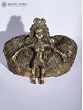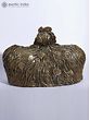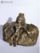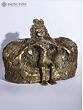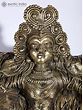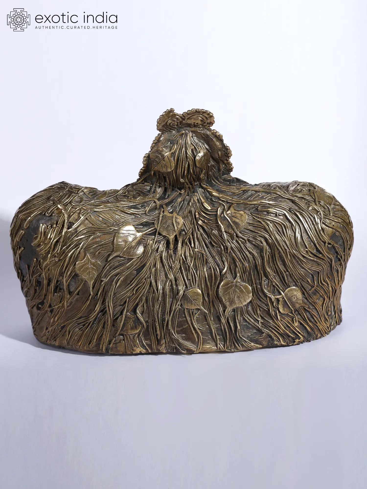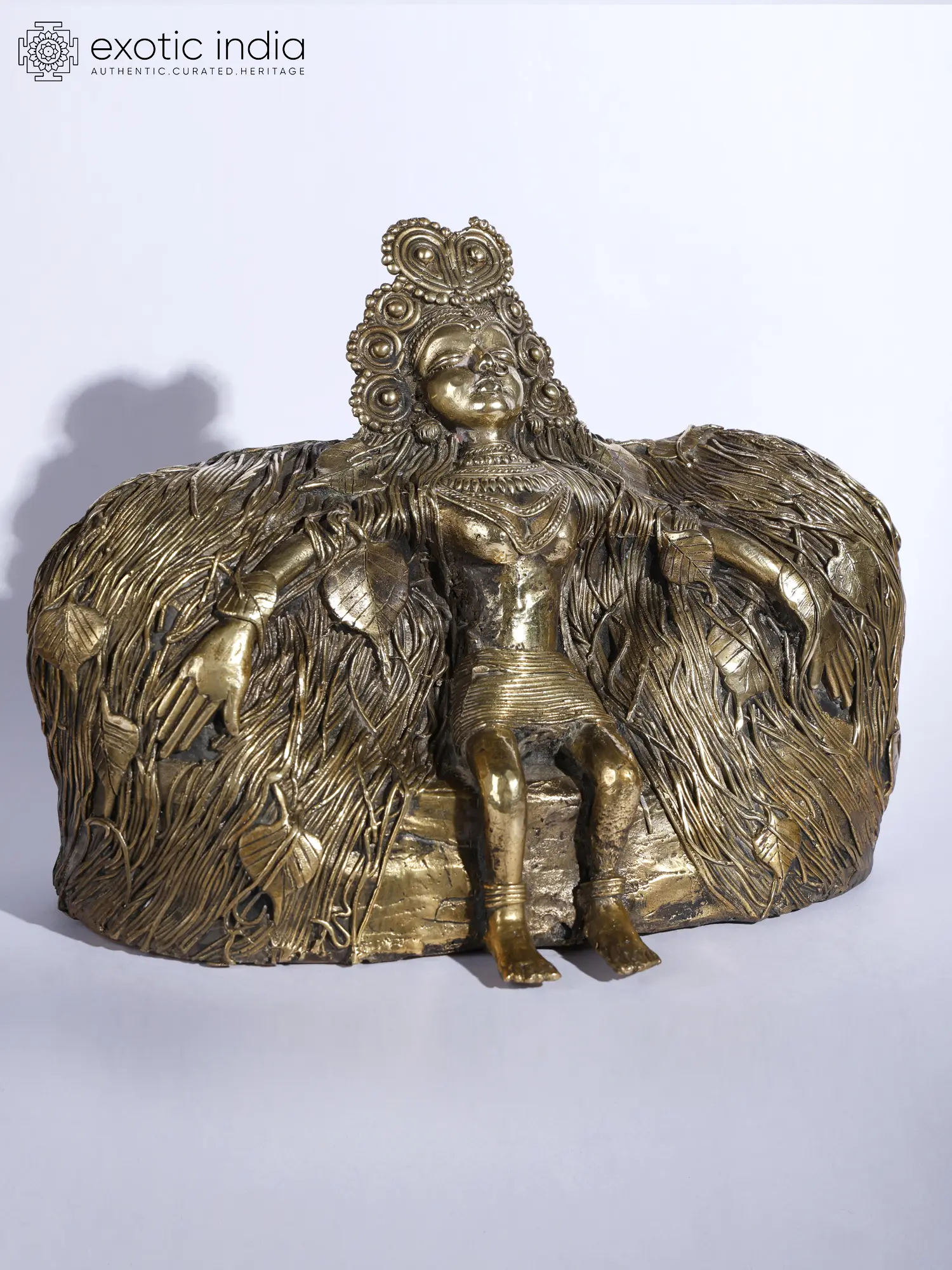 This Brass and Stone sculpture showcases the image of Dharti Mata (Mother Earth) in exquisite Dhokra craftsmanship, rendering a poignant and evocative image of the divine entity. Here, Dharti Mata is depicted seated upon a stone throne, symbolizing her regal and nurturing presence that might have been inspired by Girish Karnard’s movie Cheruvi. The intricate detailing of her hair, resembling the roots of the Banyan tree or Vat Vruksha, intertwined with the leaves of the Peepal tree, evokes a profound connection to nature and the cycle of life.