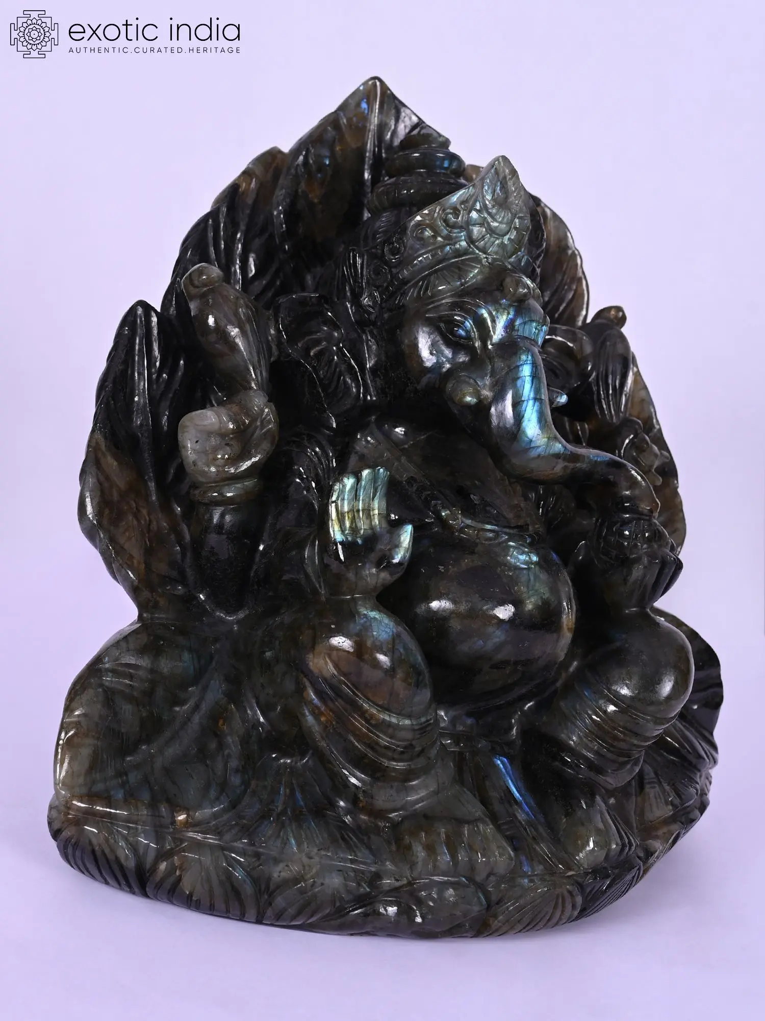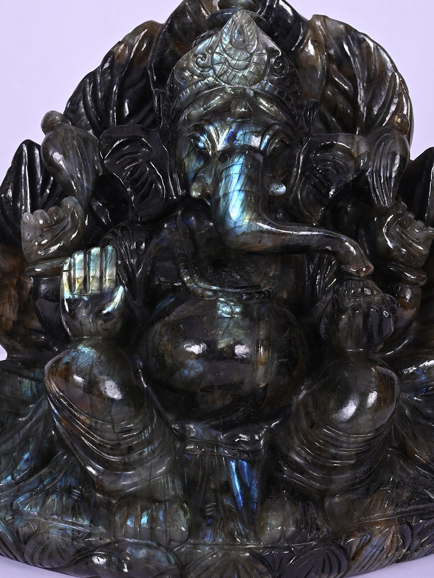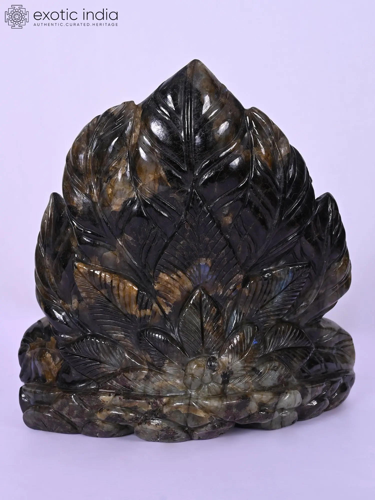 Rendered in a generous scale, approximately 10 inches in height, this statue commands attention through its commanding presence and captivating luminescence. The stone's natural variations and play of light, particularly the iridescent blues and greens that flash with movement, imbue the sculpture with an otherworldly aura. You'll appreciate the masterful interplay of light and shadow, highlighting the rich texture and depth of the carving, measuring approximately 9.5 inches in length and 6.5 inches in width.