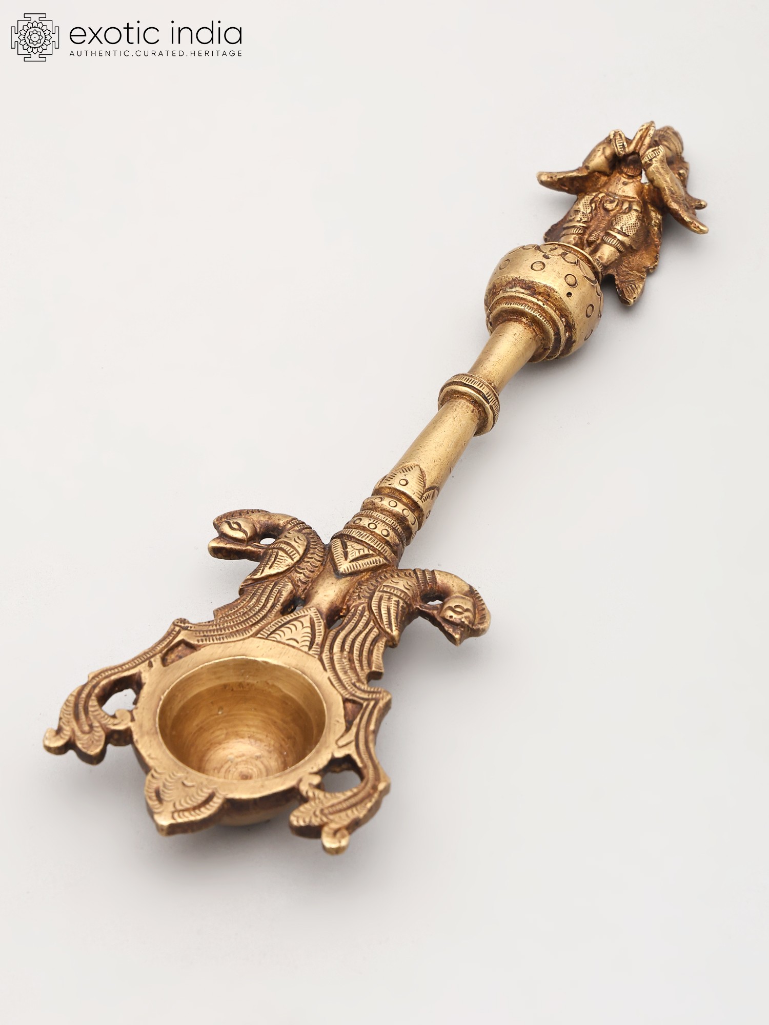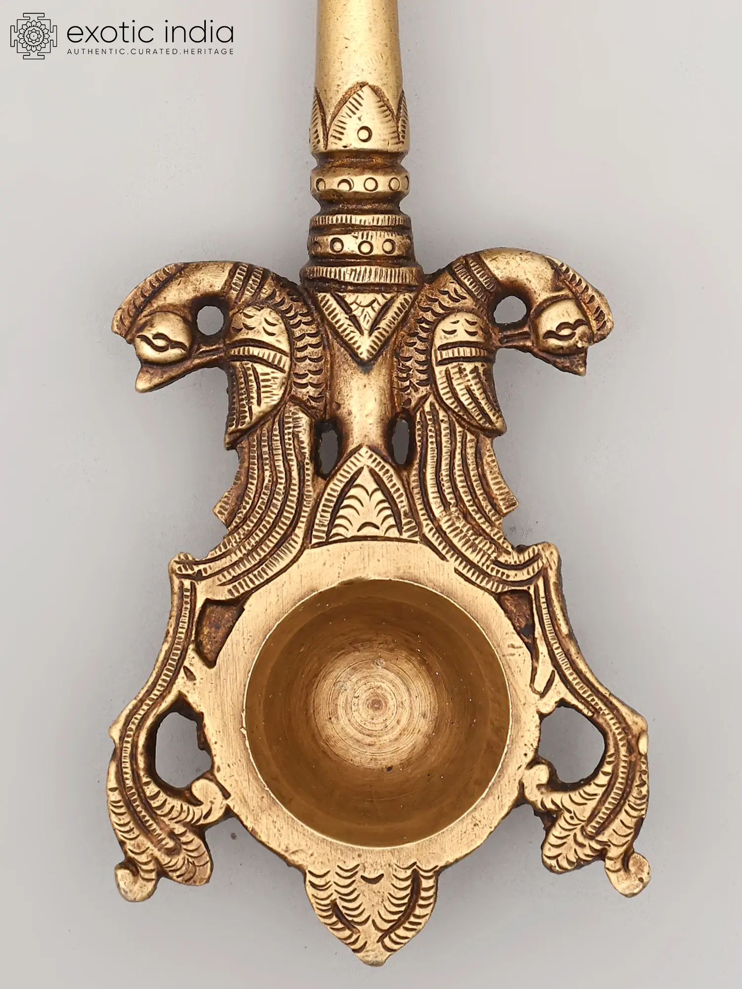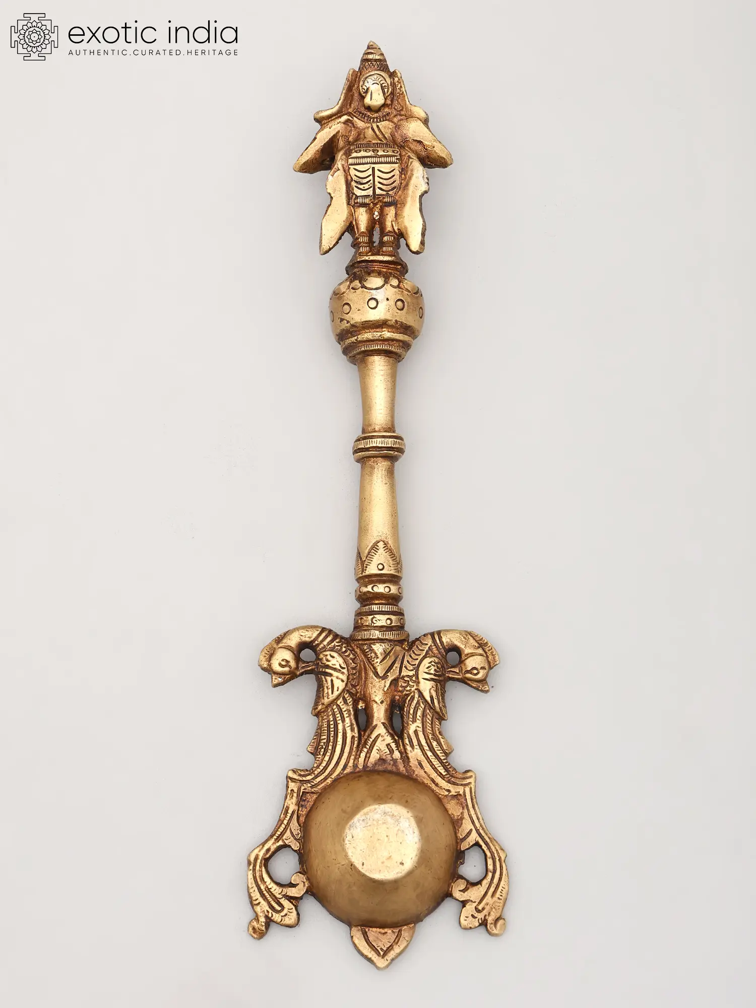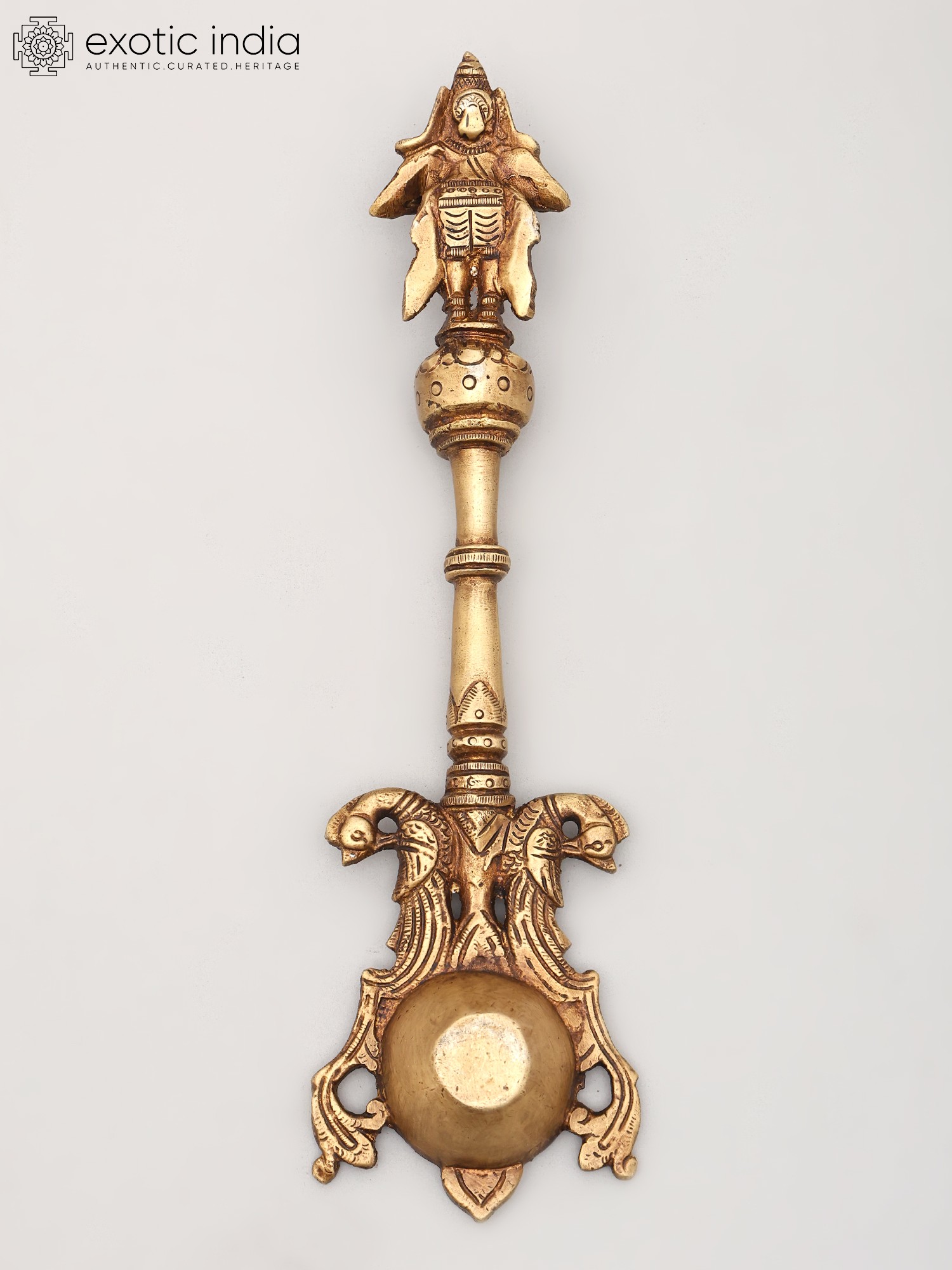 The spoon itself is not merely a functional object but a work of art imbued with spiritual significance. The top of the handle features a finely sculpted representation of Garuda, capturing his divine essence and readiness for flight. This imagery is more than decorative; it is a constant invocation of Garuda's protective presence during sacred rituals. The lower portion of the spoon is adorned with a pair of intricately rendered twin heads, possibly representing mythical creatures or symbolic guardians that further enhance its spiritual aura. These detailed carvings, executed by skilled artisans, speak to the rich tradition of Indian metalwork, where every element is infused with meaning. The brass, a metal revered in Vedic traditions for its purity and ability to conduct spiritual energy, lends an aura of sanctity and timelessness to this piece.