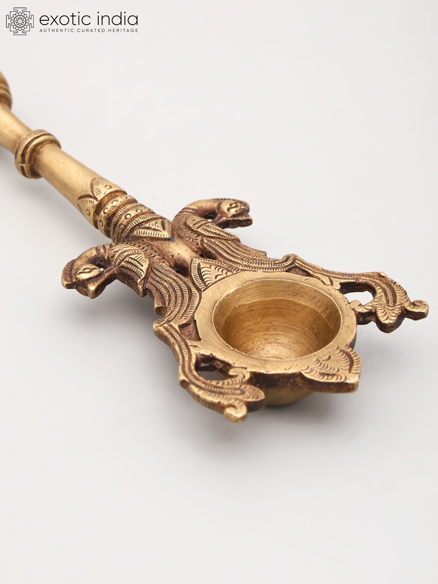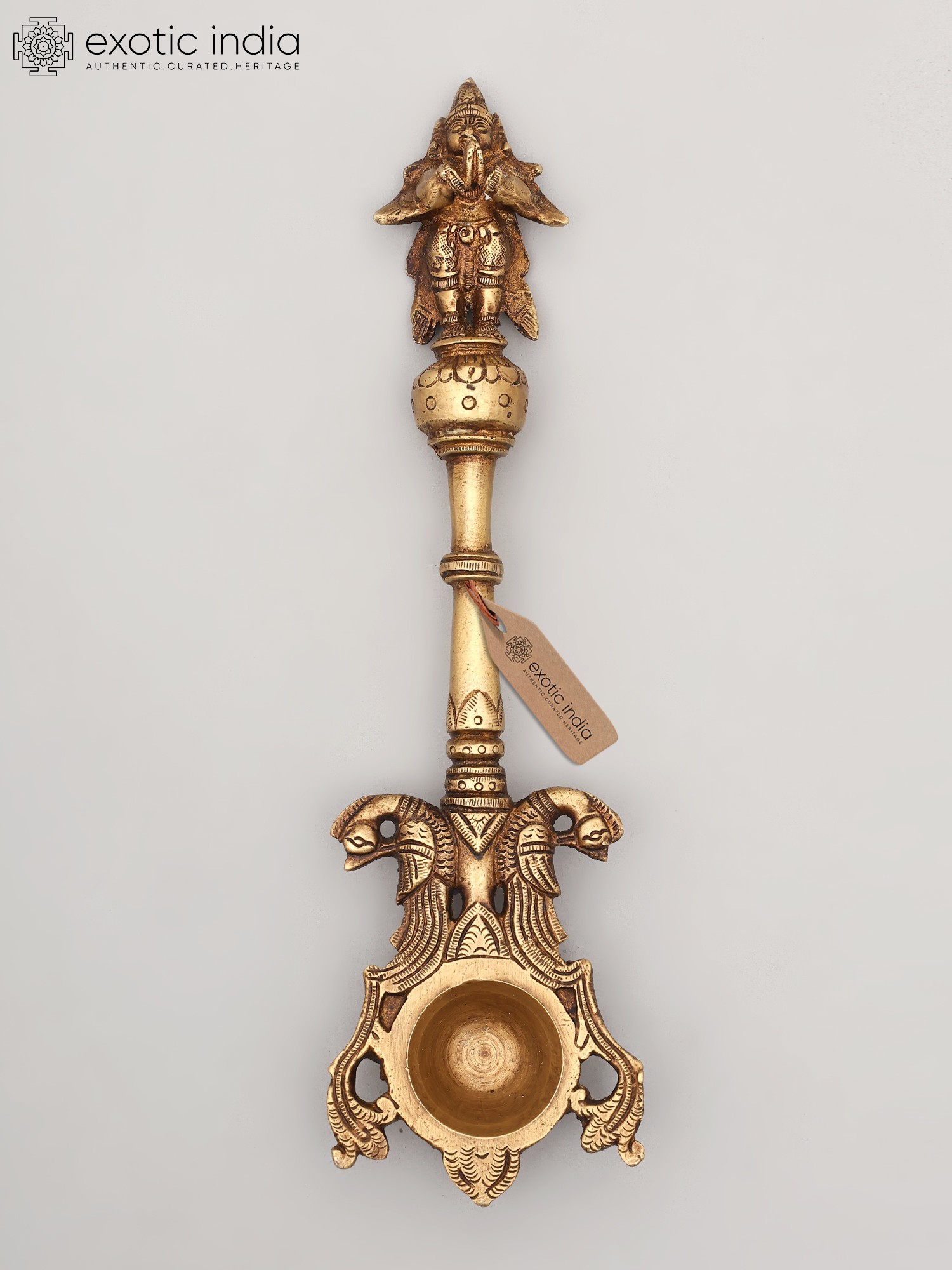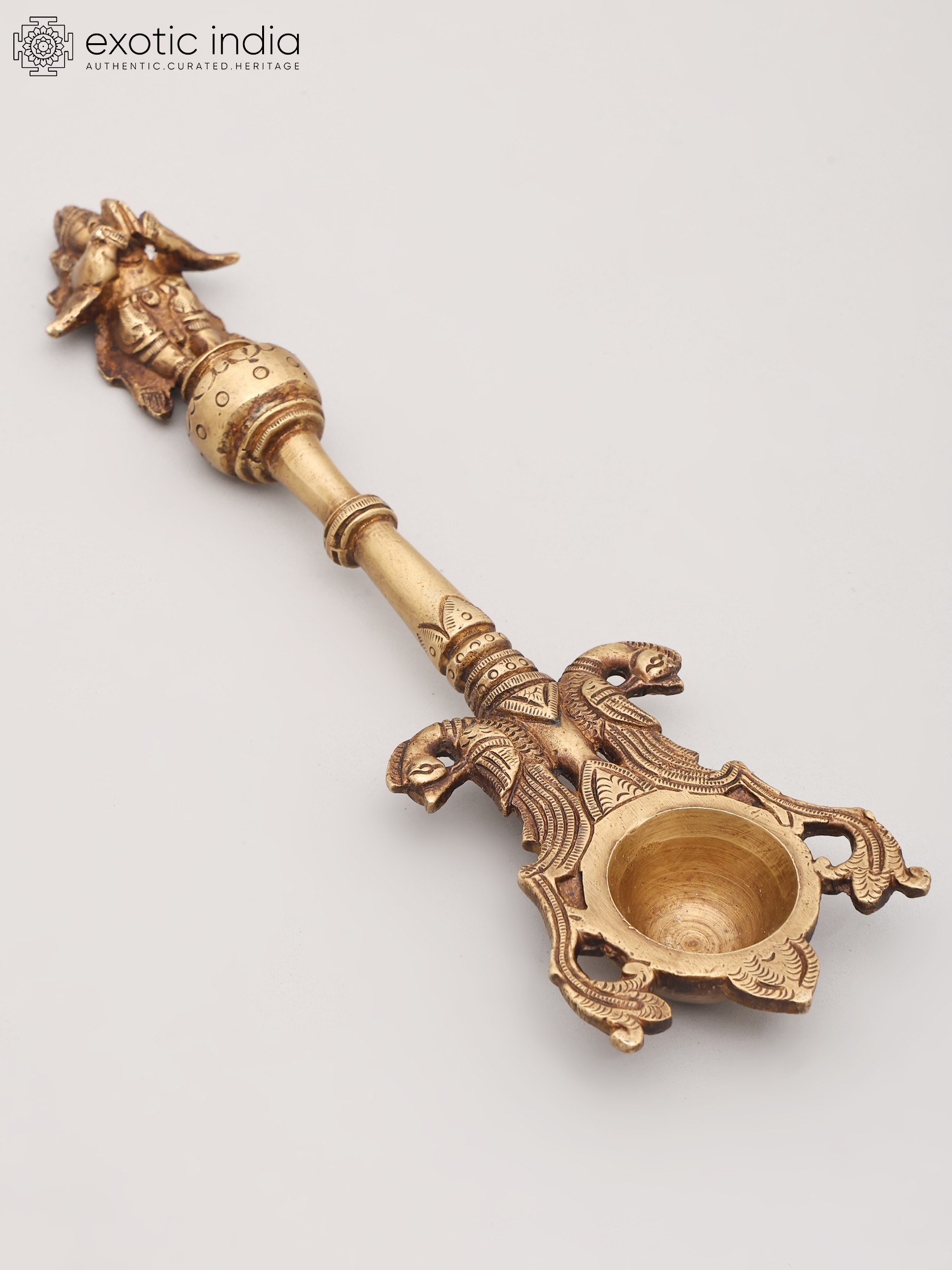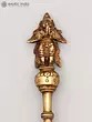 The spoon itself is not merely a functional object but a work of art imbued with spiritual significance. The top of the handle features a finely sculpted representation of Garuda, capturing his divine essence and readiness for flight. This imagery is more than decorative; it is a constant invocation of Garuda's protective presence during sacred rituals. The lower portion of the spoon is adorned with a pair of intricately rendered twin heads, possibly representing mythical creatures or symbolic guardians that further enhance its spiritual aura. These detailed carvings, executed by skilled artisans, speak to the rich tradition of Indian metalwork, where every element is infused with meaning. The brass, a metal revered in Vedic traditions for its purity and ability to conduct spiritual energy, lends an aura of sanctity and timelessness to this piece.