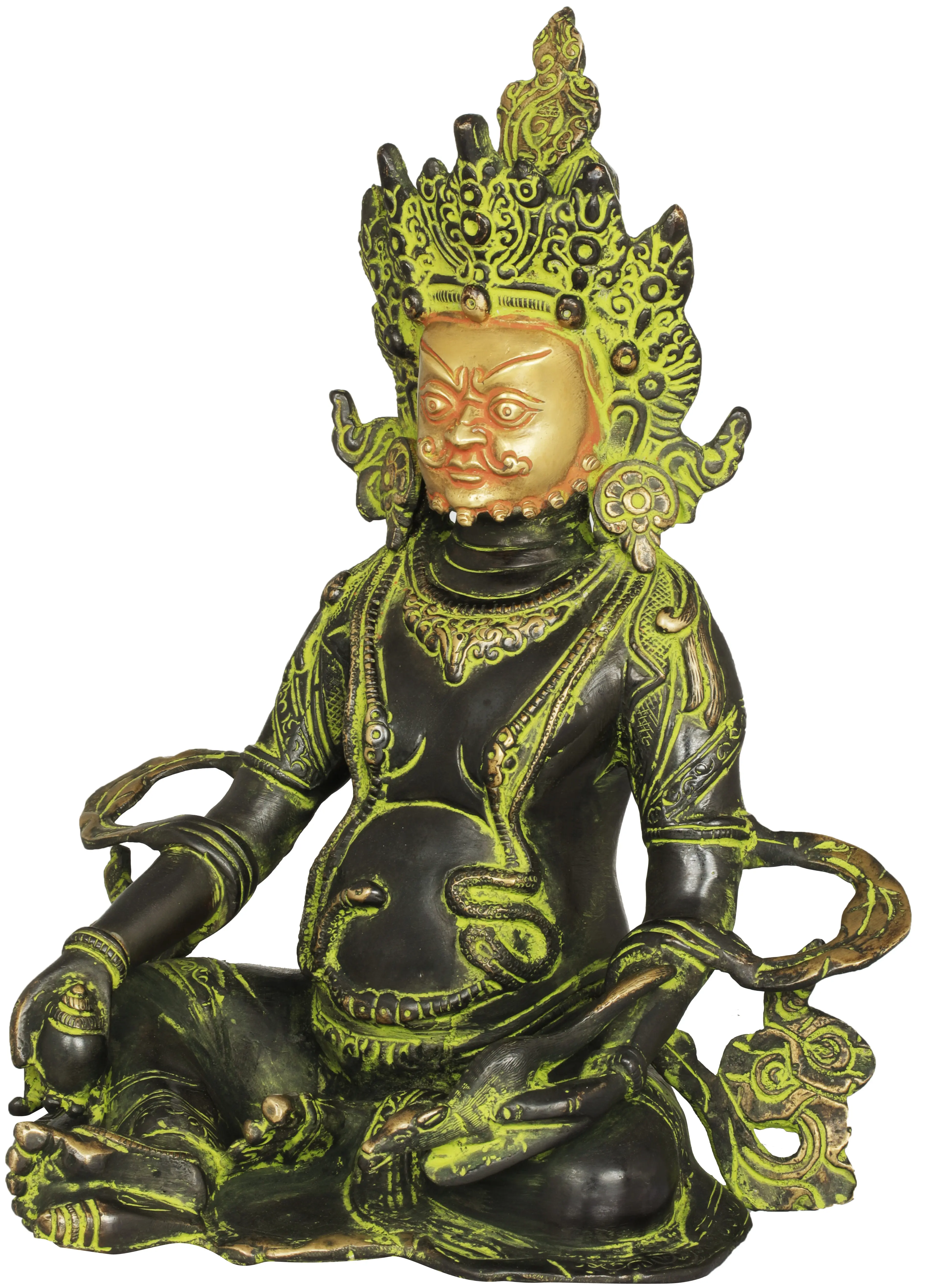 The regal posture of the deity, seated in a meditative yet commanding stance, reflects his supreme authority over the celestial treasury. The intricate crown and ornate jewelry signify his royal status and the boundless treasures he oversees. The serpent motifs often associated with Kubera represent fertility, abundance, and the cyclical nature of wealth. His stern yet benevolent expression conveys a sense of justice and responsibility, reminding us that true wealth lies not only in possession but also in its wise management and equitable distribution. This statue serves as a powerful visual reminder of these virtues. ––––––––––