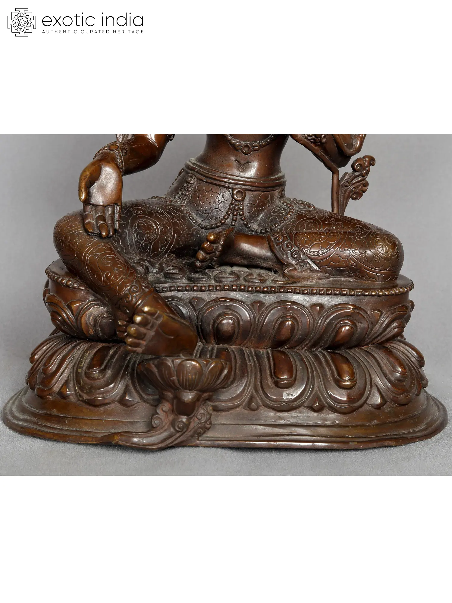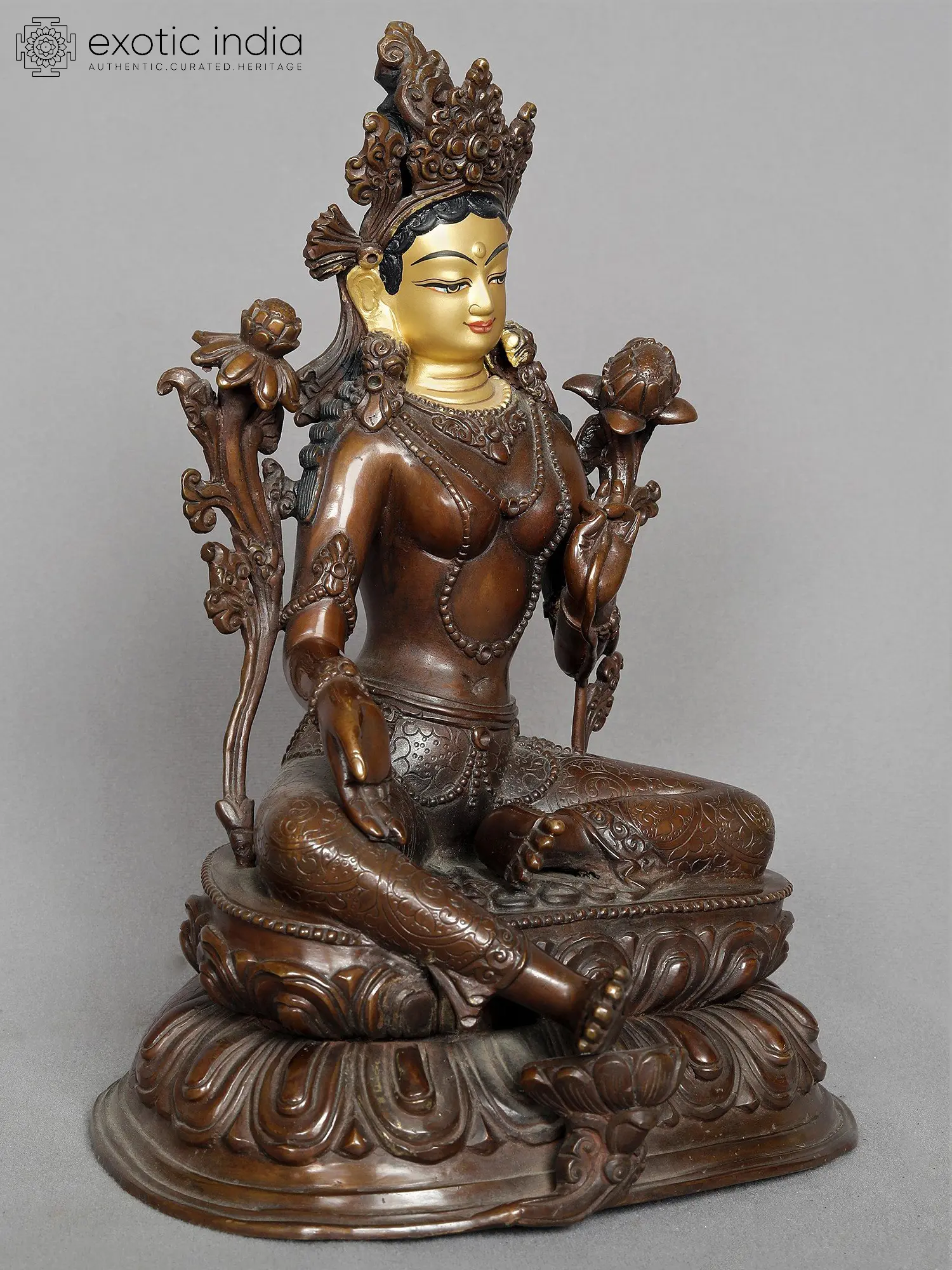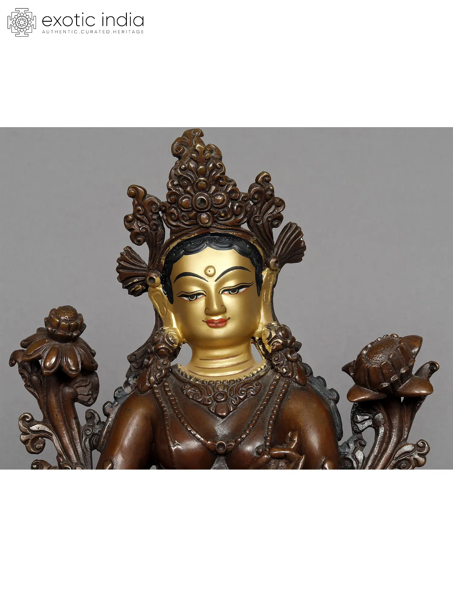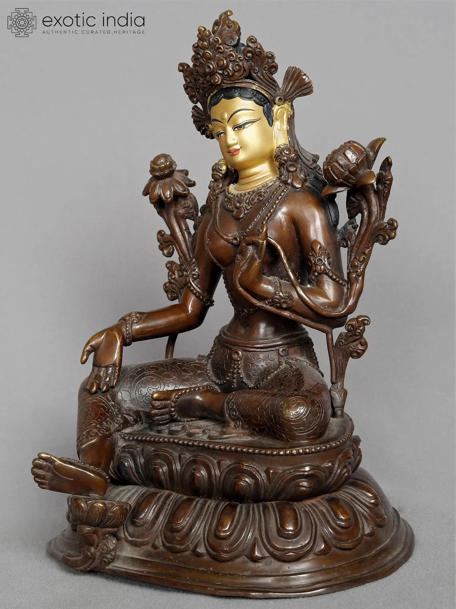 Discover the grace and power of Green Tara, a revered female bodhisattva in Mahayana Buddhism. Seated in poised readiness, she exudes compassion and wisdom. The Utpala lotus she holds in her left hand signifies purity and enlightenment. With a serene expression, she offers refuge and grants wishes through varada and abhaya mudras. Jewels on her crown represent spiritual wealth. Crafted with precision, the copper statue boasts intricate gold gilding, a testament to Nepal's rich traditions. Buddhists believe that by chanting her mantra, you can develop compassion, wisdom and spiritual strength. Invite the divine presence of Green Tara to let her guide your path to enlightenment.