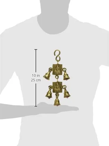 Welcome the footsteps of Devi Lakshmi with the wealth of the three realms, in every tap on your door, with this handmade brass Lakshmi door hanging with bells. Attached to an inverted-S-shaped hook, two emblems linked to each other are empowered by the icons of Devi Lakshmi, in her characteristic form. Two bells on each side and one on the lowermost part of the wall hanging add the auspicious element of Dhvani or sound to the composition, making this an aesthetic and fortuitous décor article for your space.
