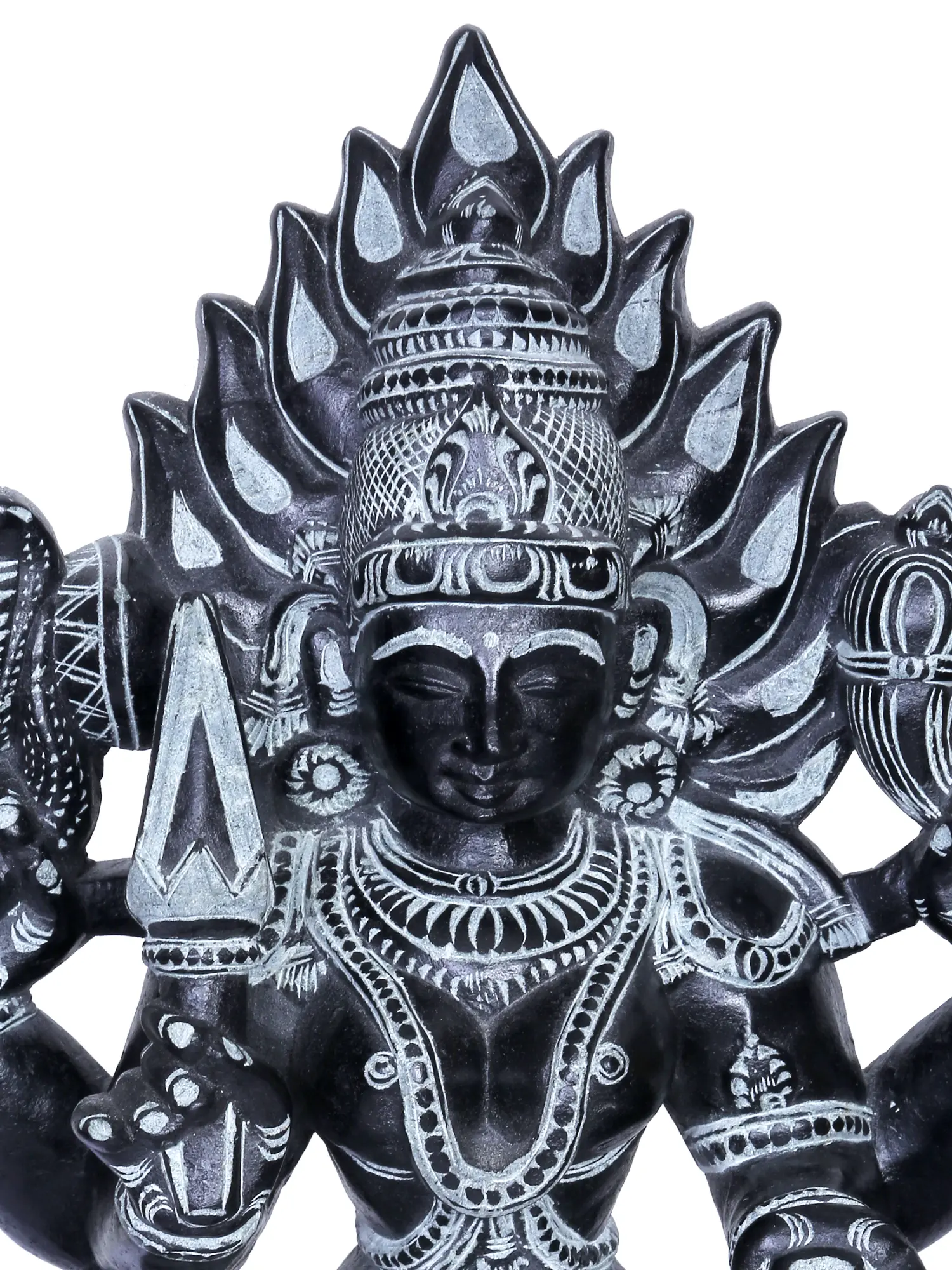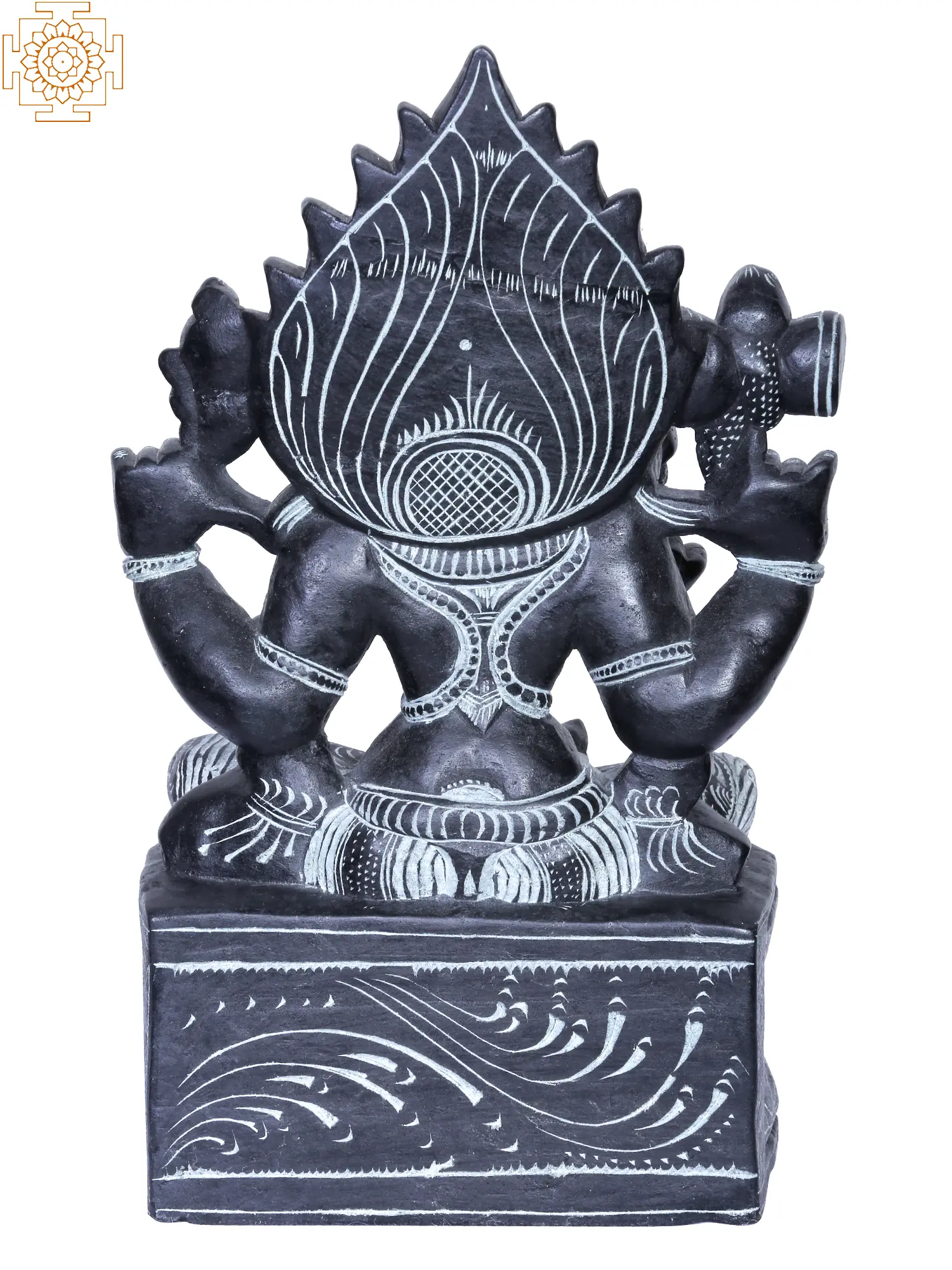 This exquisite stone statue captures the powerful form of Goddess Mariamman, a revered deity in South India, often associated with the fierce and protective aspects of Durga. Crafted with remarkable skill in the renowned stone carving hub of Mahabalipuram, this piece is a testament to centuries of artistic tradition. The intricate details, etched into the dark stone with contrasting white highlights, bring the divine presence to life, making it a captivating focal point for any sacred space or home altar. The Goddess is depicted in a regal seated posture, radiating an aura of strength and compassion. Her numerous arms, a common depiction of the divine's omnipresence and multi-faceted abilities, hold symbolic objects that speak to her powers. The presence of the serpent, often coiled around her arm or depicted in her iconography, signifies her mastery over primal energies and her role as a protector against malevolent forces. Her serene yet resolute expression conveys her unwavering commitment to safeguarding her devotees from illness, misfortune, and evil. In the pantheon of Hindu deities, Mariamman is especially invoked for her healing powers and her ability to bestow boons. Tales abound of her miraculous interventions, where she has protected villages from epidemics and brought prosperity to those who worship her with devotion. She is particularly revered during the Tamil month of Adi, a time of significant worship and festivals dedicated to her. This statue serves as a tangible connection to these ancient traditions and the deep spiritual reverence she inspires.