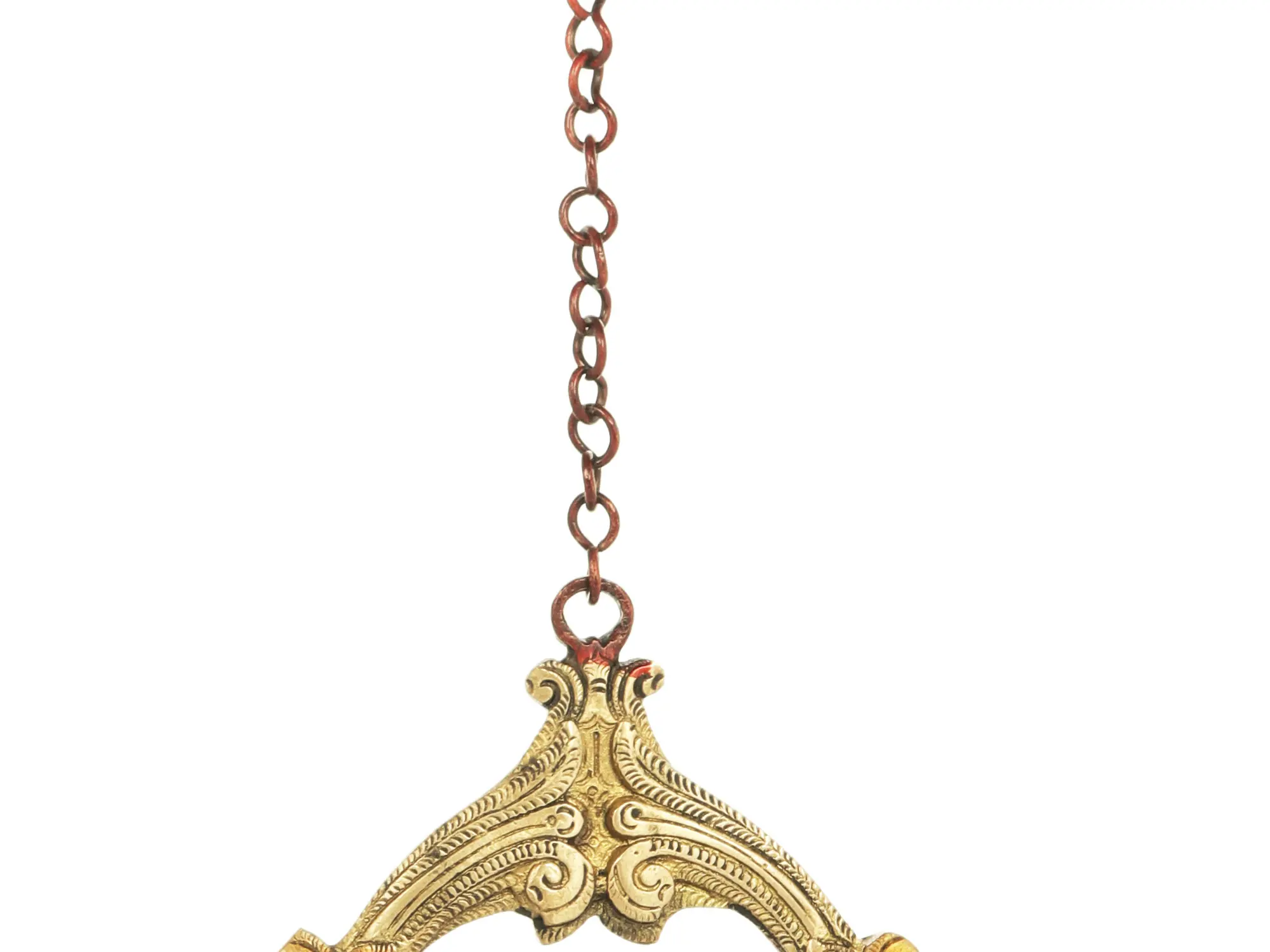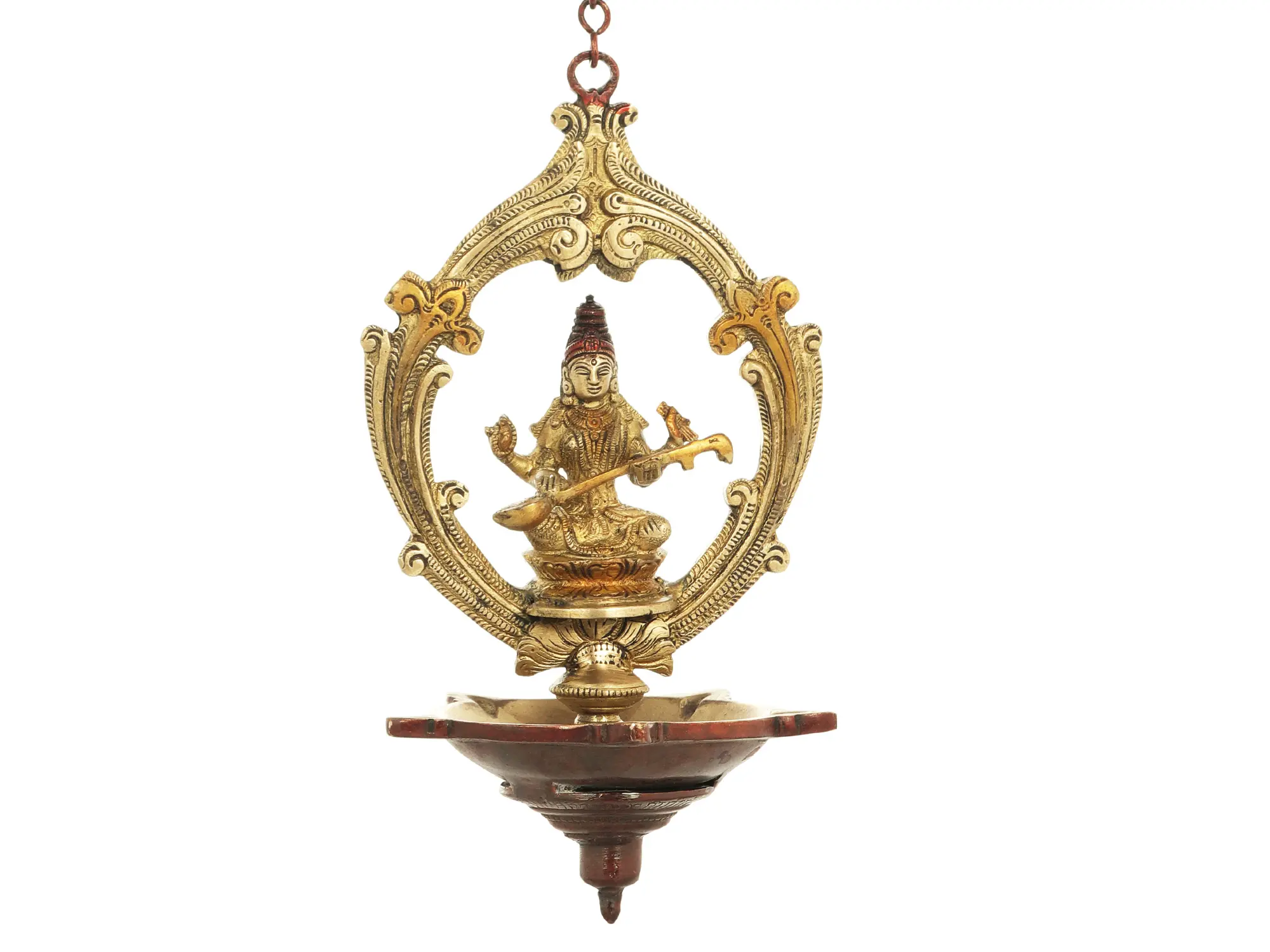 This hanging lamp made of brass is assisted with the divine image of the goddess of knowledge and wisdom, Goddess Saraswati, also known as Vaagdevi. The lamp consists of a strong chain and hook to help the lamp remain suspended. The Five wick lamp contains a central image of Goddess Saraswati. The Veena in her hand represents her status as the patron of the Arts. The Vedas, or books, reflect the Truth or pure knowledge. Japa Mala, or stringed beads, signify discipline, focus, and meditation. This lamp with a fine combination of brown and gold tint is an ideal ritual object to connect the divine energy of fire with that of wisdom. When lit the soothing flame of wicks is supposed to offer worship to the sacred image of Goddess Saraswati and channelise her blessings.