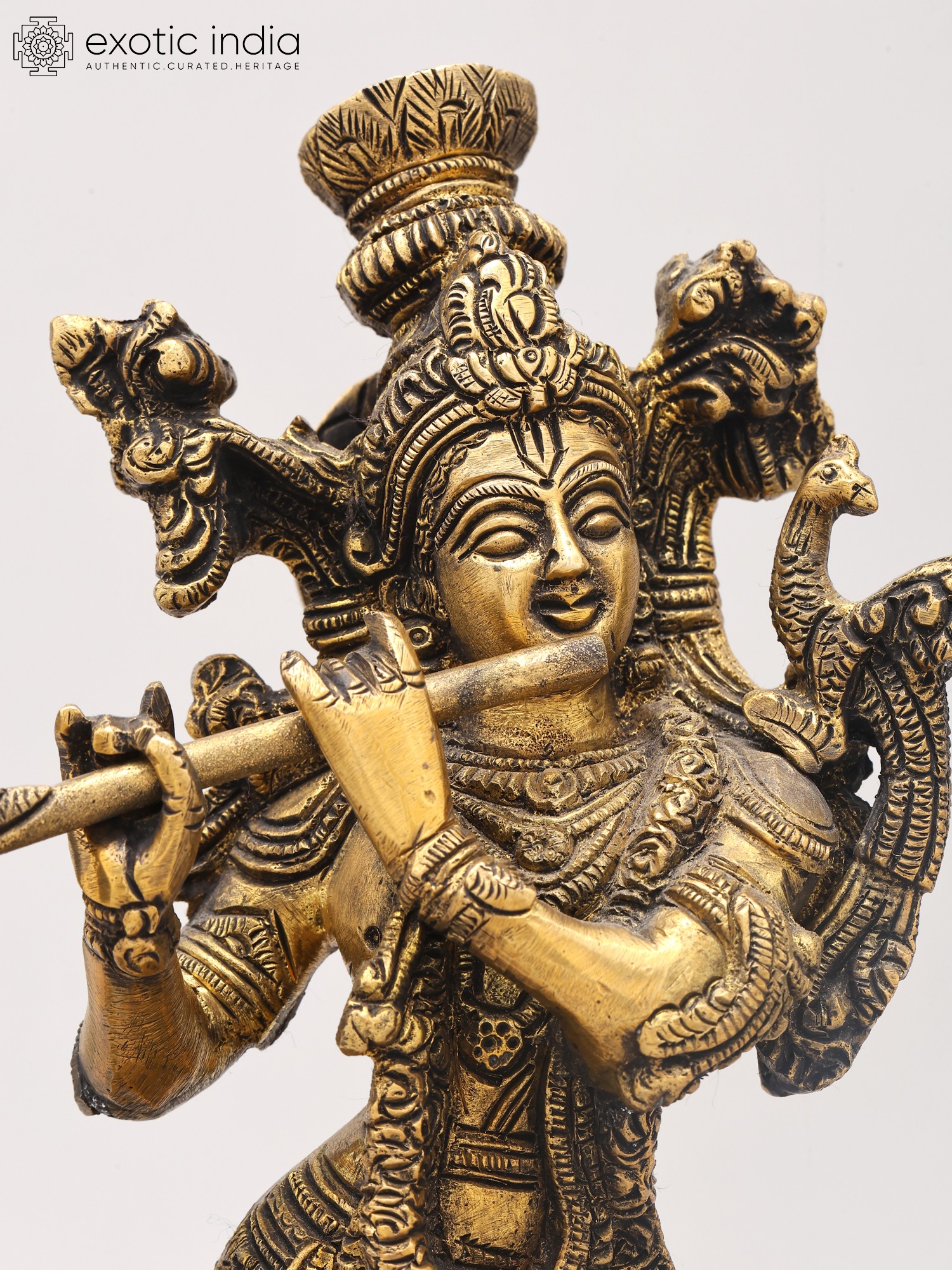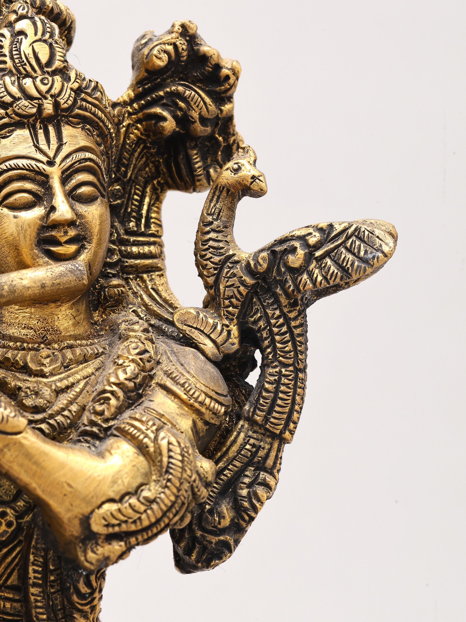 7" Fluting Lord Krishna with Cow and Peacock | Brass Statue