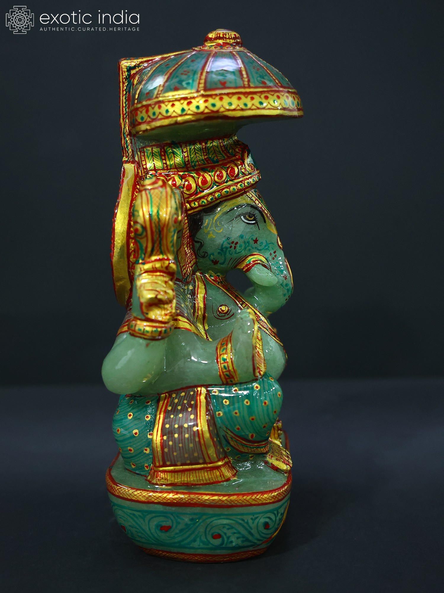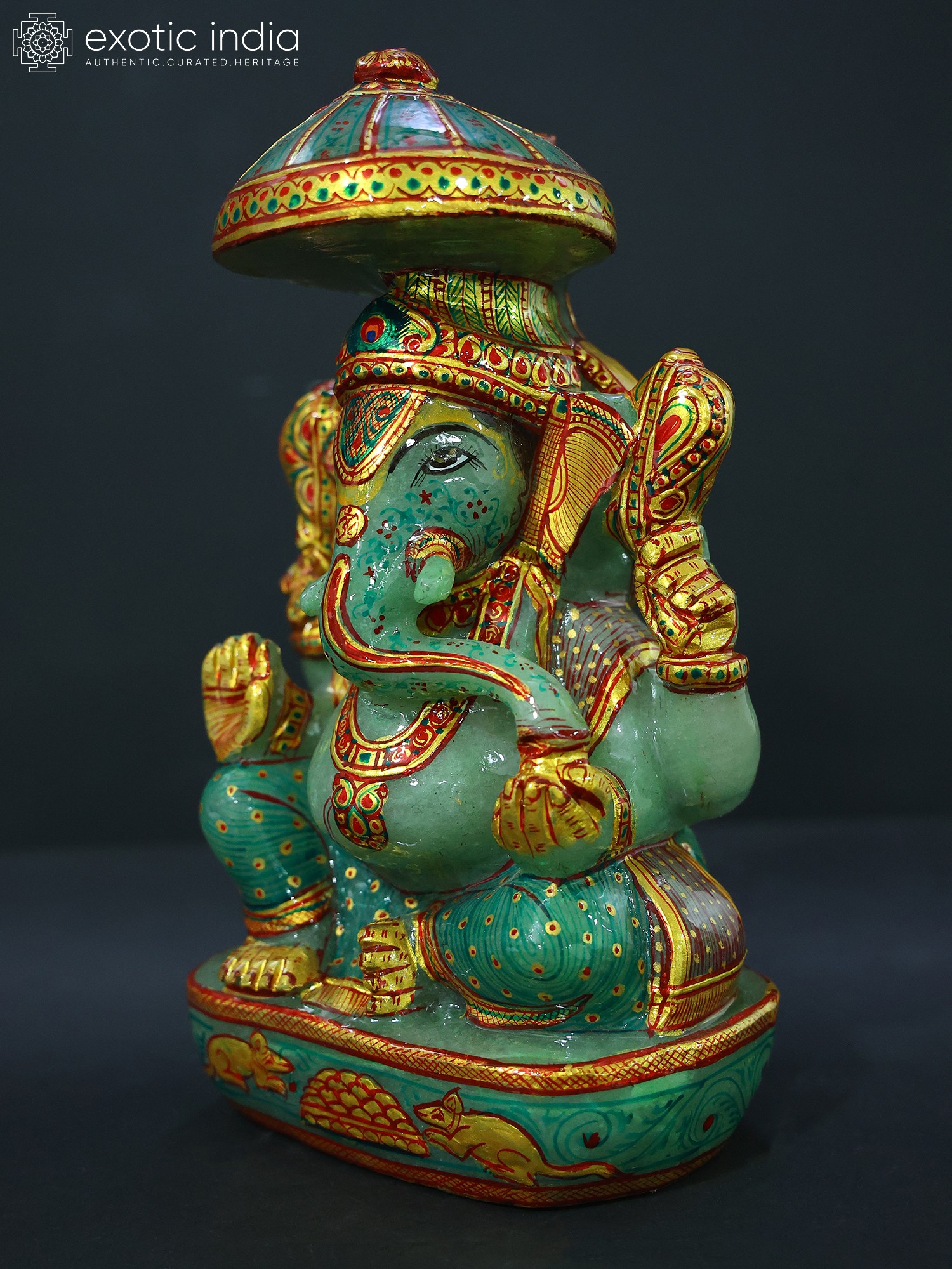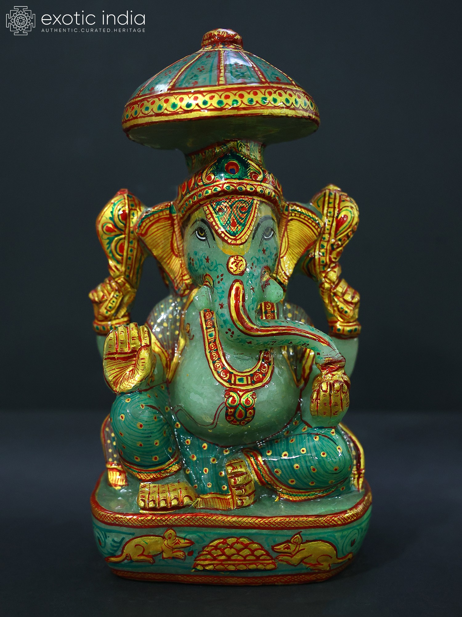 The statue is further adorned with vibrant, hand-painted embellishments in rich gold, red, and emerald green. These colors are not merely decorative; they carry deep symbolic meaning within Hindu iconography. Gold signifies divinity, purity, and auspiciousness, while red represents energy, passion, and fertility. Green, the color of the aventurine itself, is often associated with growth, healing, and abundance. The delicate patterns and motifs that adorn Ganesha’s attire and crown evoke a sense of regal splendor, reflecting his status as the king of the Devas. The umbrella-like structure above his head, also intricately painted, symbolizes divine protection and sovereignty. The base of the statue is equally detailed, featuring depictions of the Mushika, Ganesha’s vaahana (mount) – the humble mouse. The mouse, despite its small size, is a powerful symbol of desire and sensory gratification. By conquering and taming his own desires, Ganesha demonstrates his mastery over the material world, enabling him to overcome all obstacles. This thoughtful inclusion adds another layer of meaning to the sculpture, reminding viewers of the importance of self-control and spiritual discipline. This magnificent green aventurine Ganesha is more than just an idol; it is a testament to ancient craftsmanship and a conduit for divine blessings. Whether placed in a home, office, or meditation space, it is sure to radiate an aura of peace, prosperity, and spiritual upliftment, echoing the timeless wisdom and benevolent presence of Lord Ganesha.