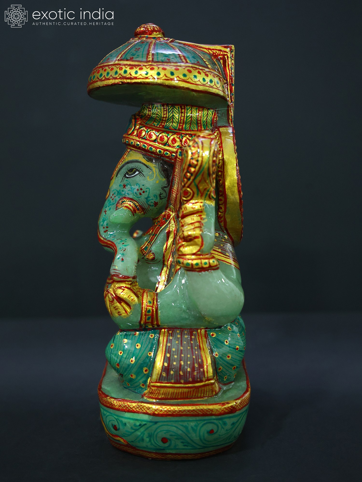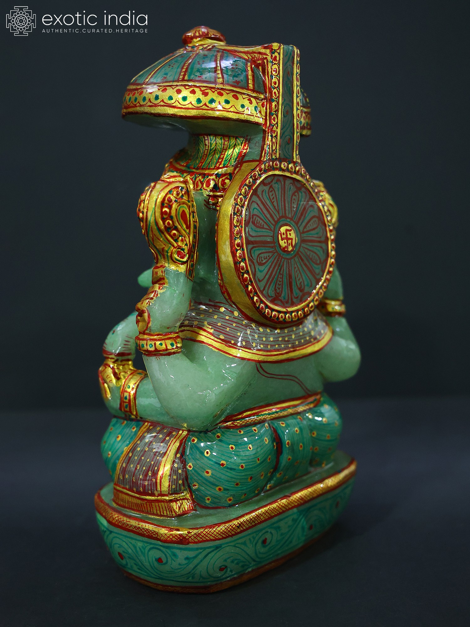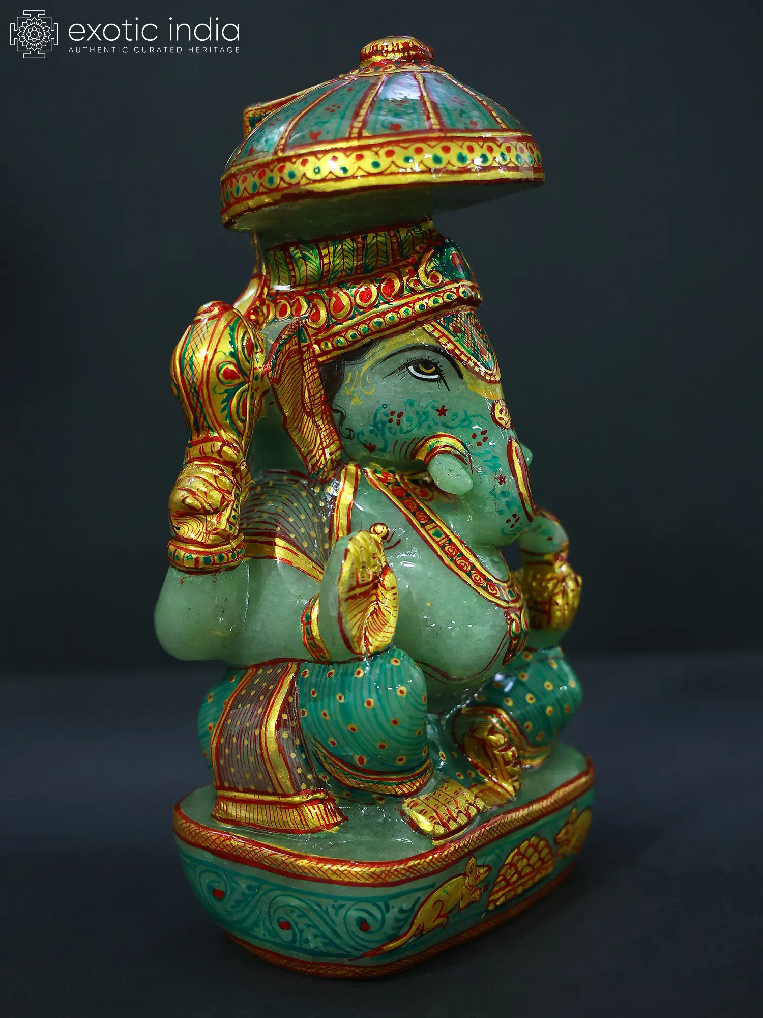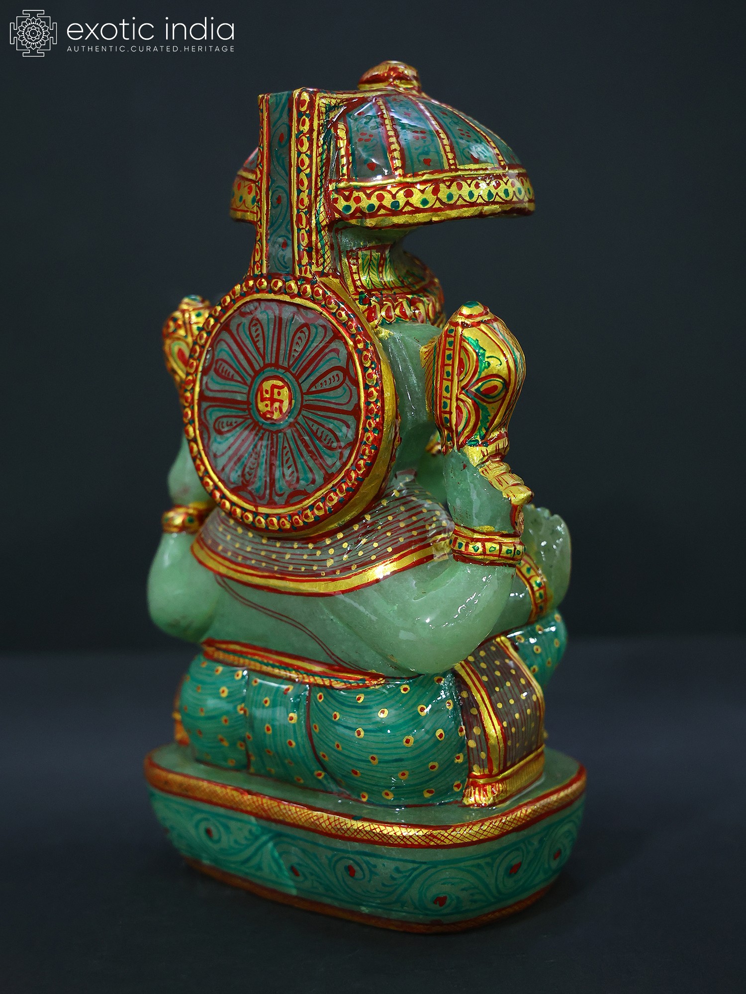 The statue is further adorned with vibrant, hand-painted embellishments in rich gold, red, and emerald green. These colors are not merely decorative; they carry deep symbolic meaning within Hindu iconography. Gold signifies divinity, purity, and auspiciousness, while red represents energy, passion, and fertility. Green, the color of the aventurine itself, is often associated with growth, healing, and abundance. The delicate patterns and motifs that adorn Ganesha’s attire and crown evoke a sense of regal splendor, reflecting his status as the king of the Devas. The umbrella-like structure above his head, also intricately painted, symbolizes divine protection and sovereignty. The base of the statue is equally detailed, featuring depictions of the Mushika, Ganesha’s vaahana (mount) – the humble mouse. The mouse, despite its small size, is a powerful symbol of desire and sensory gratification. By conquering and taming his own desires, Ganesha demonstrates his mastery over the material world, enabling him to overcome all obstacles. This thoughtful inclusion adds another layer of meaning to the sculpture, reminding viewers of the importance of self-control and spiritual discipline. This magnificent green aventurine Ganesha is more than just an idol; it is a testament to ancient craftsmanship and a conduit for divine blessings. Whether placed in a home, office, or meditation space, it is sure to radiate an aura of peace, prosperity, and spiritual upliftment, echoing the timeless wisdom and benevolent presence of Lord Ganesha.