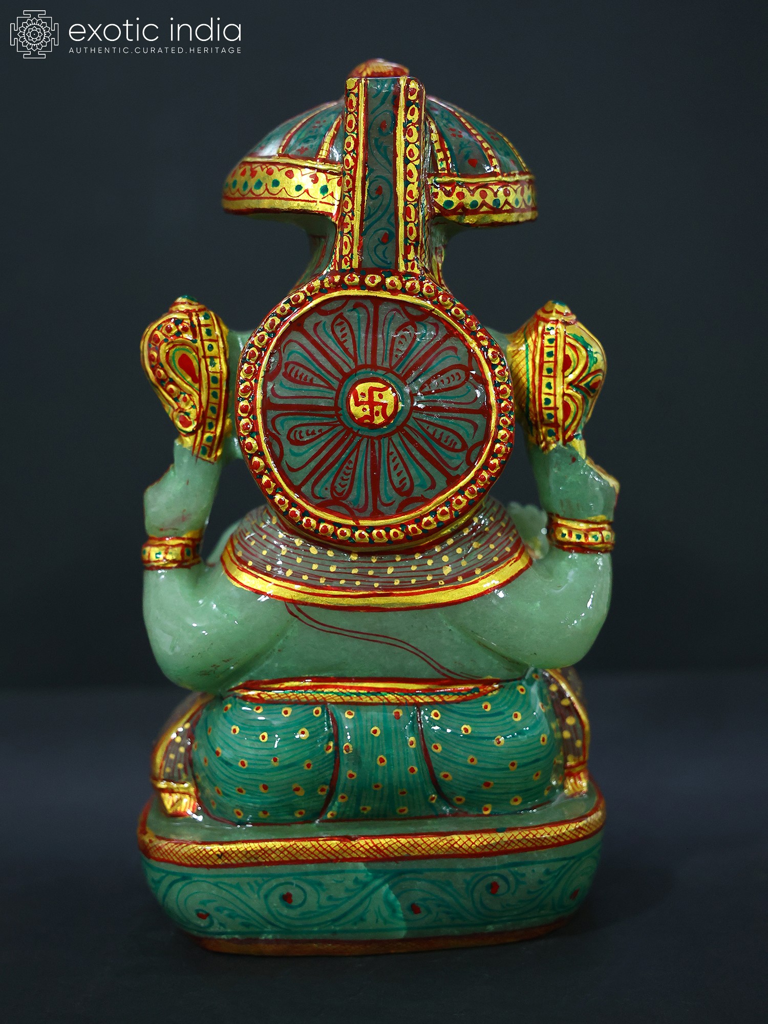 This exquisite statue captures the divine presence of Lord Ganesha, the beloved elephant-headed deity revered as the remover of obstacles, the patron of arts and sciences, and the intellect. Crafted from translucent green aventurine gemstone, its serene hue is further enhanced by intricate hand-painted details that bring the divine figure to life. The gemstone itself is steeped in lore, often associated with luck, prosperity, and emotional well-being, making this representation of Ganesha a potent symbol of good fortune and spiritual balance. The artistry evident in this piece is truly remarkable. Each curve and contour of Ganesha’s form has been meticulously hand-carved, showcasing the natural beauty of the aventurine. The deity is depicted in the Chaturbhuja form, signifying his four arms, which are traditionally associated with his power and control over the four cardinal directions and the elements. In this particular depiction, Ganesha is posed in a blessing mudra, his raised palm extended outwards, bestowing peace, prosperity, and protection upon the devotee. This gesture of abhaya mudra is a powerful symbol of reassurance and divine grace.