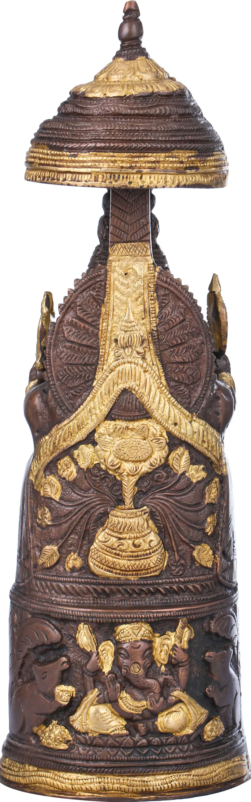 This statue is more than just an object of worship; it is a testament to the enduring legacy of Indian artistry. Each curve and contour is meticulously shaped by skilled hands, a tradition passed down through generations. The use of high-quality brass ensures its longevity, making it a cherished heirloom for years to come. The vibrant green and gold finish is not merely decorative but also imbues the piece with a sense of regality and spiritual significance. The majestic umbrella-like structure crowning the deity further enhances its grandeur, evoking imagery of divine authority and celestial protection. This piece is a beautiful addition to any altar, meditation space, or as a statement decor item in your living room, bringing a touch of sacred beauty and cultural richness.