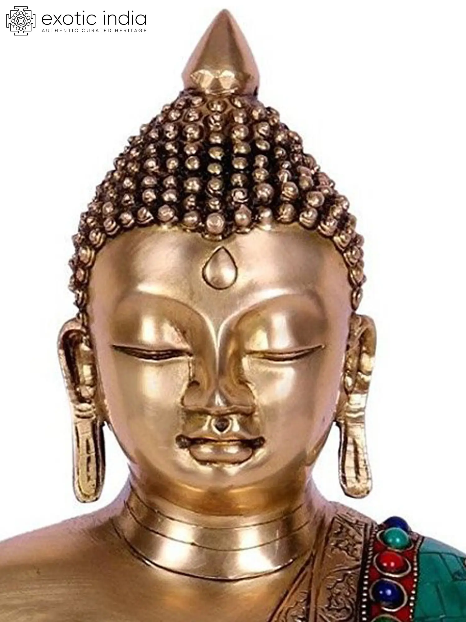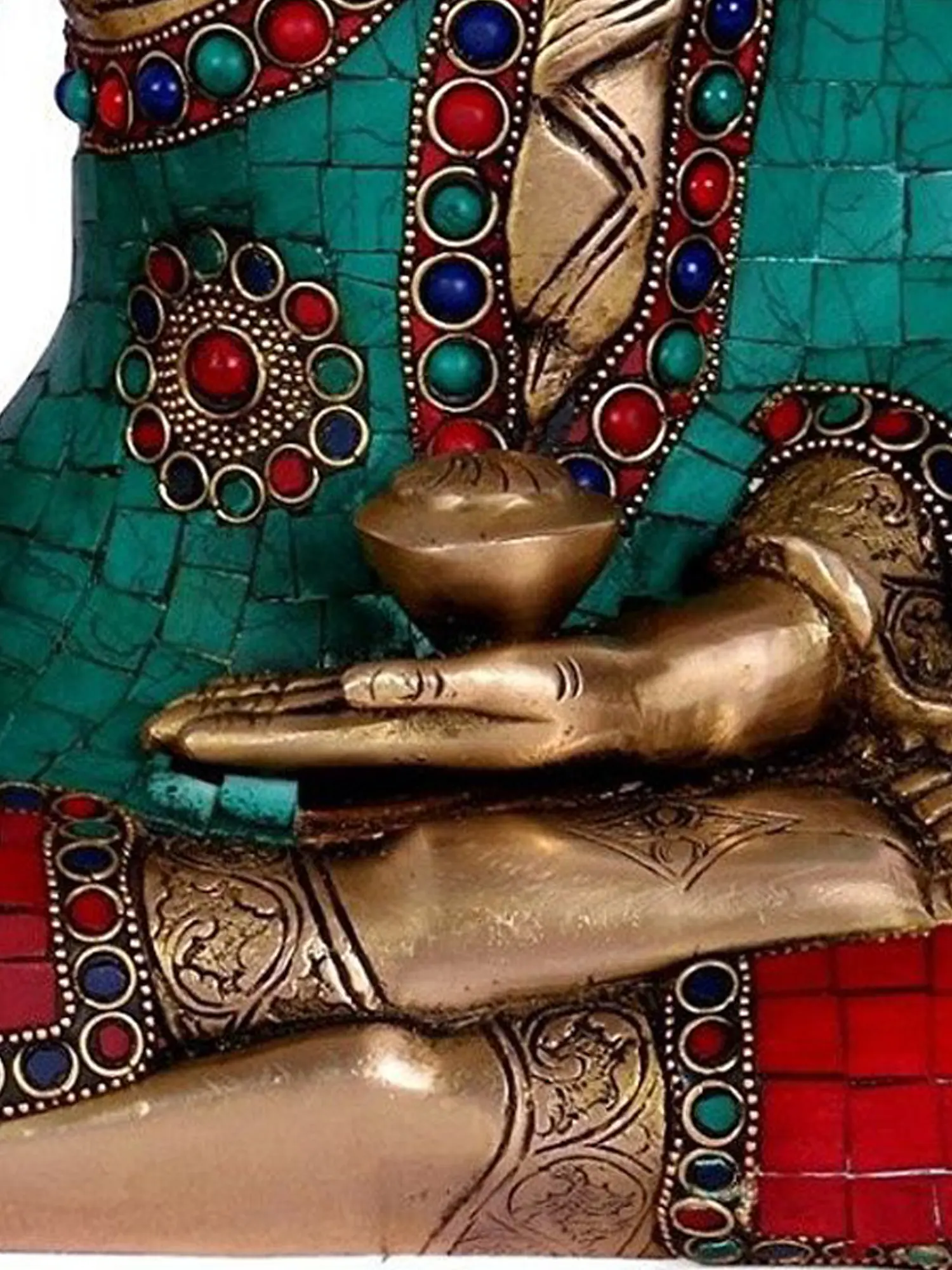 The traditional robes of the Buddha are brought to life with vibrant embellishments. The flowing garment, rendered in a striking turquoise hue, is meticulously inlaid with a mosaic of colourful stones. Deep red and vibrant blue stones, interspersed with the turquoise, create a dazzling pattern that catches the light and draws the eye. These gems are further framed by intricate brass work, adorned with delicate motifs that speak of ancient artistry and spiritual symbolism. The red hues, often associated with passion, energy, and auspiciousness in Indian culture, juxtaposed with the calming turquoise, represent a harmonious balance of forces. The meticulous inlay work is not merely decorative; it suggests the preciousness and rarity of the Buddha's teachings and the profound transformation they offer. The lower garment, covering his crossed legs, is adorned in a rich, earthy red, further enhancing the vibrancy of the composition. His legs are gracefully folded in the lotus posture, a symbol of purity, spiritual growth, and detachment from worldly desires. The left hand rests in his lap, palm facing upwards, in the Dhyana mudra, the gesture of meditation, symbolizing concentration and the pursuit of inner peace. This duality of mudras – the Bhumisparsha on the right and the Dhyana on the left – encapsulates the essence of Buddha's journey: the arduous meditation leading to enlightenment, sealed by his profound connection to the world and his ultimate victory over illusion. This statue is not just an object of art but a powerful reminder of the path to inner peace and enlightenment, a sacred icon crafted to inspire and uplift.