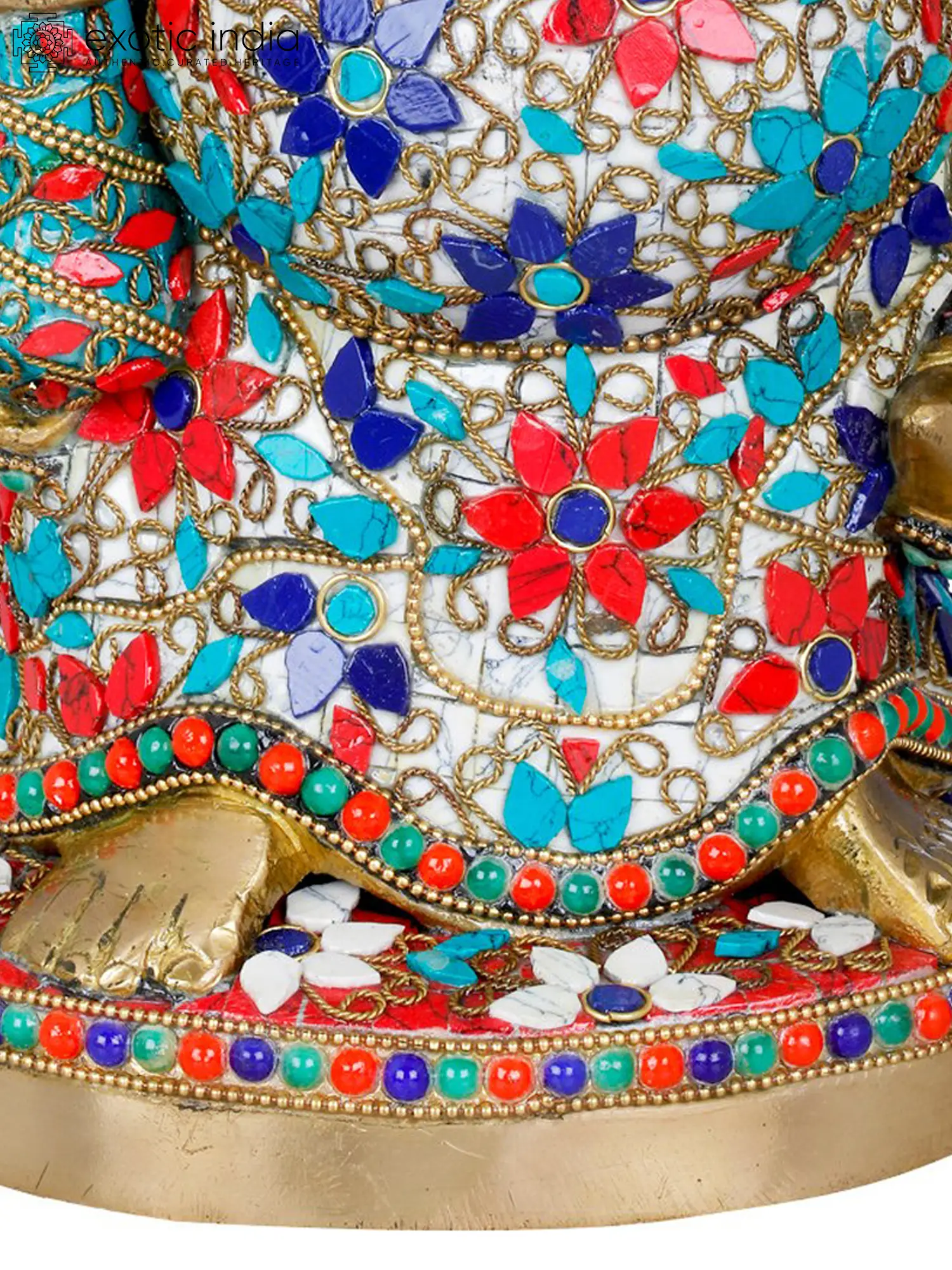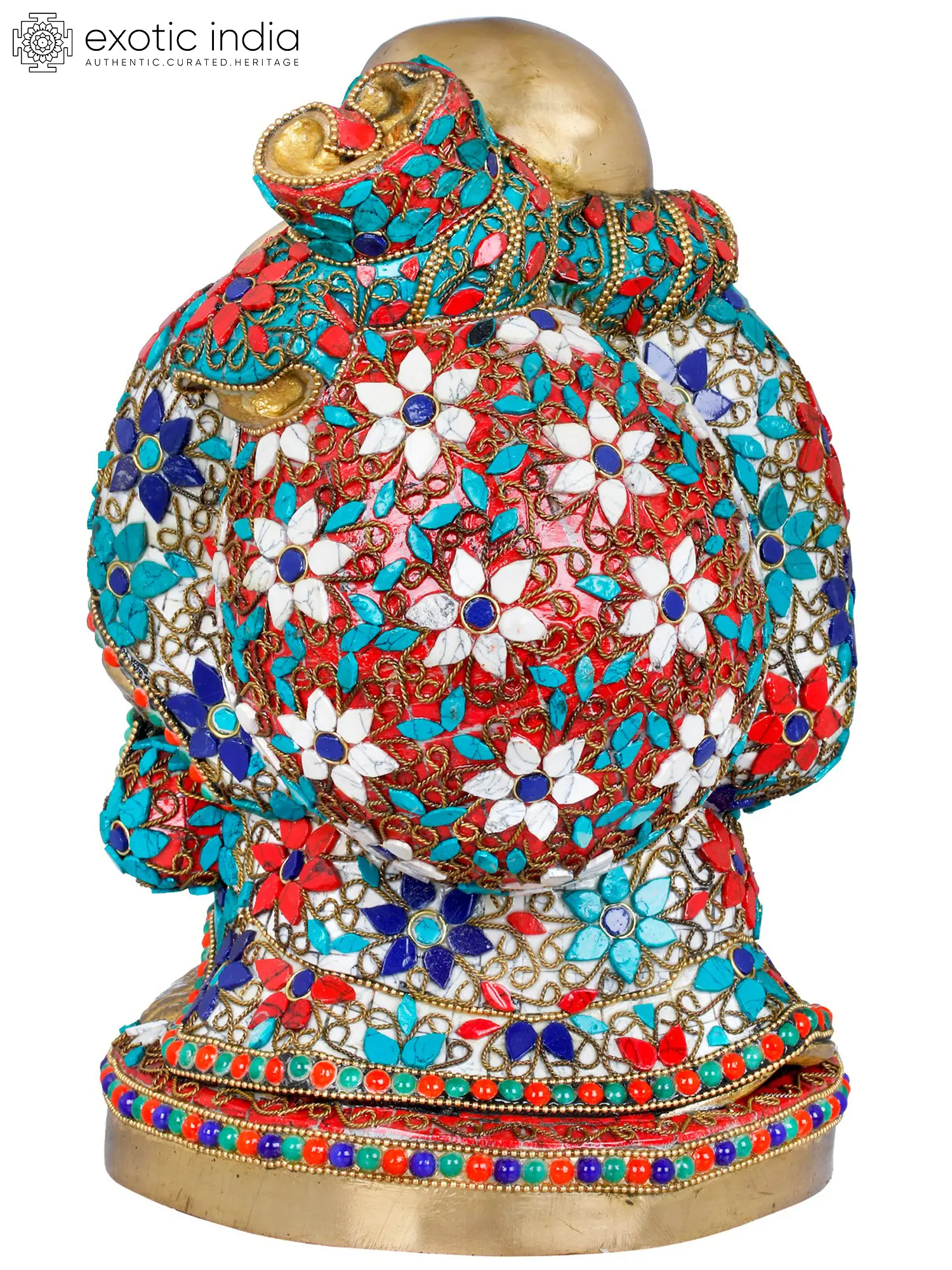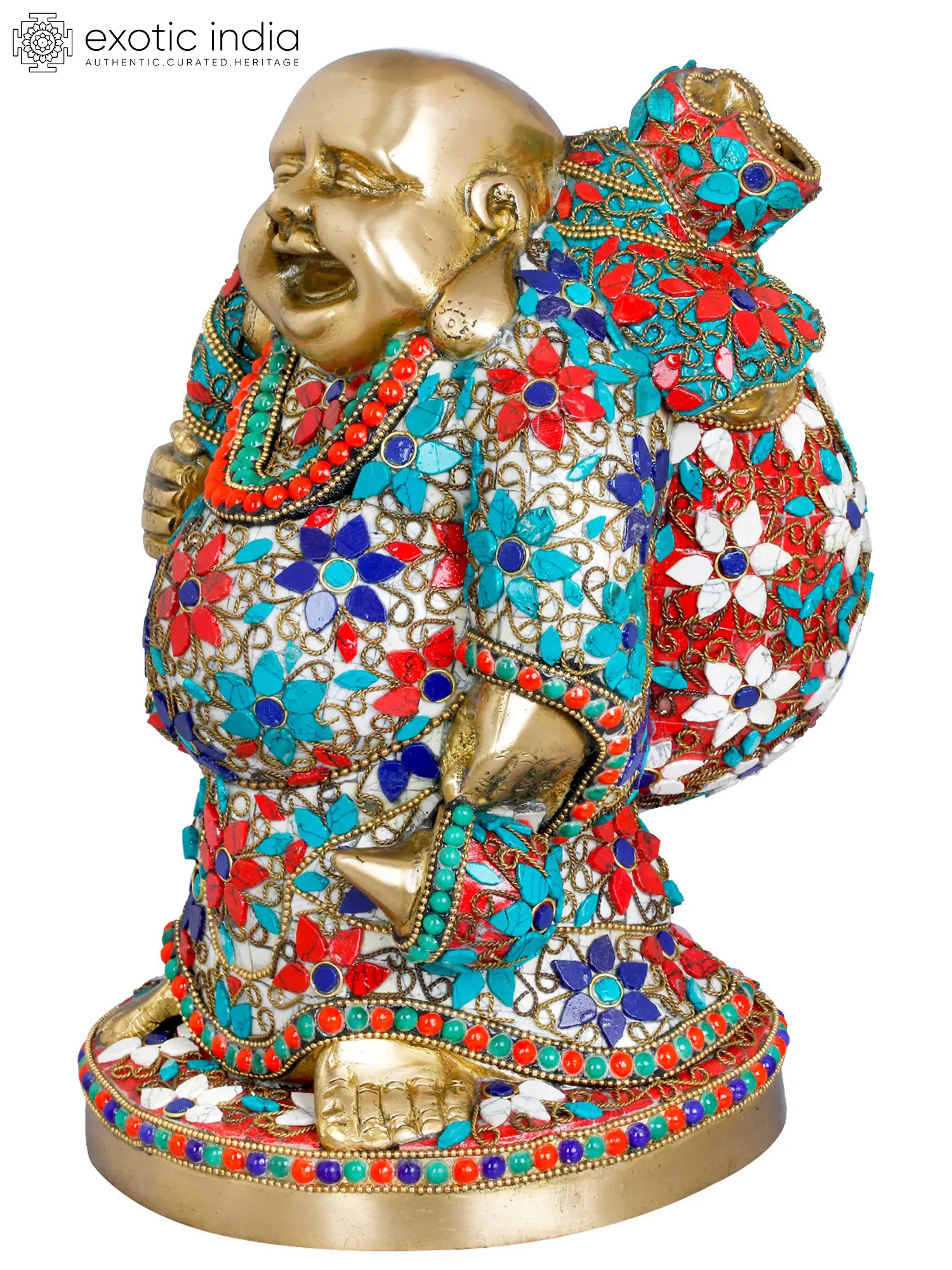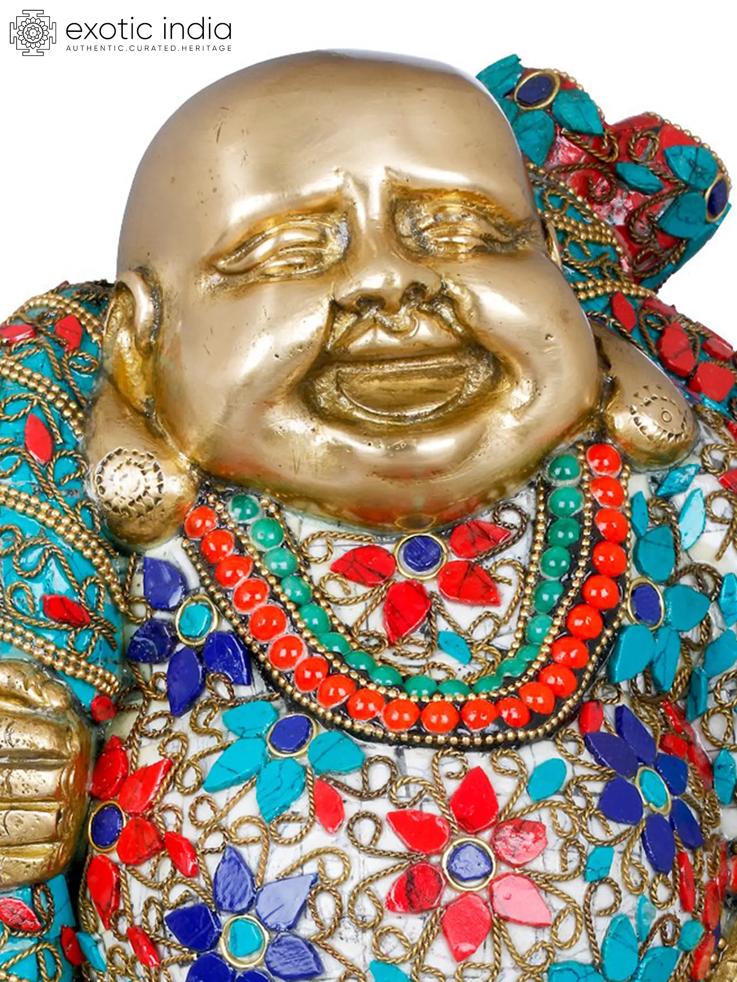 This magnificent statue showcases the pinnacle of Indian craftsmanship. The lustrous brass serves as the foundation, meticulously shaped to capture the iconic form of the Laughing Buddha. The real magic, however, lies in the intricate inlay work. Vibrant shards of turquoise, coral, lapis lazuli, and other precious stones are precisely set into the brass, forming intricate floral patterns and decorative borders. The contrast between the warm glow of the brass and the vivid hues of the inlaid stones creates a visually stunning effect that is both eye-catching and spiritually uplifting. This is a piece that speaks of dedication, skill, and an enduring artistic heritage, making it a treasured addition to any collection.