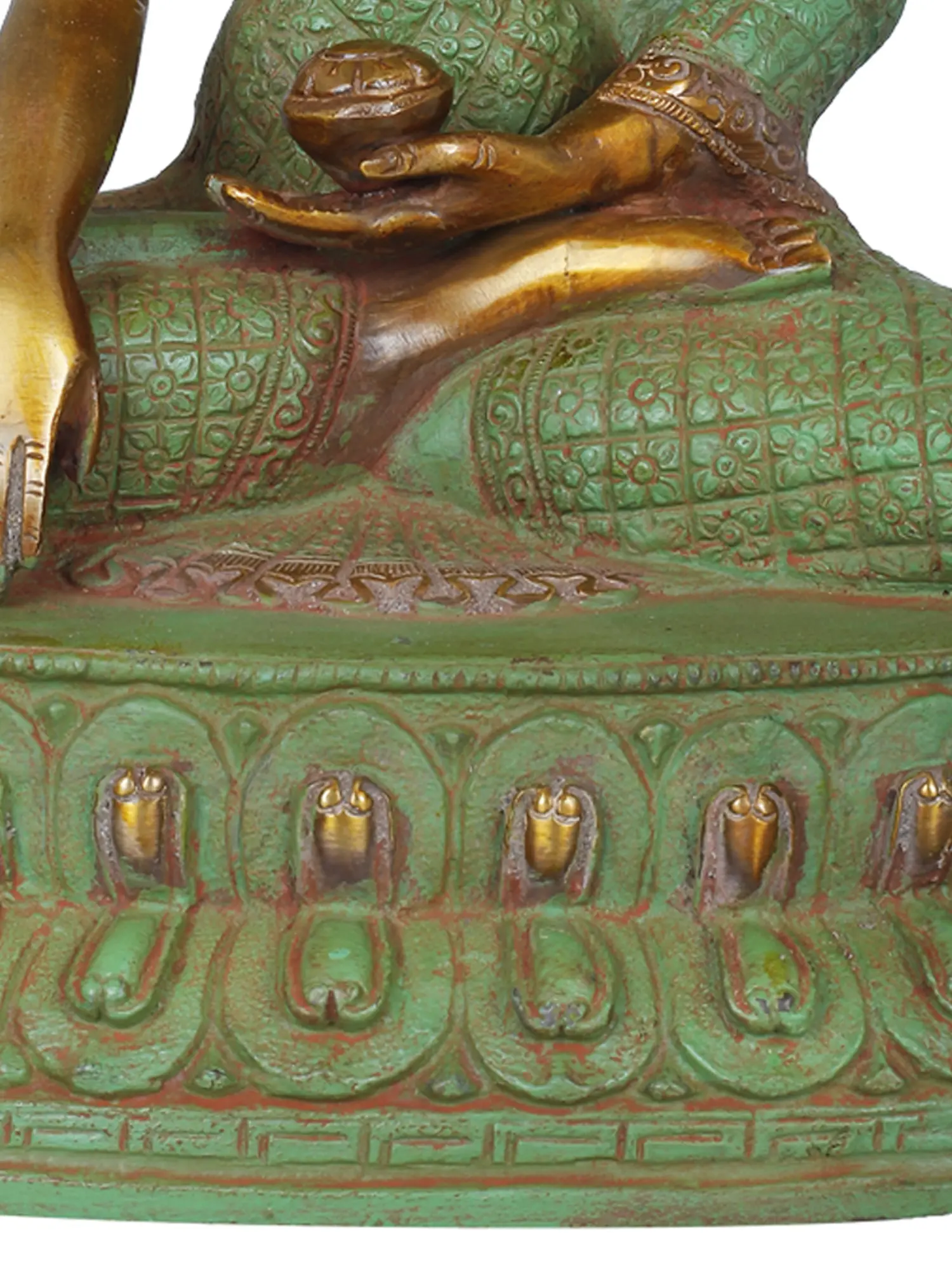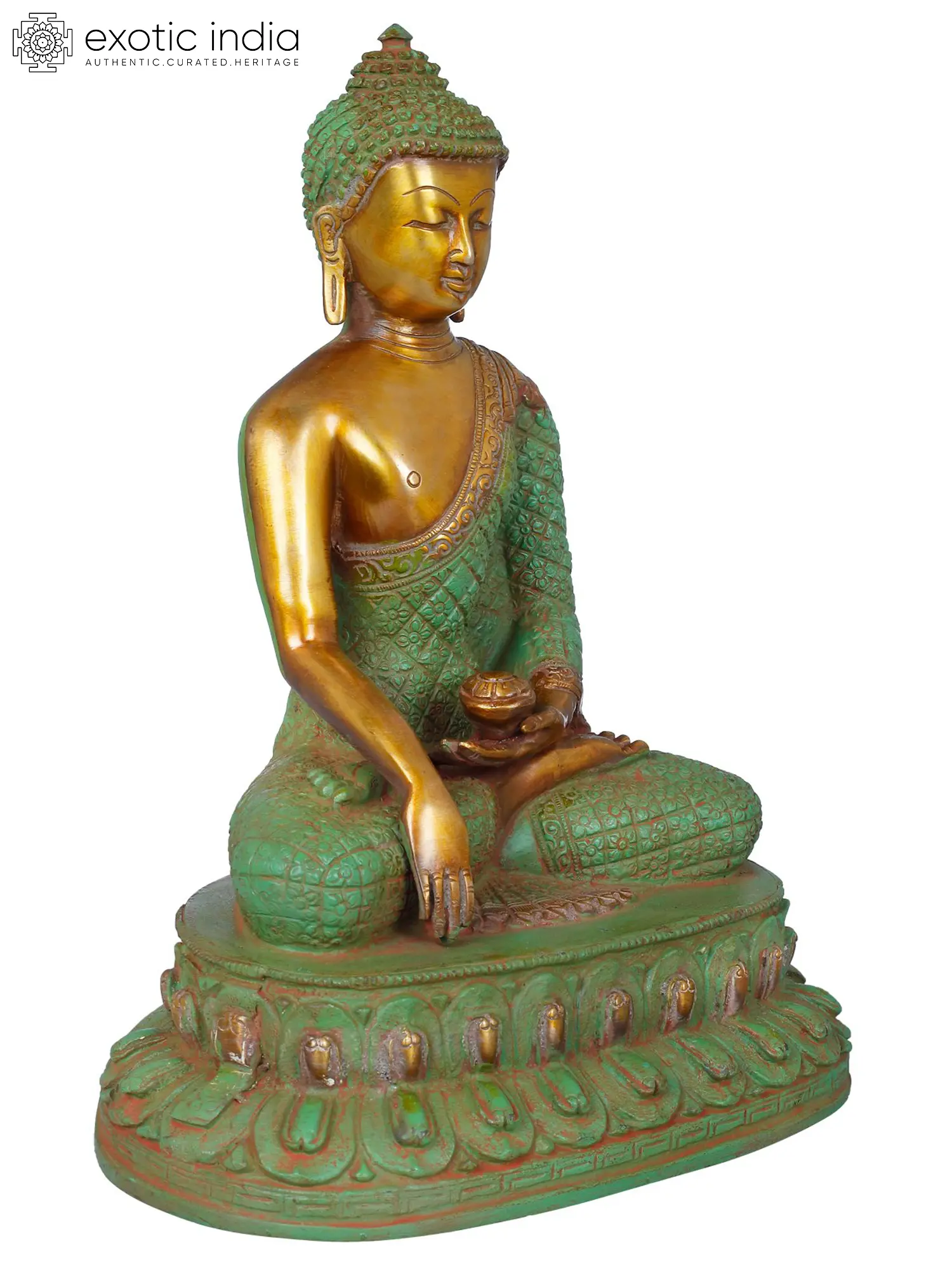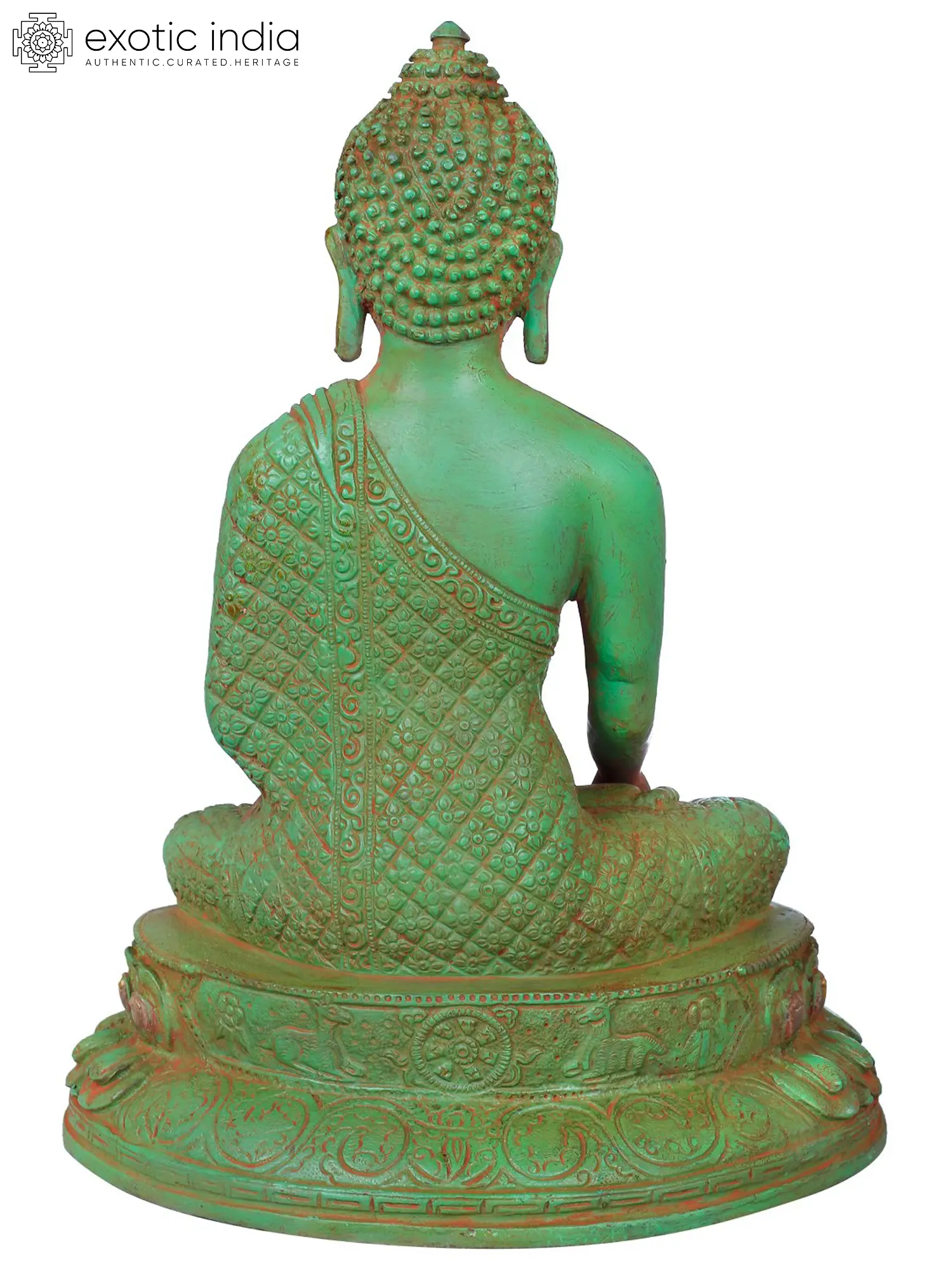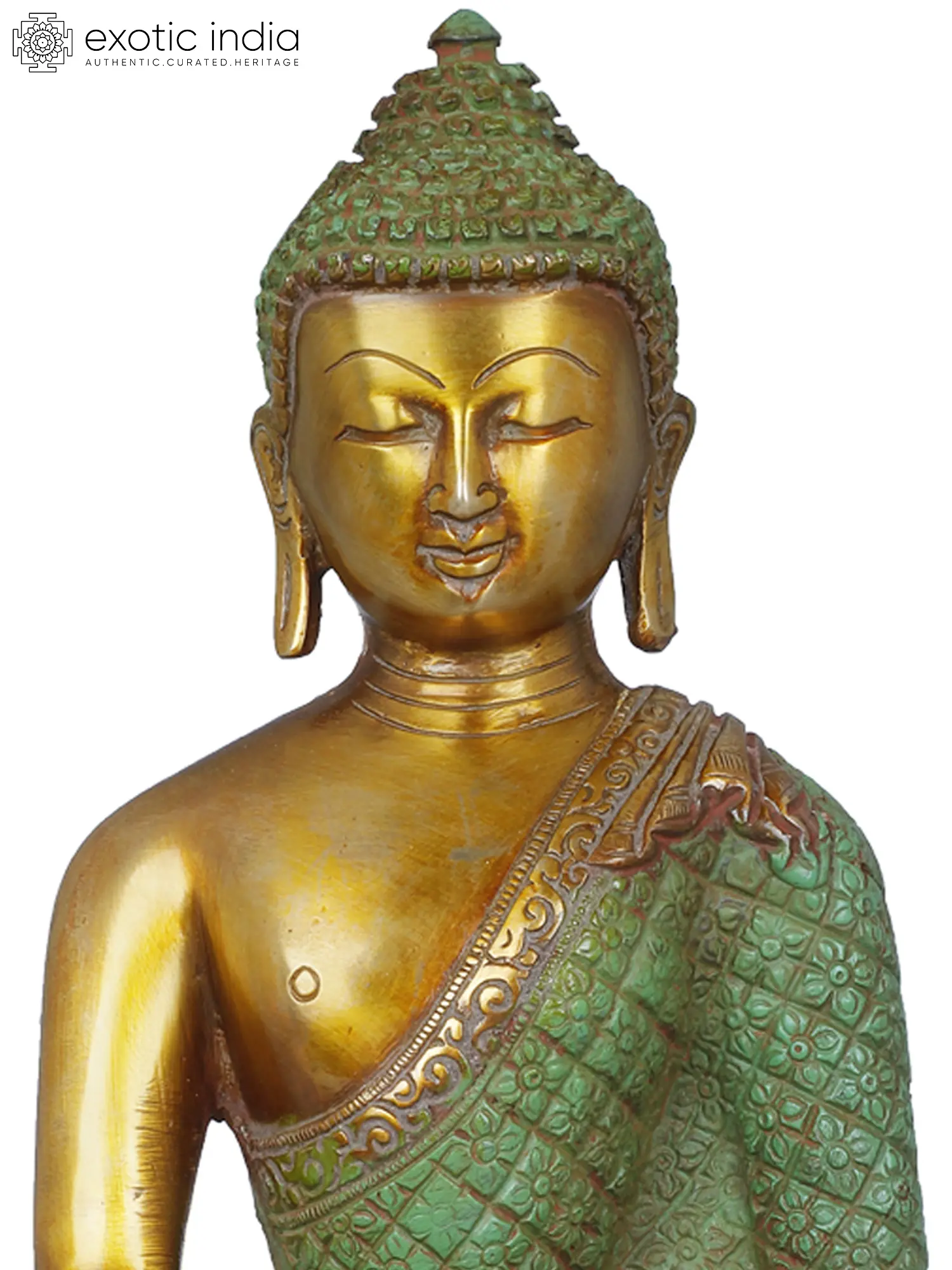 Made in solid brass, in this gorgeous figurine - Gautam Buddha or Buddha Shakyamuni is cast seated in a padmasana over his Lotus plinth in bhumisparsha mudra (calling mother earth in witnessing the dhyana). On his robe, is the pattern of Vishva-Vajra (symbolic of stability and protection), and his curls are tied into a high bun. Buddha whose wisdom is broad as the ocean and the spirit is full of great compassion - has no form but manifests himself in exquisiteness and leads us with his whole heart of compassion.