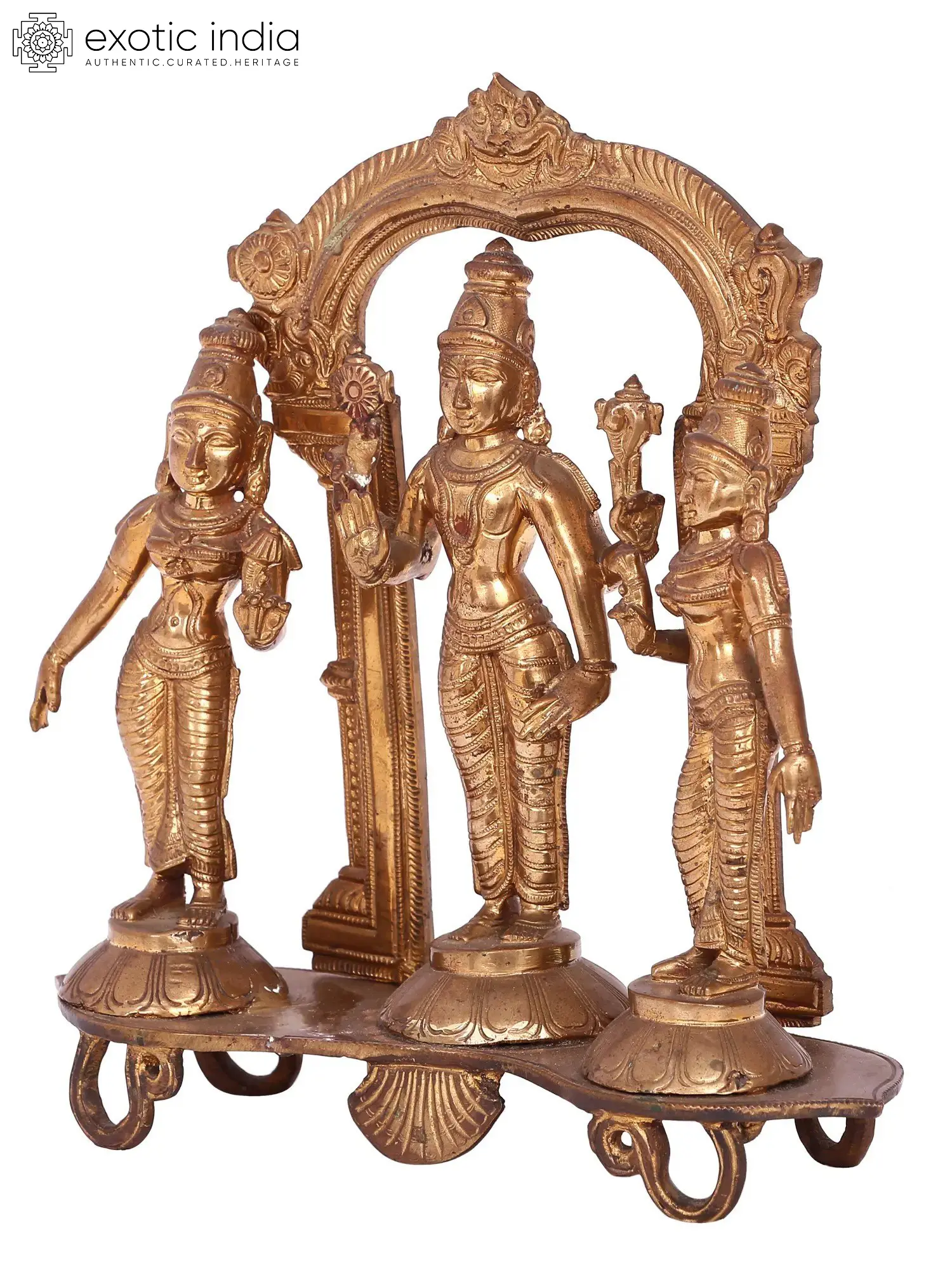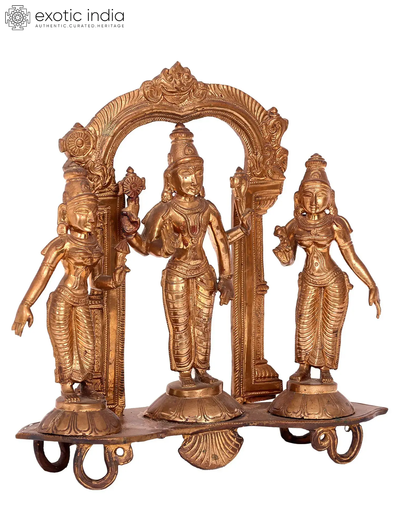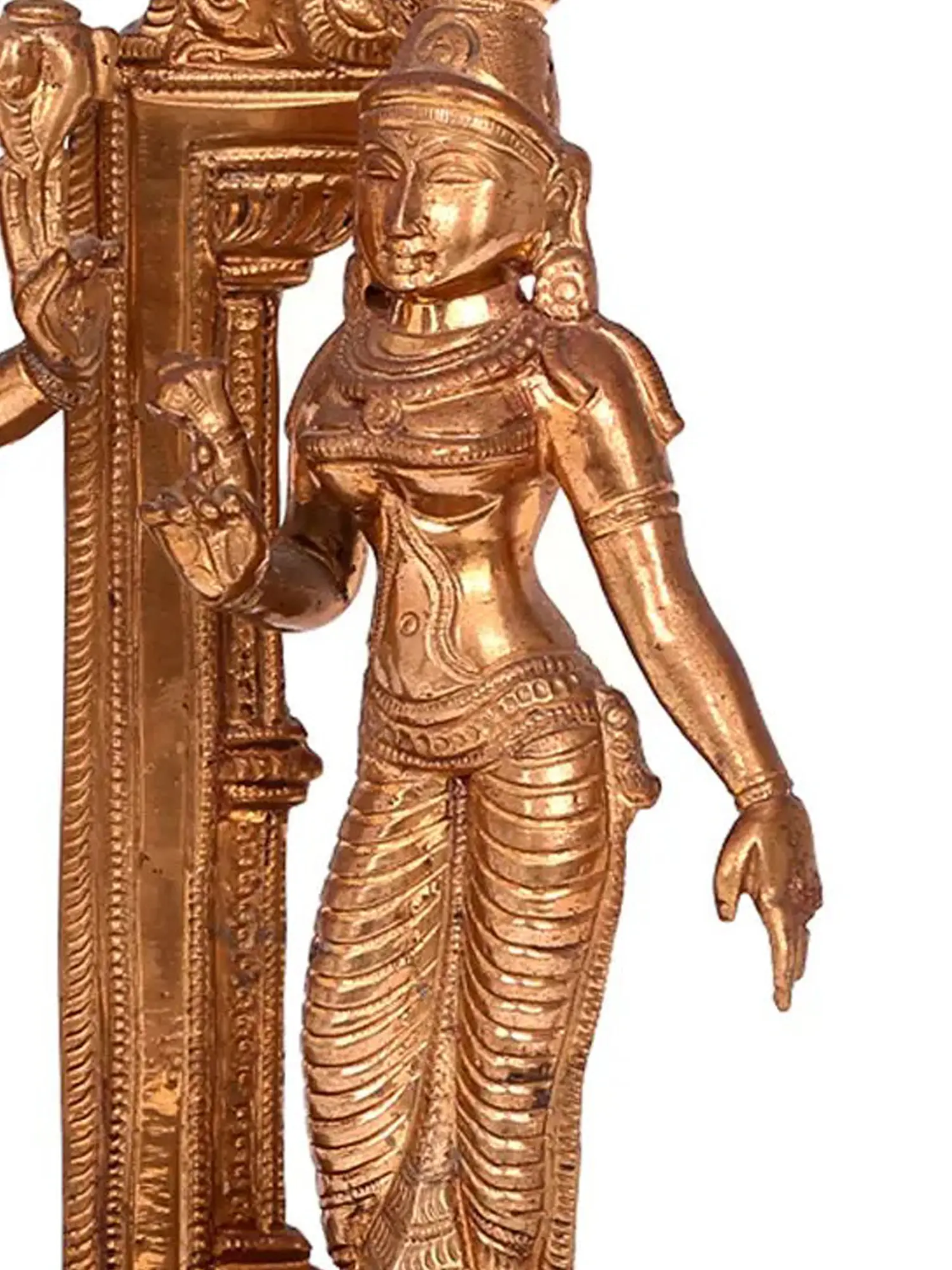 Beside him stand “Sridevi” and “Bhudevi”, his beloved consorts radiating grace. Holding lotus buds, they symbolise purity, prosperity and fertility. Together, this divine trio embodies the harmonious balance of preservation, prosperity, and protection. Crafted in Panchaloha bronze from “Swamimalai” using the ancient “Madhuchista Vidhana (Lost-Wax) technique”, this artwork encapsulates cosmic balance, benevolence, and the eternal dance of creation.