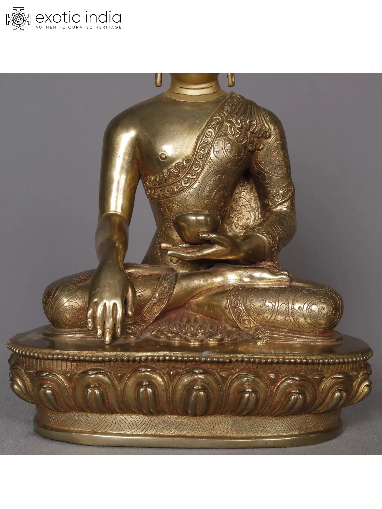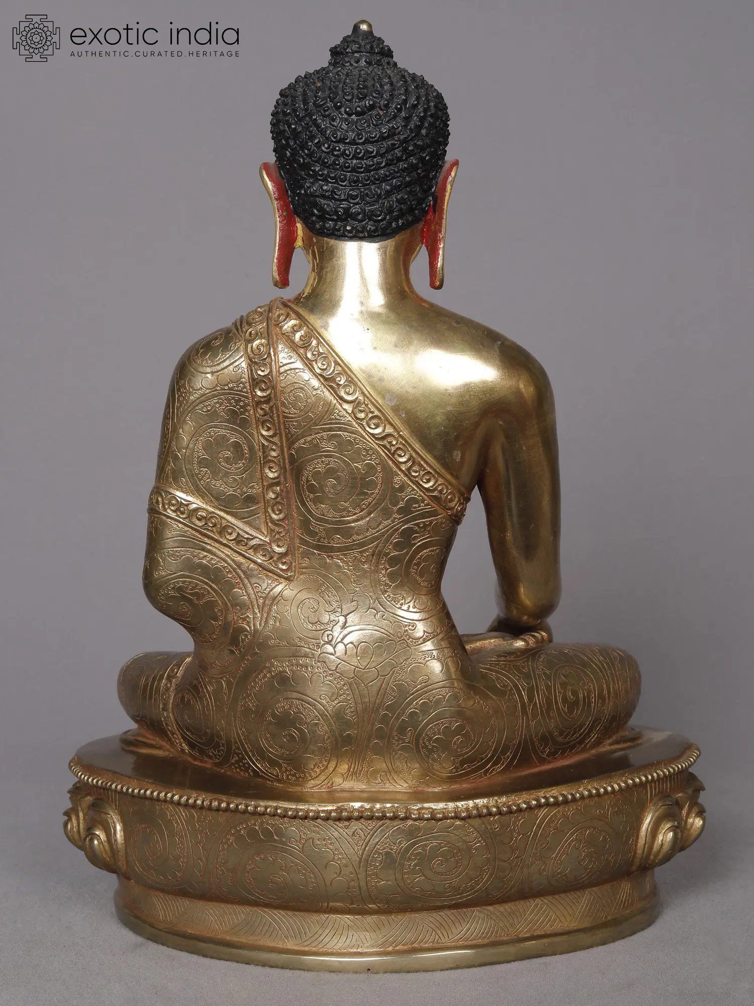 The depiction of Buddha portrays him seated upon a double lotus pedestal. His right-hand cradles a pot, while his left rests in the bhumisparsha mudra, symbolizing his encounter with Mara, the temptress. By touching the earth, he invoked the Earth Goddess to bear witness to his unwavering meditation and asceticism. The vajra, representing the Vajrayana sect, is positioned nearby. Draped in a simple monastic robe, or sanghati, he exudes an aura of profound spiritual serenity.