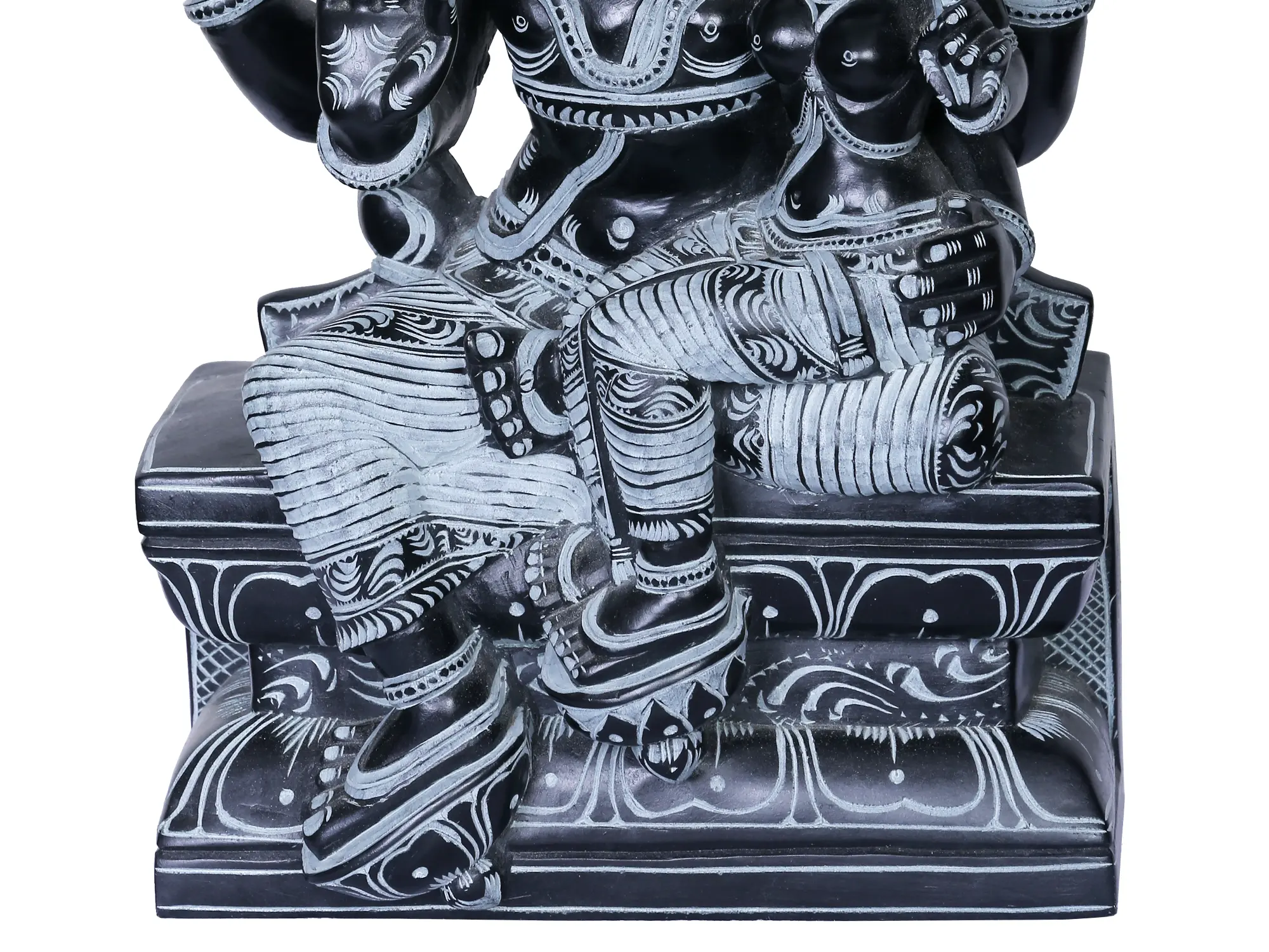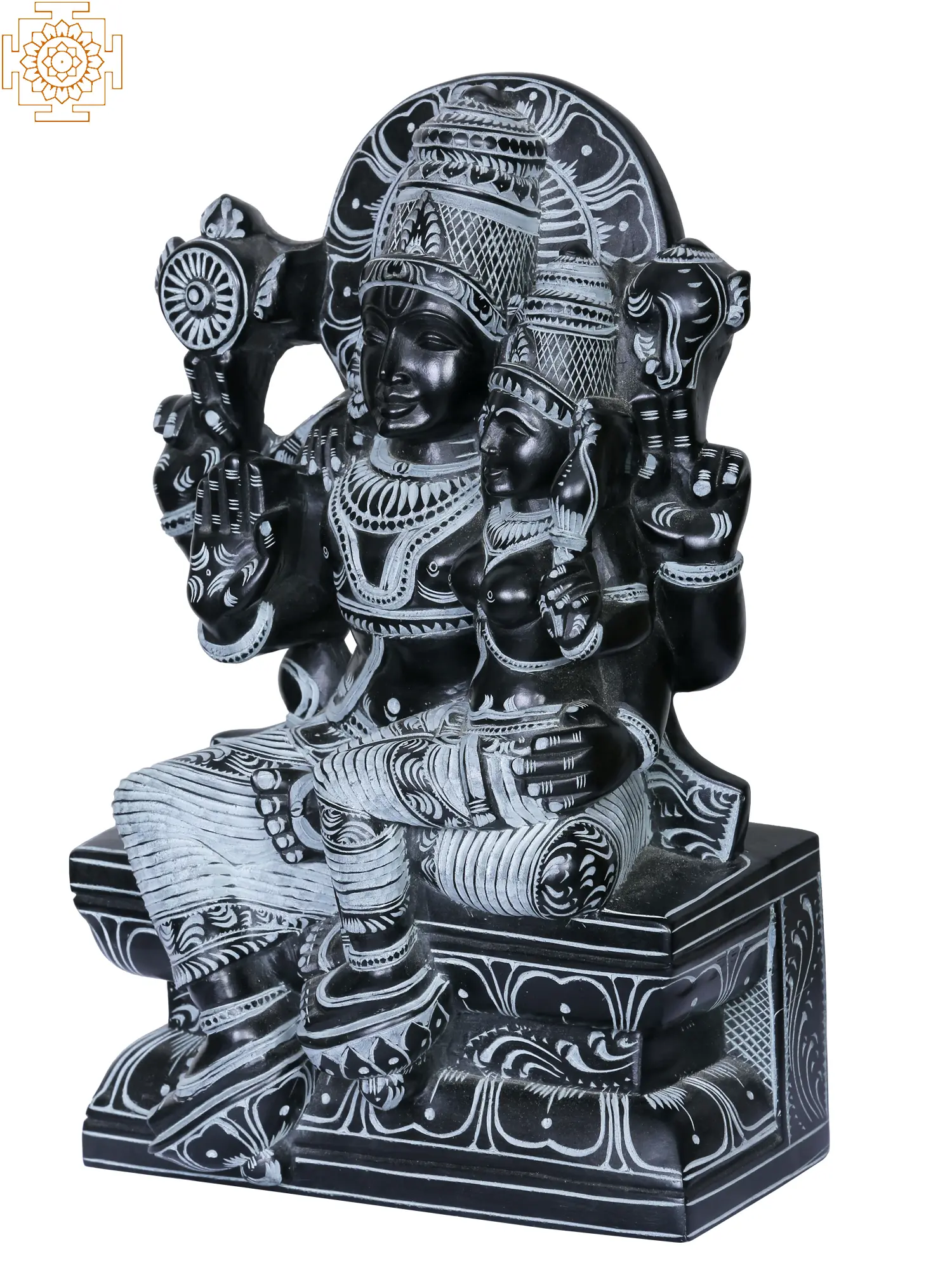 This exquisite stone sculpture captures the serene and benevolent presence of Lord Vishnu, the preserver of the universe, seated with his divine consort, Goddess Lakshmi, the embodiment of wealth, prosperity, and auspiciousness. Crafted with exceptional skill by artisans from the ancient sculptural tradition of South India, this piece is more than just a decorative item; it is a testament to centuries of devotion and artistic mastery. The dark, lustrous stone, likely sourced from the renowned workshops of Mahabalipuram, provides a dramatic canvas for the intricate carvings that adorn every inch of this divine tableau. Lord Vishnu, with his characteristic multiple arms, holds his divine attributes, symbolizing his vast powers and cosmic role. In one hand, he gracefully displays the Sudarshana Chakra, his celestial discus, representing the power of time and cosmic order. The other hands are raised in gestures of blessing and protection, conveying his ever-watchful gaze over creation. His serene expression and dignified posture radiate peace and assurance. Seated beside him, Goddess Lakshmi is depicted with grace and tenderness. Her presence complements Vishnu's, representing the harmonious balance of masculine and feminine energies, the material and the spiritual, the active and the nurturing. Together, they form a powerful symbol of divine unity and the abundance that arises from it. The delicate features and graceful adornments of Lakshmi further enhance the overall aura of divine beauty and serenity.