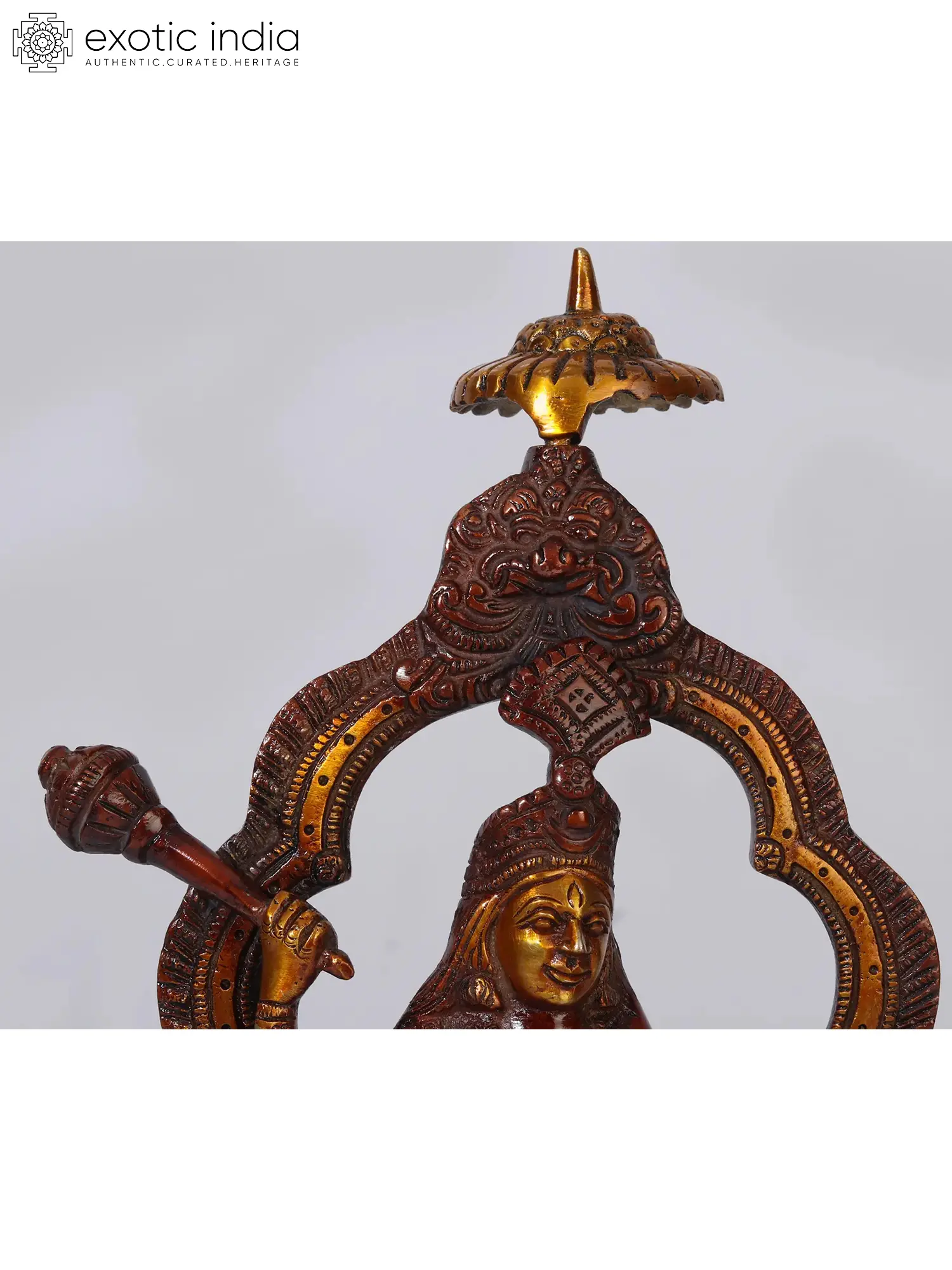 Crafted with devotion, this brass depiction of Mahavidya Bagalamukhi, one of the ten Tantrik deities known as the Mahavidyas, radiates the spiritual power of transformation. She is revered as the paralyzer of evil and ignorance, her right hand wielding a club ready to shatter misconceptions, and her left hand pulling at the demon's tongue, symbolizing the silencing of foes and the cessation of misguidance. Adorned in a radiant golden hue, she sits majestically on a throne, encompassing the ultimate knowledge and wisdom. This statue is a tribute to her divine role as the harbinger of truth and the vanquisher of delusions.