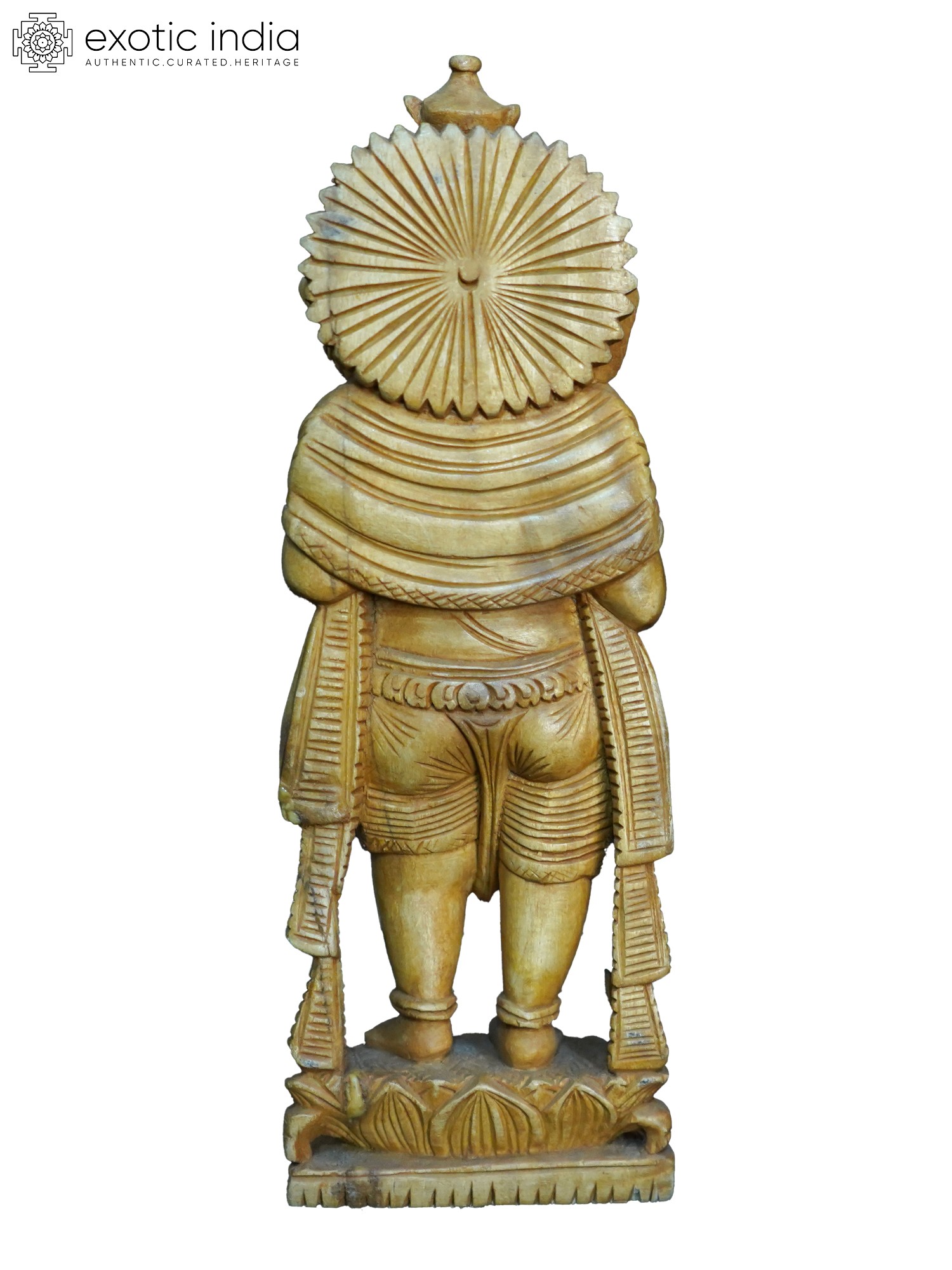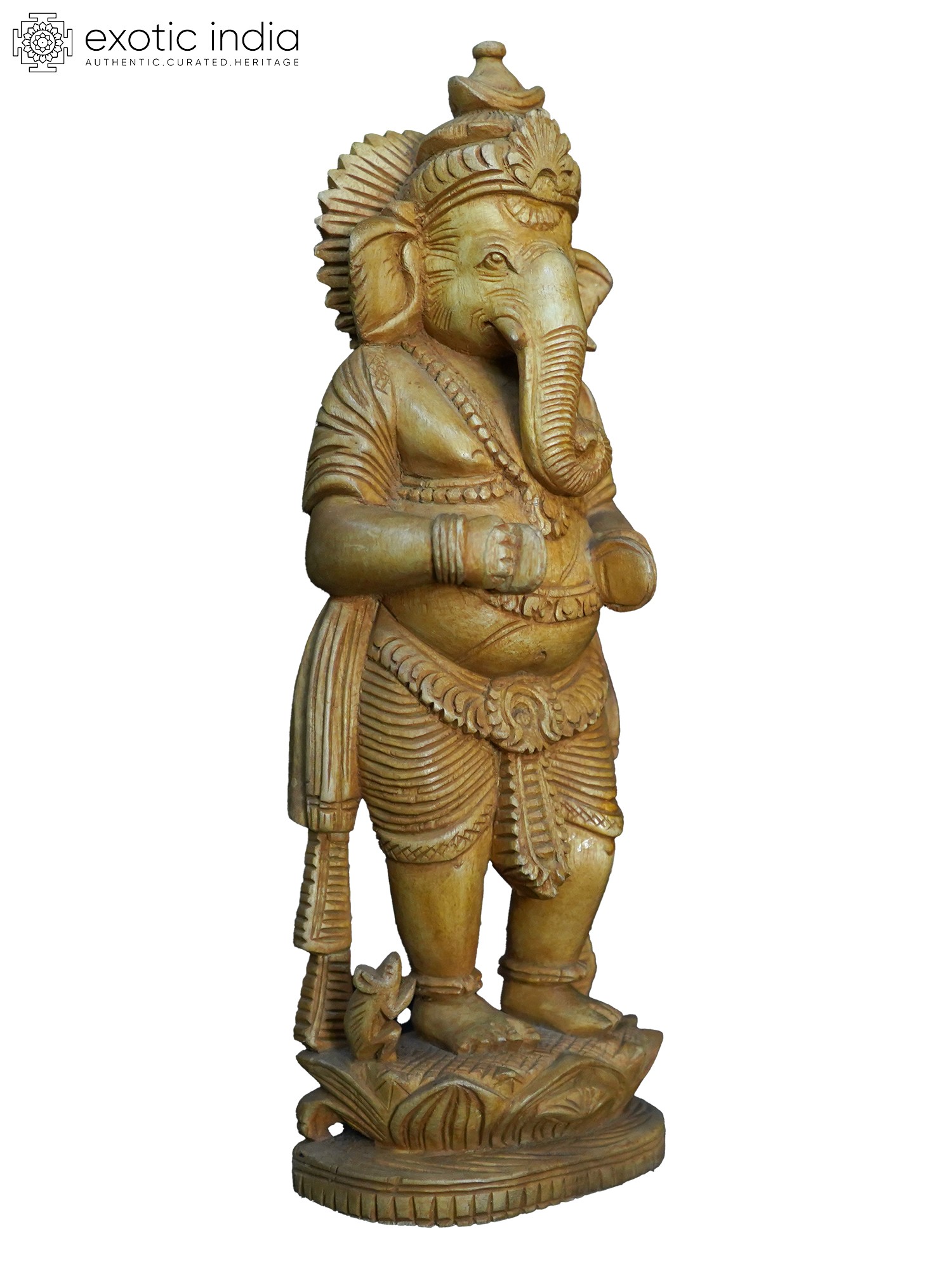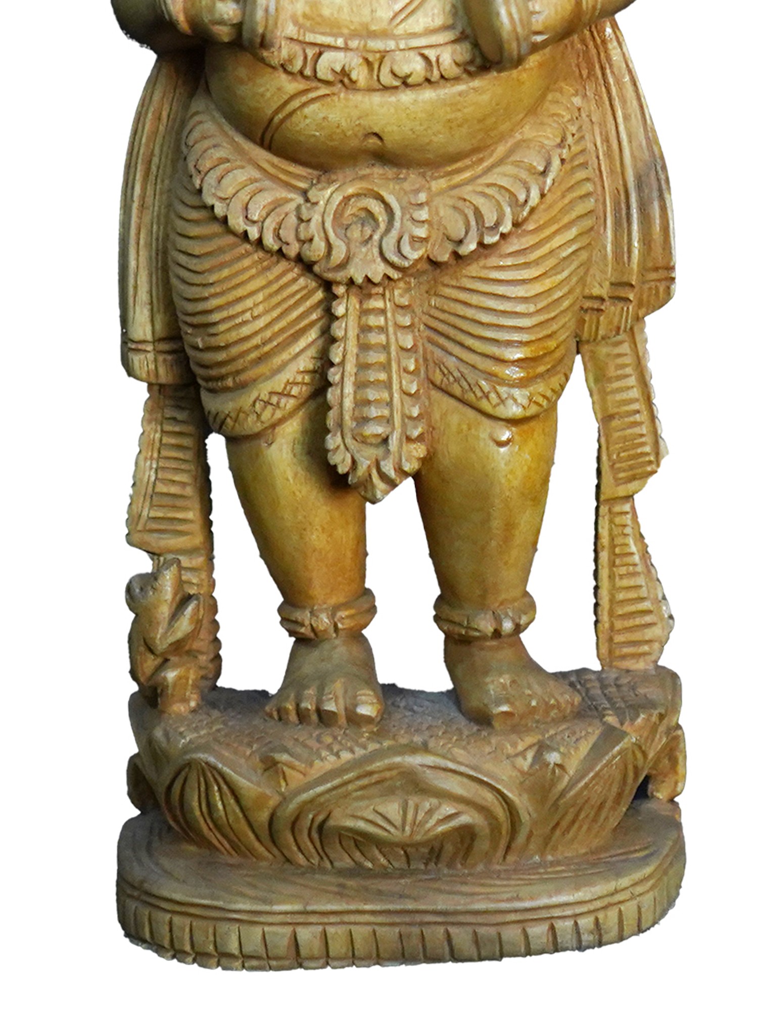 The iconic elephant head, a key feature of Ganesha, symbolizes wisdom, understanding, and intellect. His large ears are said to listen to the prayers of devotees, while his trunk represents adaptability and efficiency. This particular depiction captures Ganesha in a standing posture, exuding confidence and readiness to bestow blessings upon those who seek his guidance. His hands are positioned as if he is playing a musical instrument, hinting at his joyful nature and his association with arts and culture. Notice his clothing, with its intricate layers and textures which are captured in the wood.