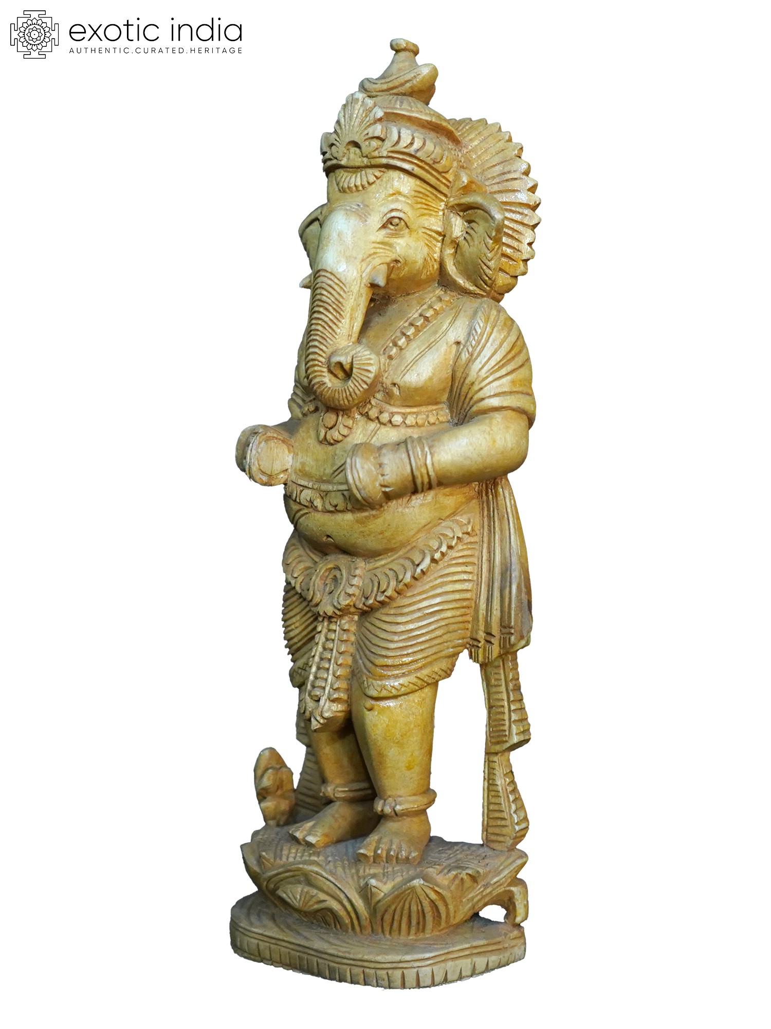 The hand-carved nature of this sculpture means that each piece is unique. The fine details of the carving, from the folds in Ganesha's garments to the intricate designs on his crown, showcase the skill and artistry of the craftsman. The statue is ideal for placement on altars, shelves, or desks, serving as a constant reminder of Ganesha's benevolent presence and the potential for success and harmony in all aspects of life.