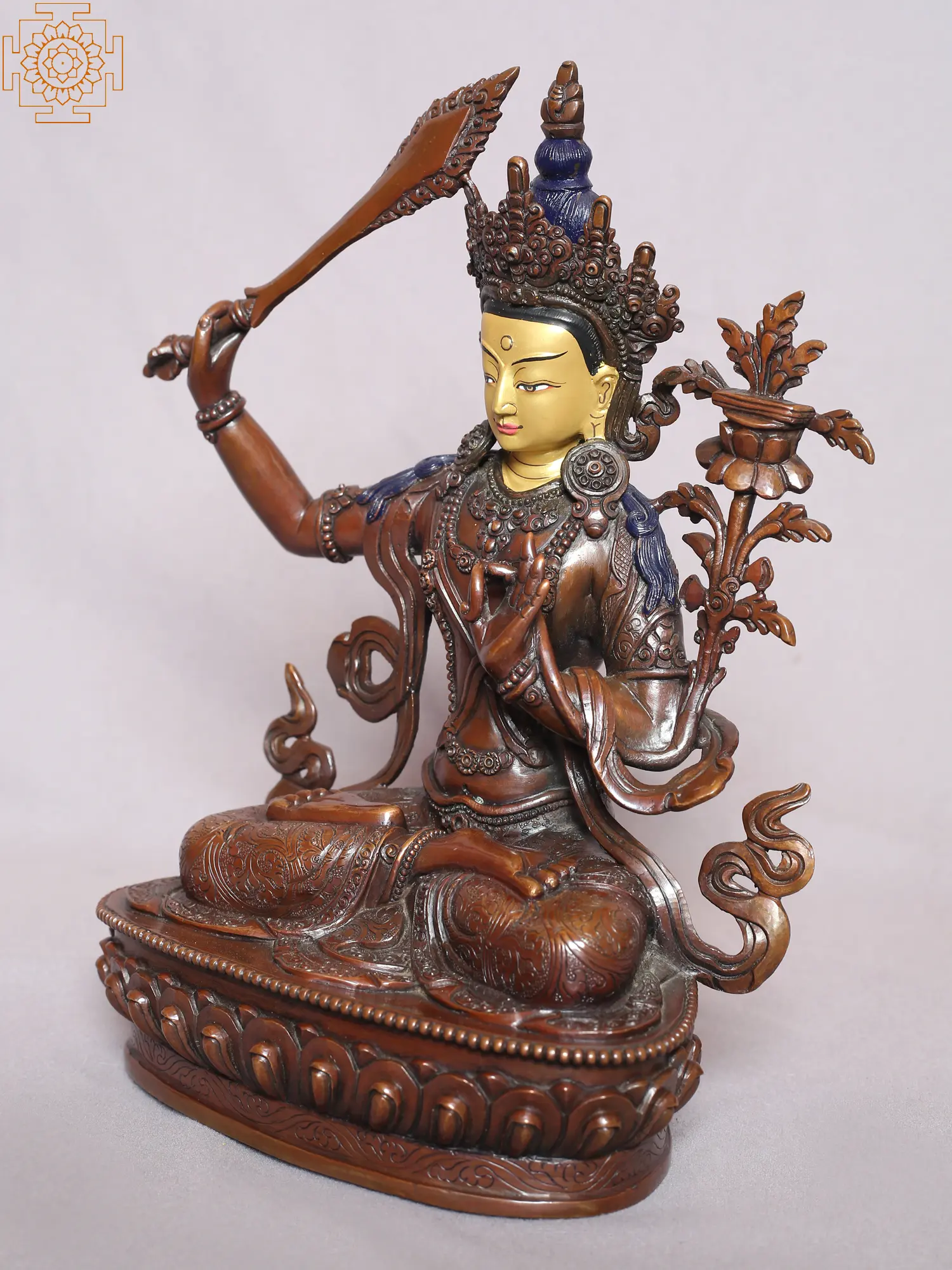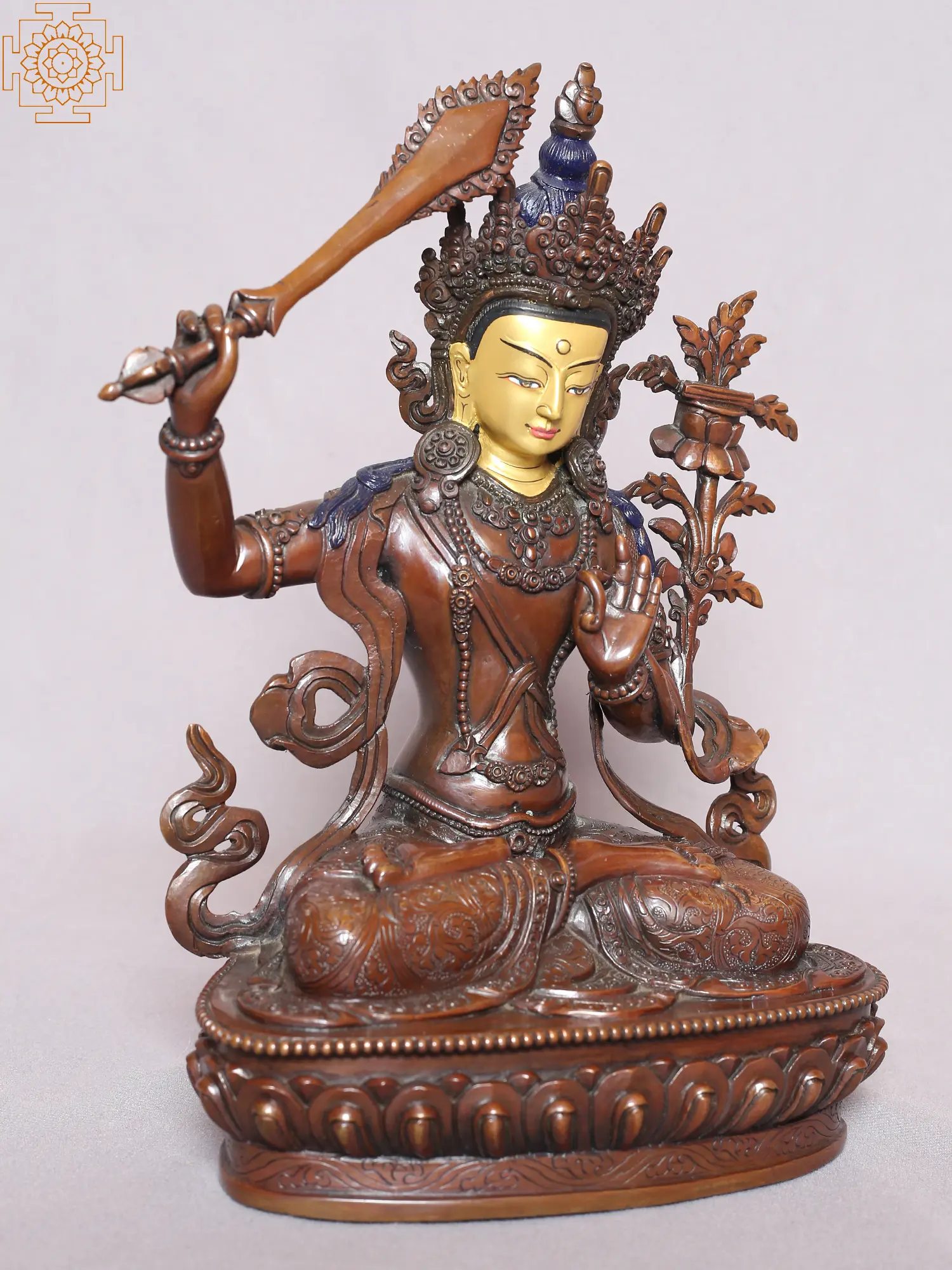 A layer of gold on the countenance of Manjushri gives a divine contrast to the copper statute while highlighting the serenity on the face of the Bodhisattva which removes negativity and fear from the heart of his devotee.