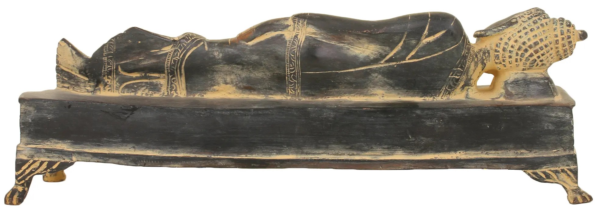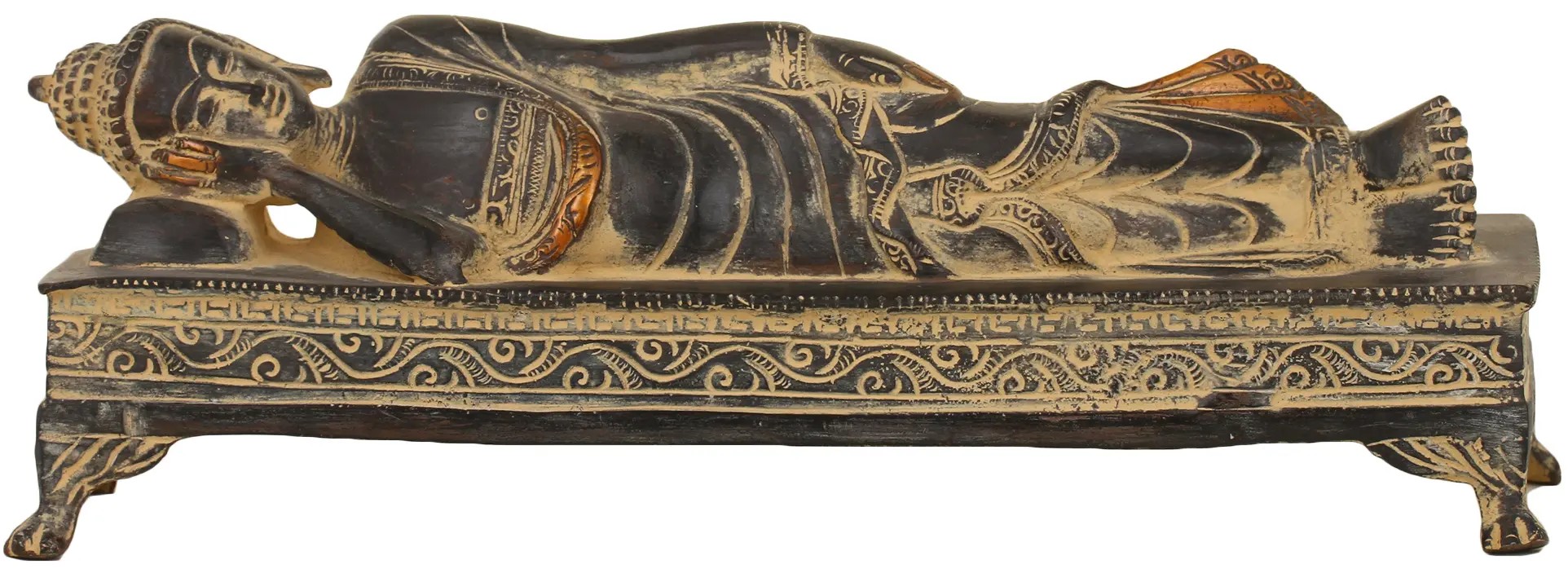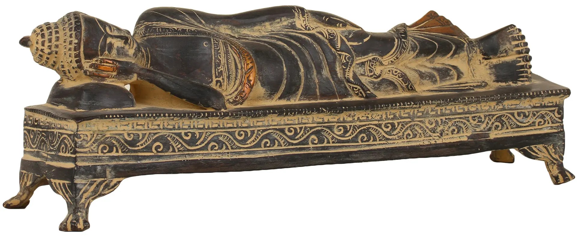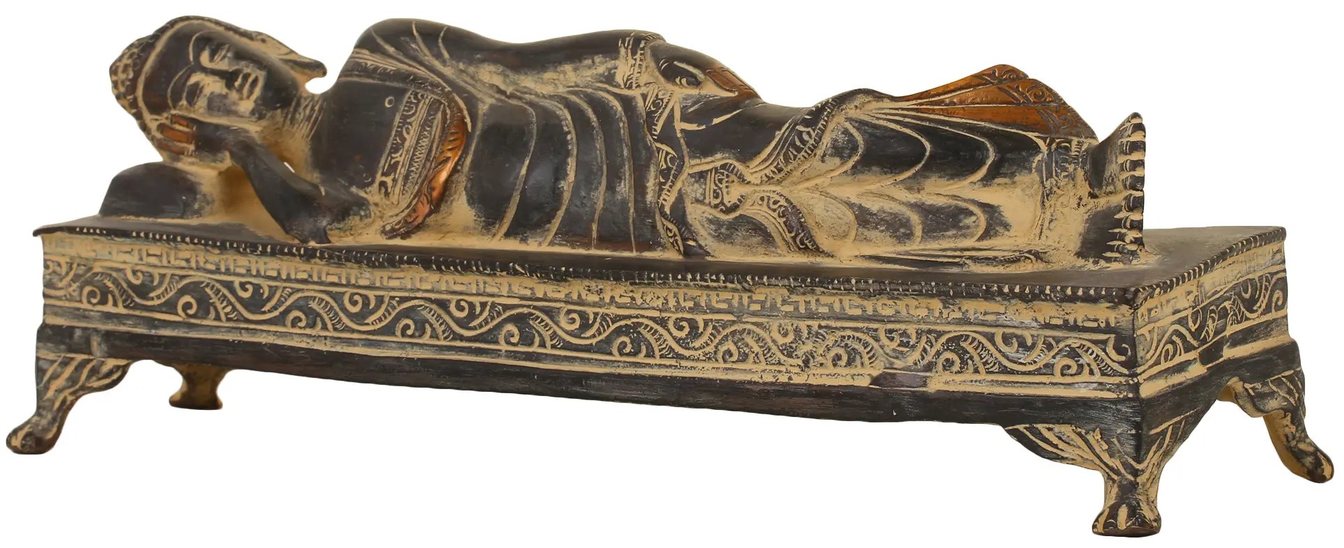 The essence of ultimate liberation within the Brass Parinirvana Buddha. The Parinirvana, representing Buddha's ultimate freedom from the cycle of birth and death, is a sign of enlightenment. Use this sculpture to constantly remind you of the transience of life and the eternal nature of the soul. Seek refuge in the path to inner calm, as did Buddha, who attained Nirvana through deep meditation. Receive Parinirvana Buddha's energy, understanding that within his idyllic posture is the eternal wisdom of transcending suffering and gaining ultimate liberation.